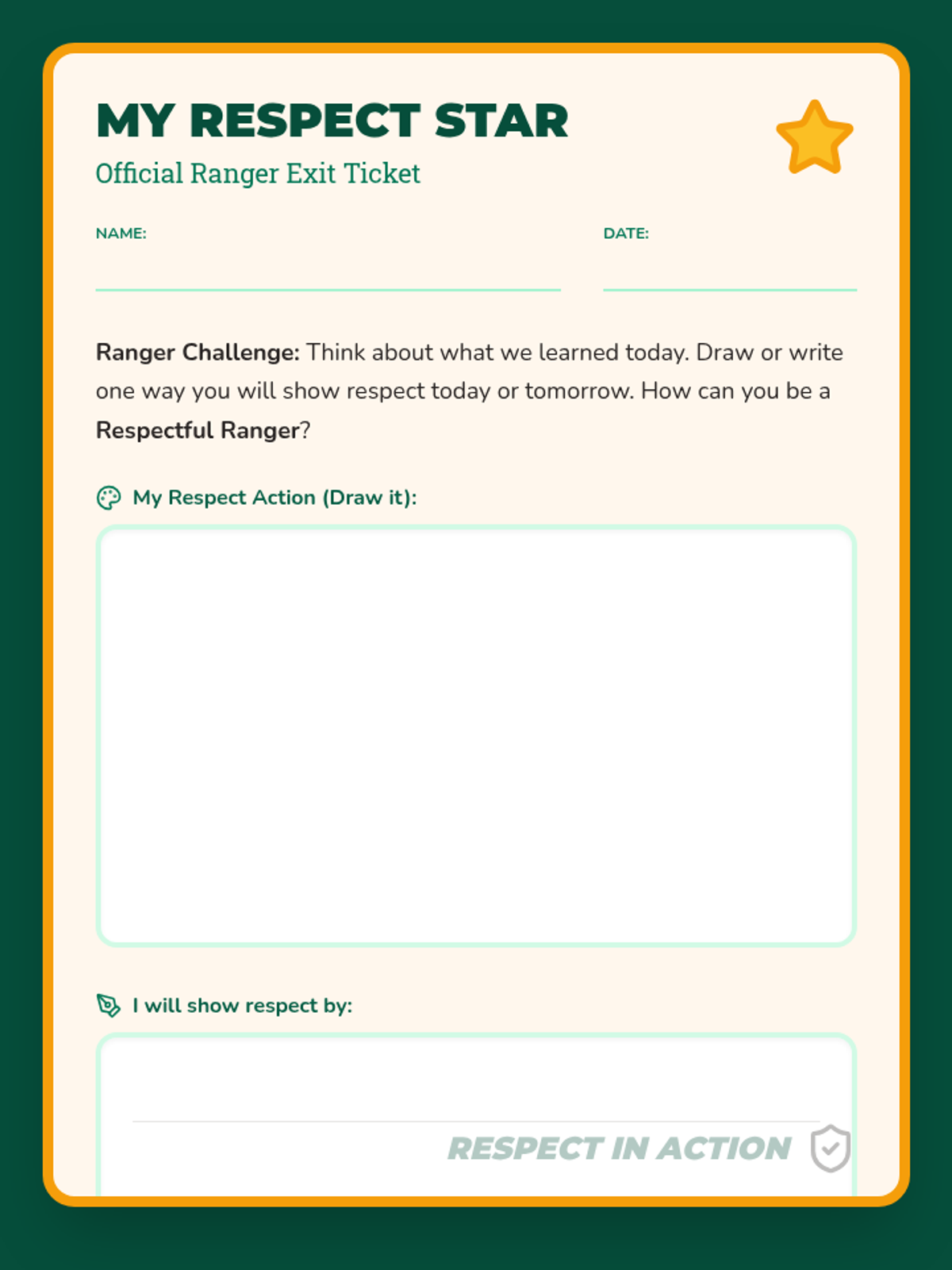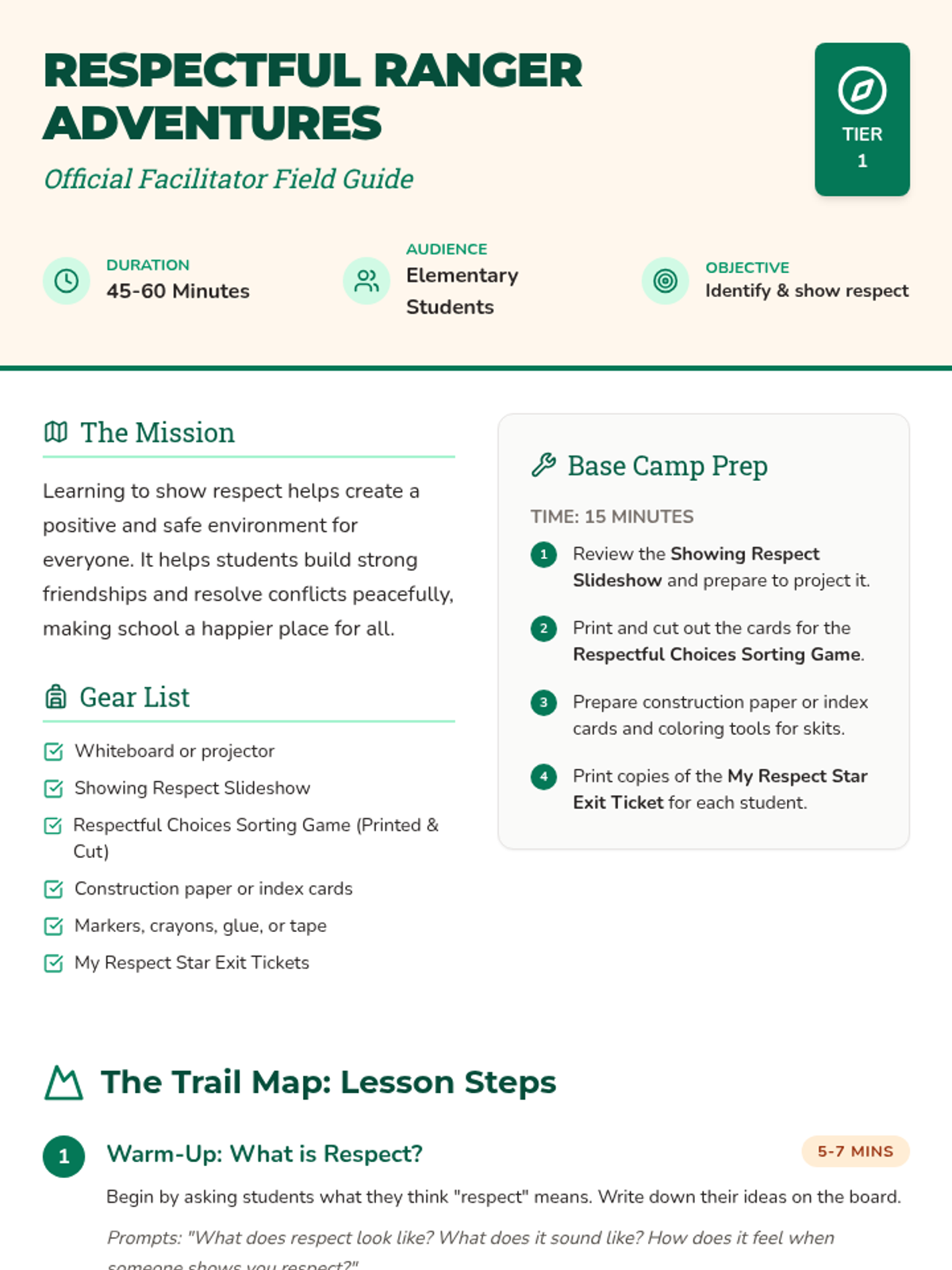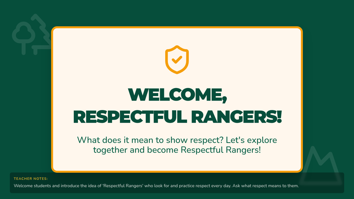 An interactive lesson for elementary students to learn and practice respect in different environments, using the 'Respectful Ranger' theme to encourage positive behavior.