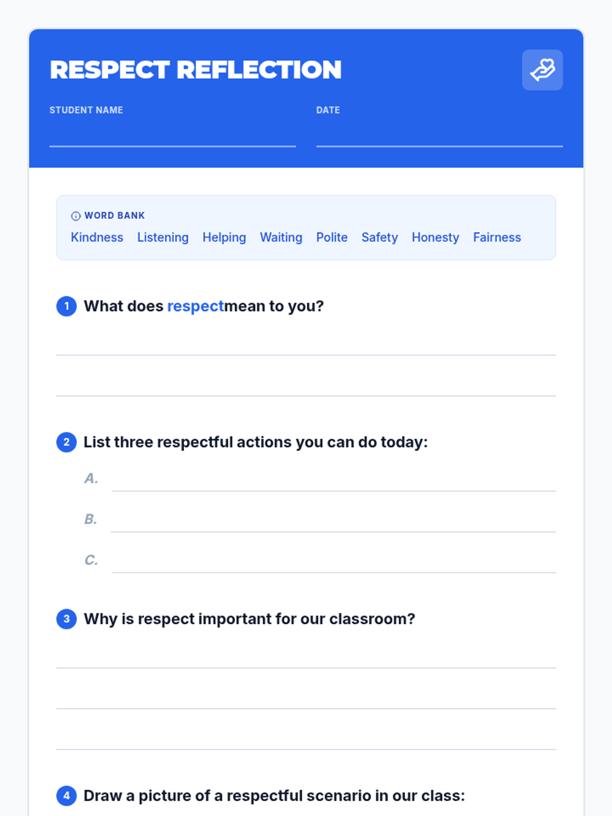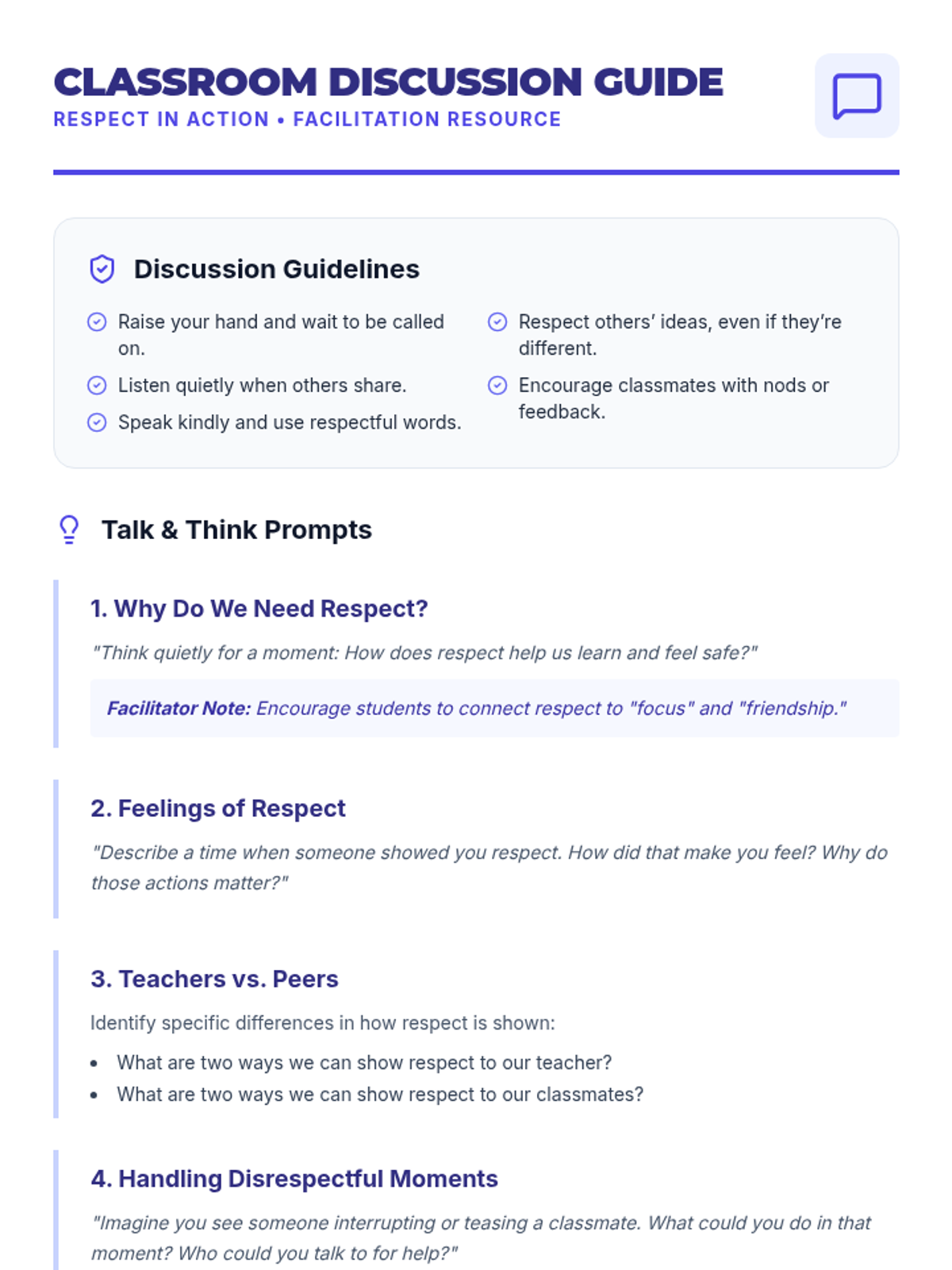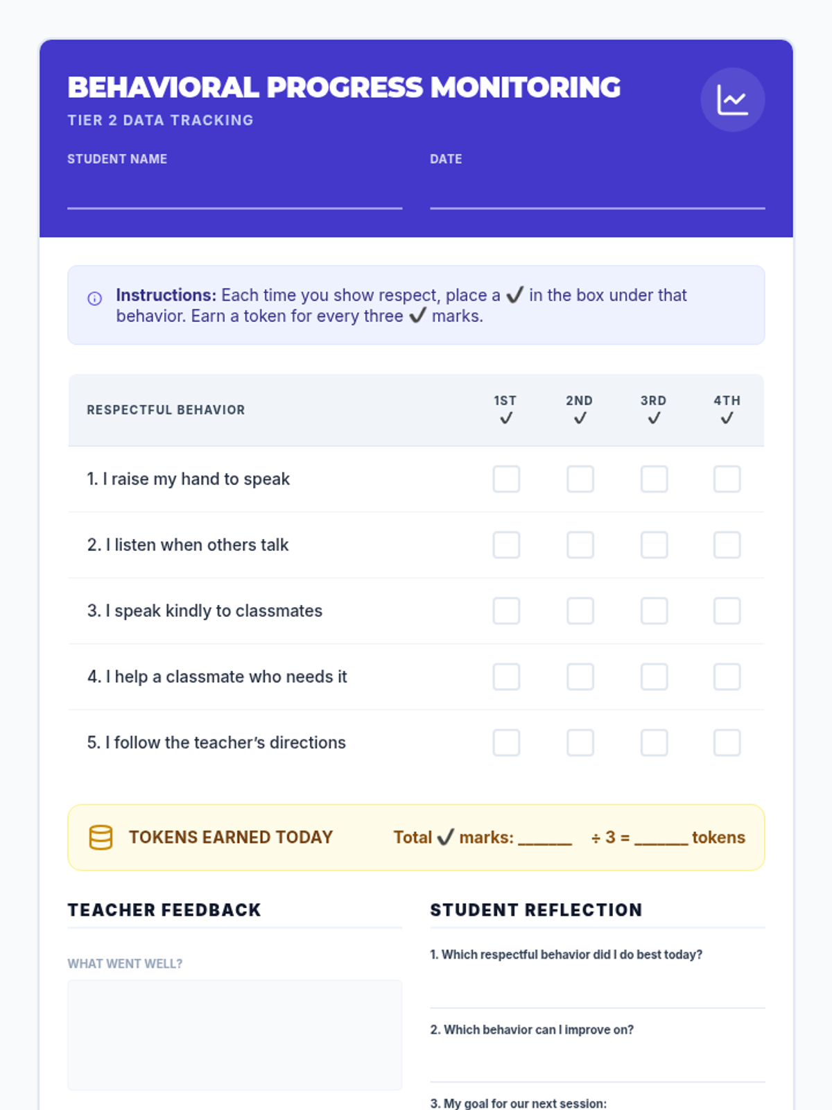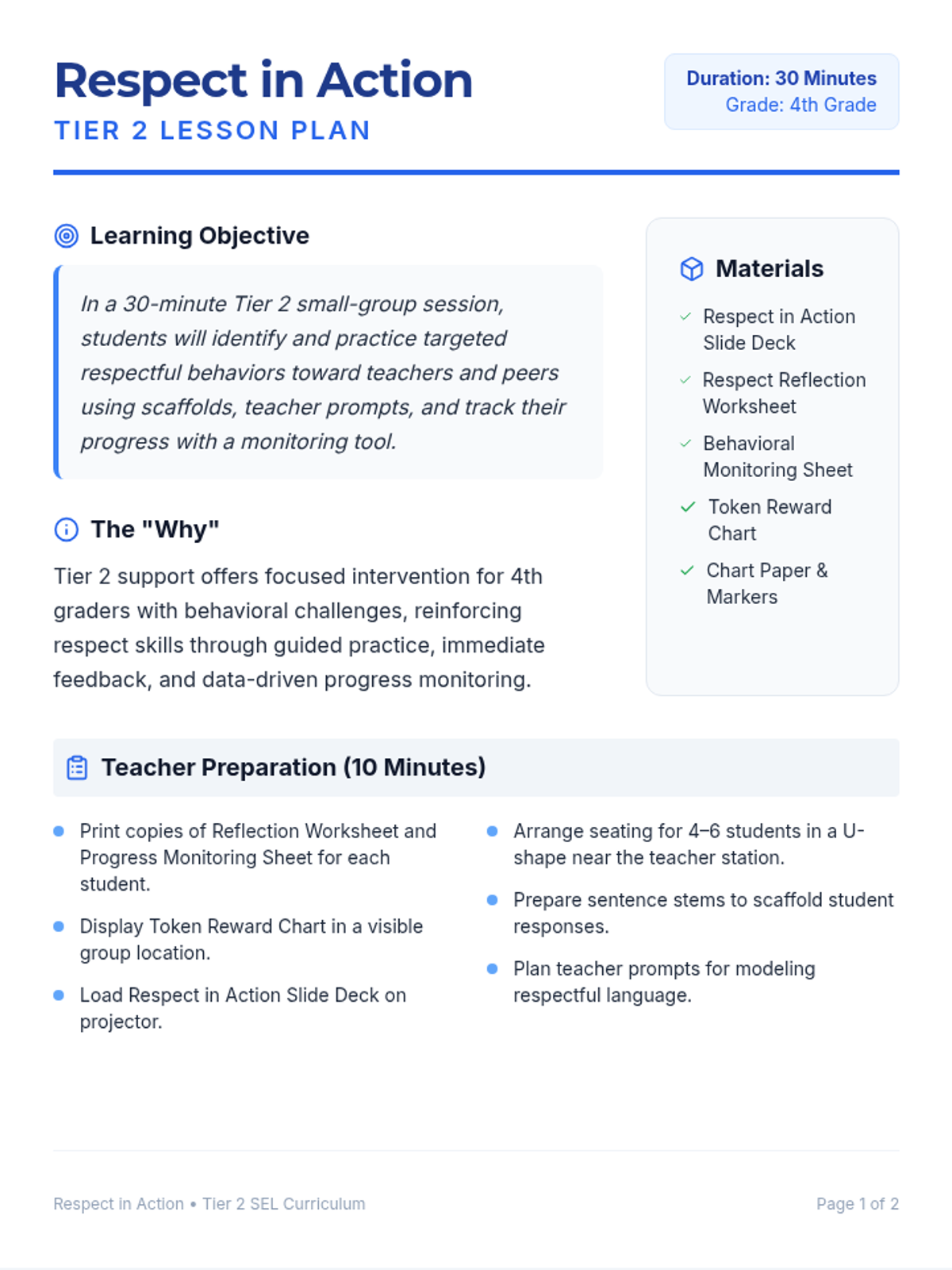 A 30-minute Tier 2 social-emotional learning lesson for 4th graders to identify, practice, and monitor respectful behaviors toward teachers and peers.