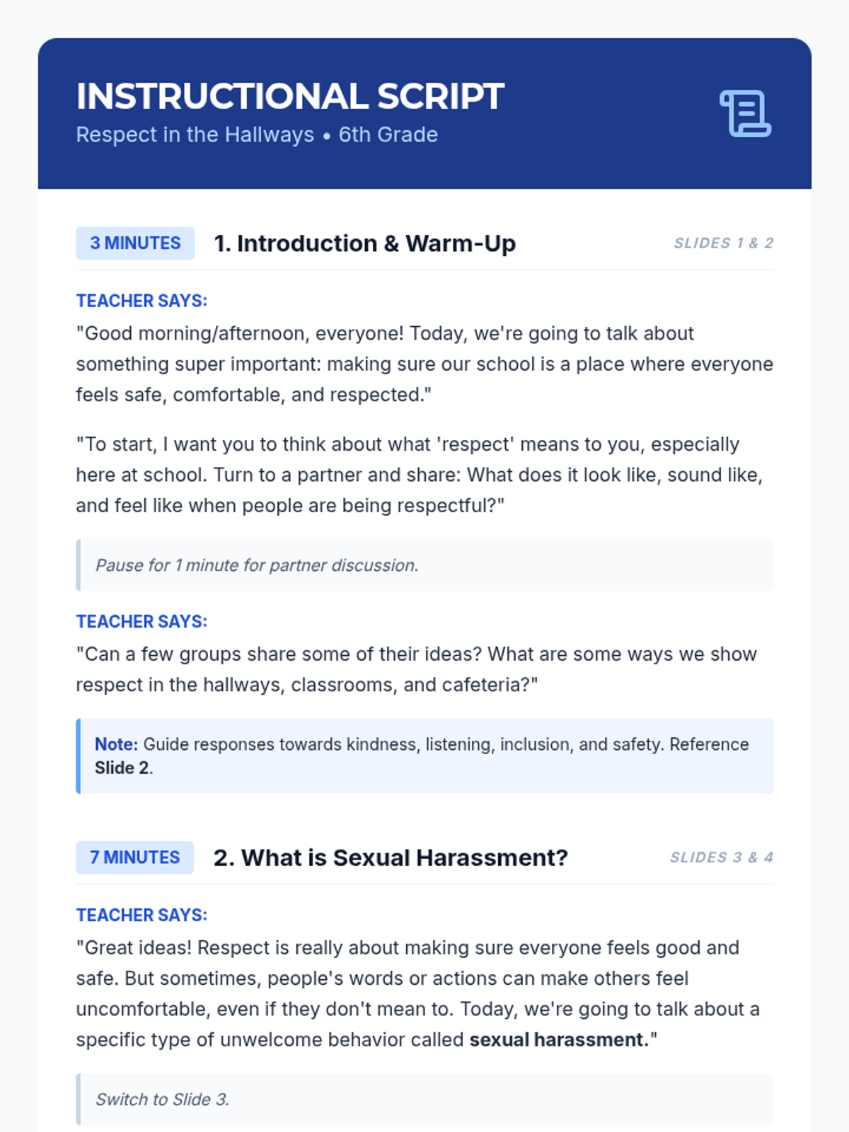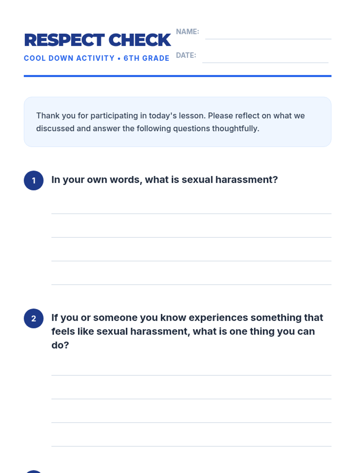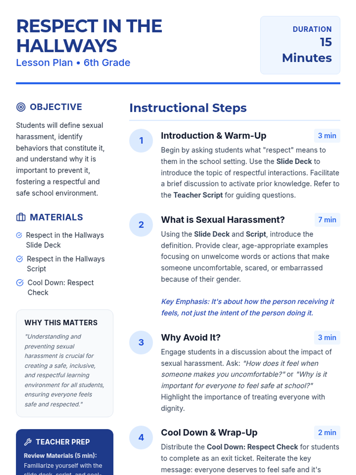 A 15-minute lesson for 6th-grade students defining sexual harassment in an age-appropriate way, discussing its impact, and empowering students to foster a safe and respectful school environment.