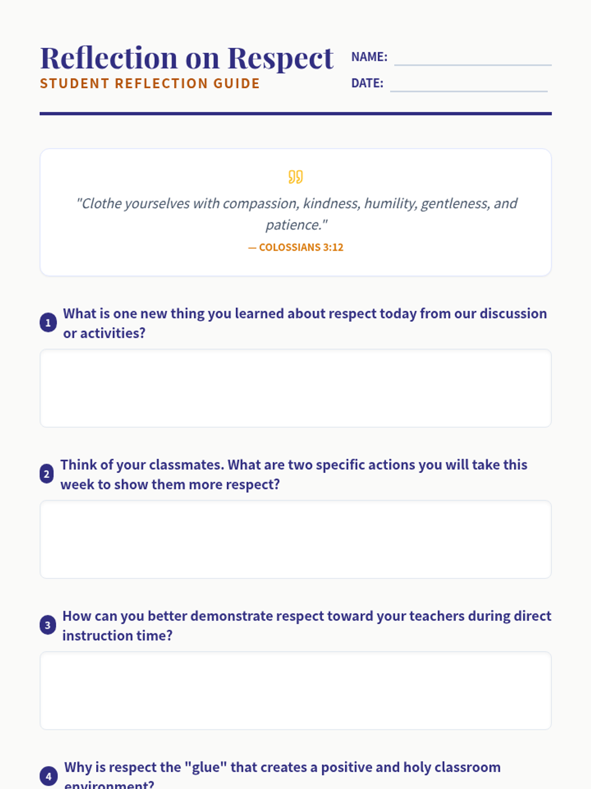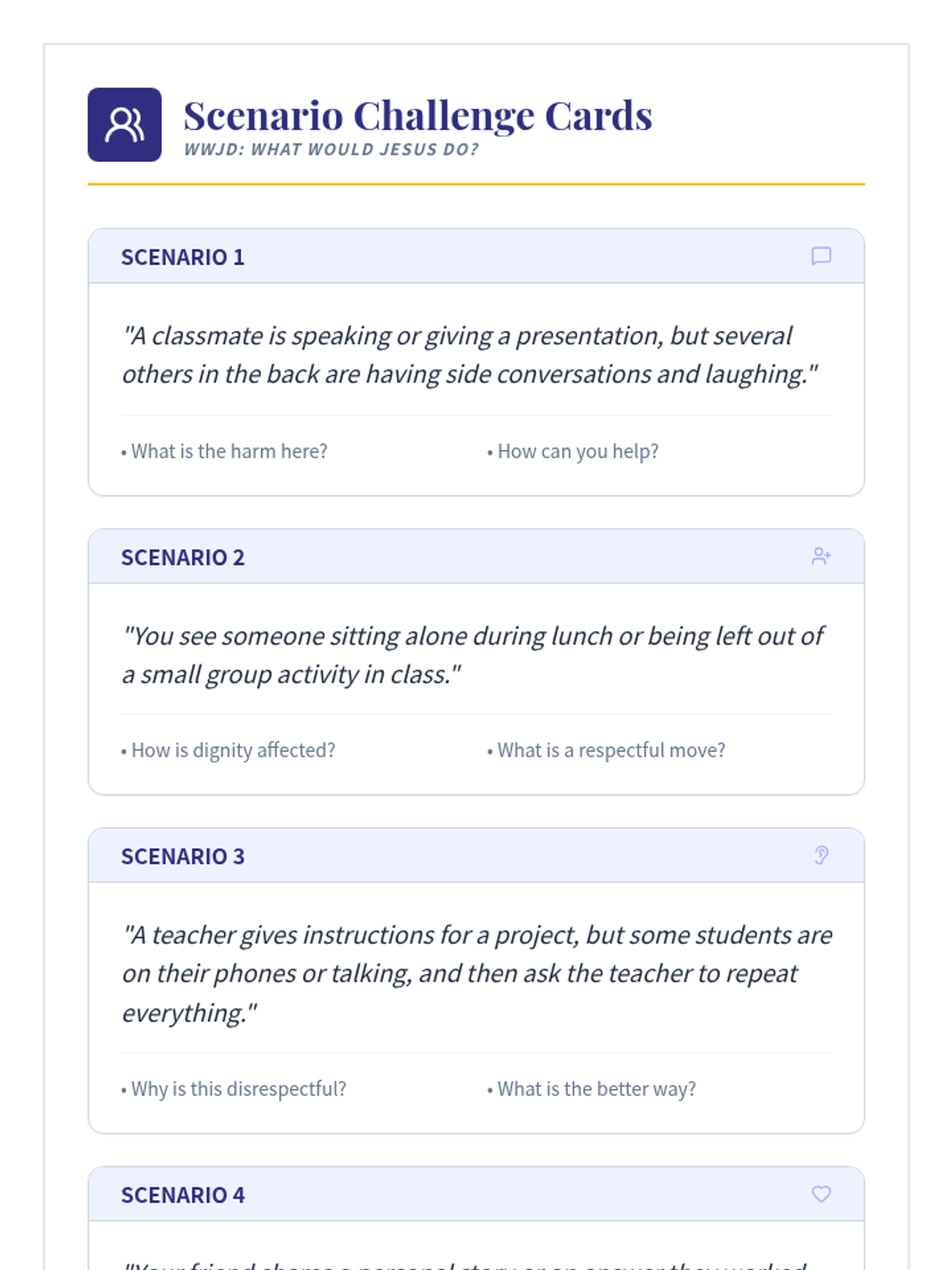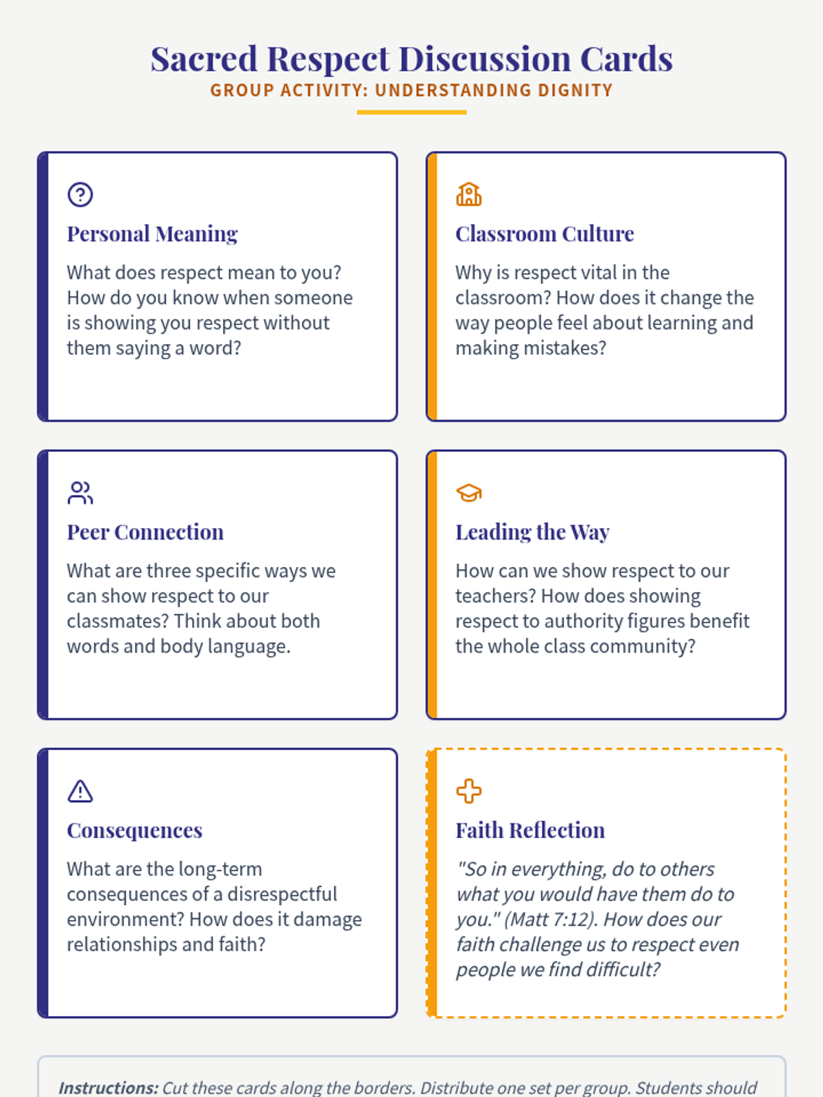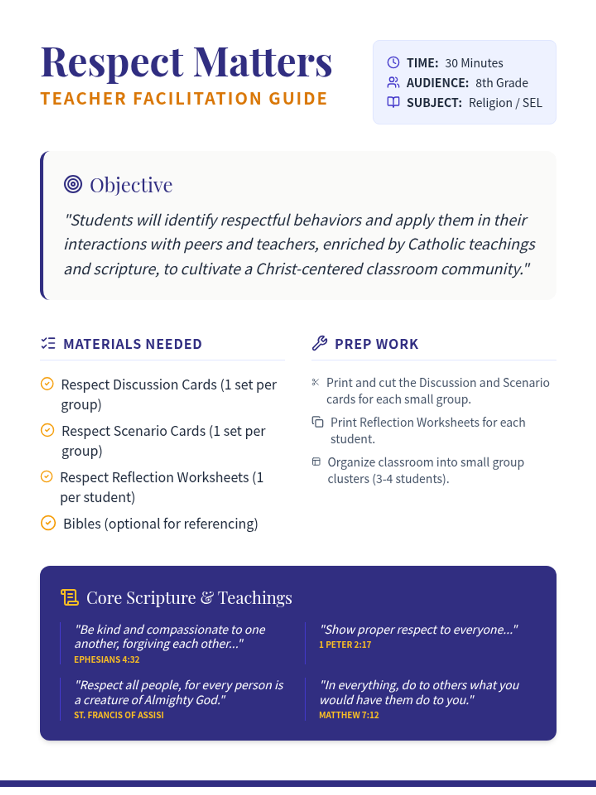 An 8th-grade lesson on classroom respect grounded in Catholic social teaching and scripture, featuring group discussions, scenario-based problem solving, and personal reflection.