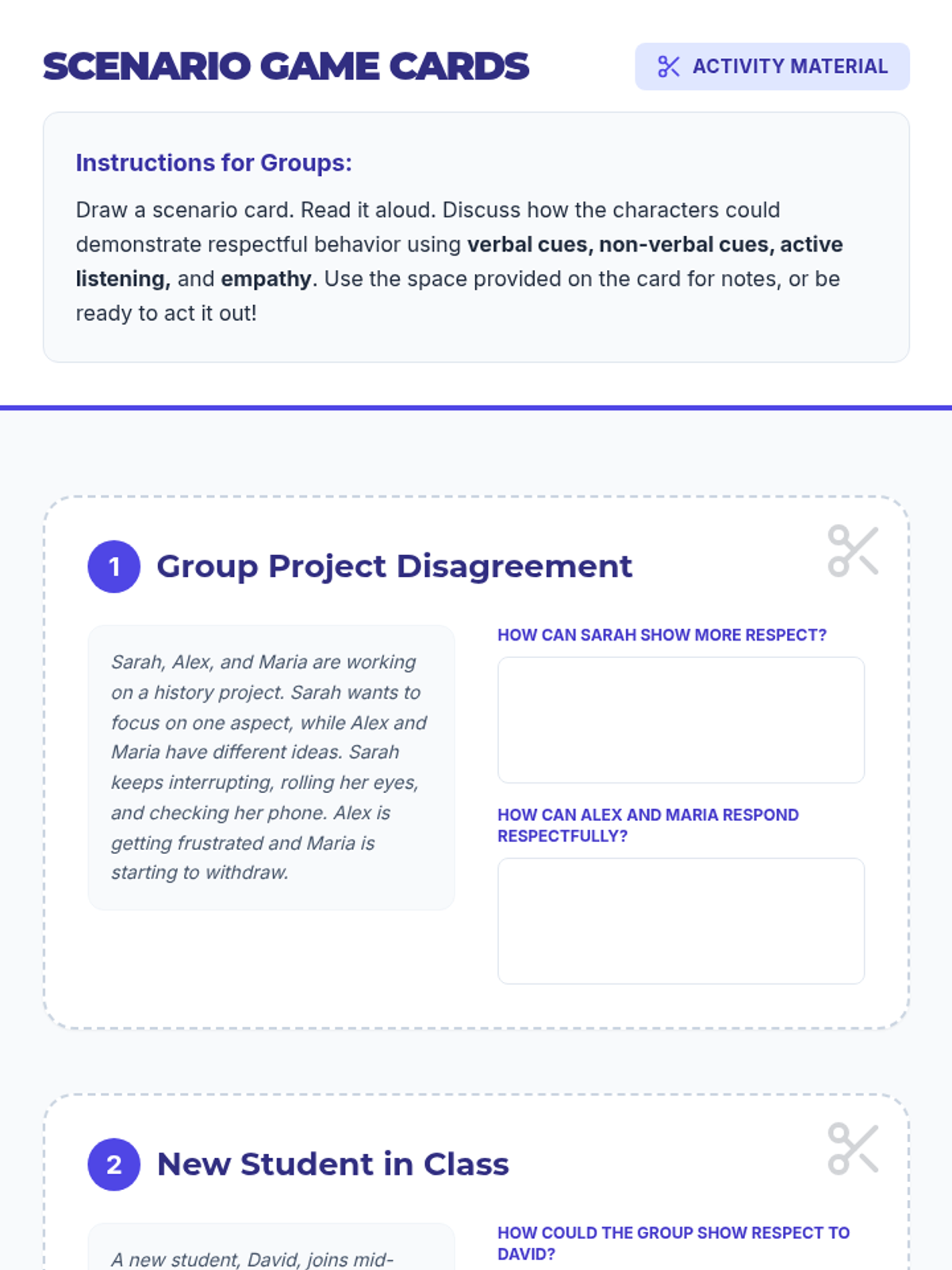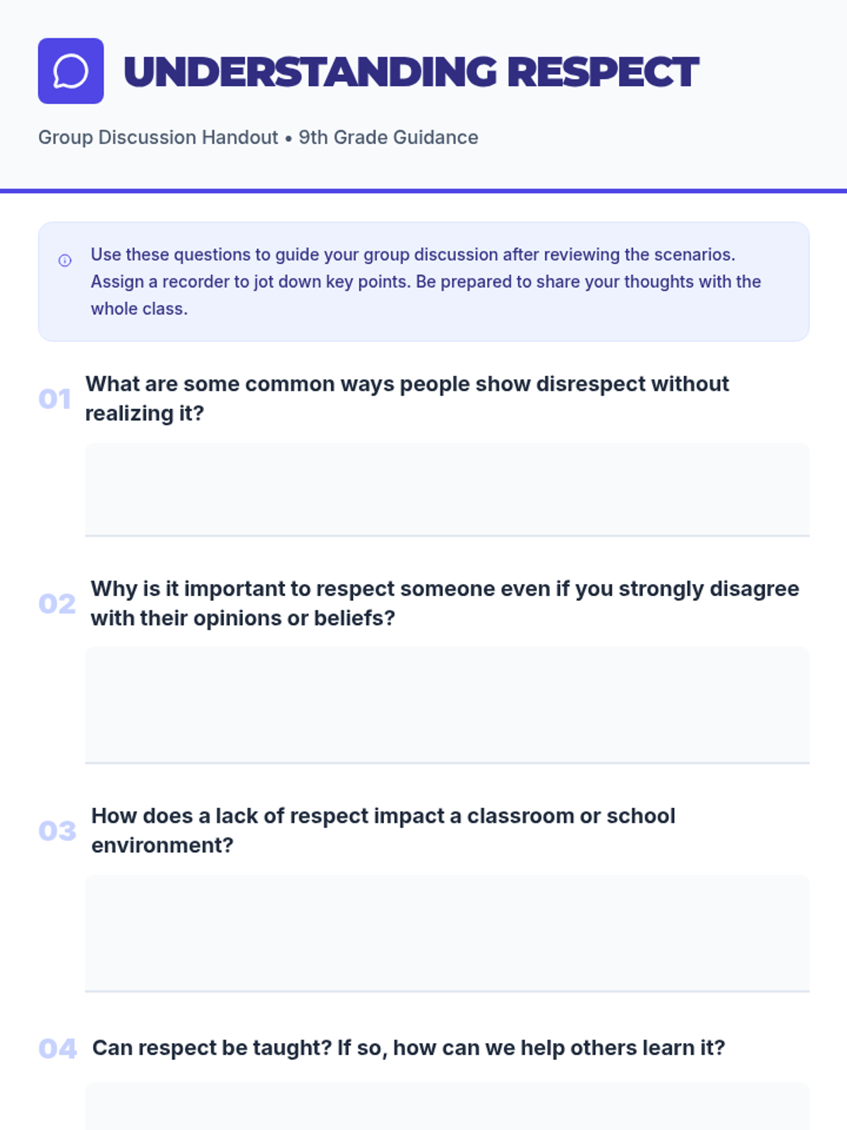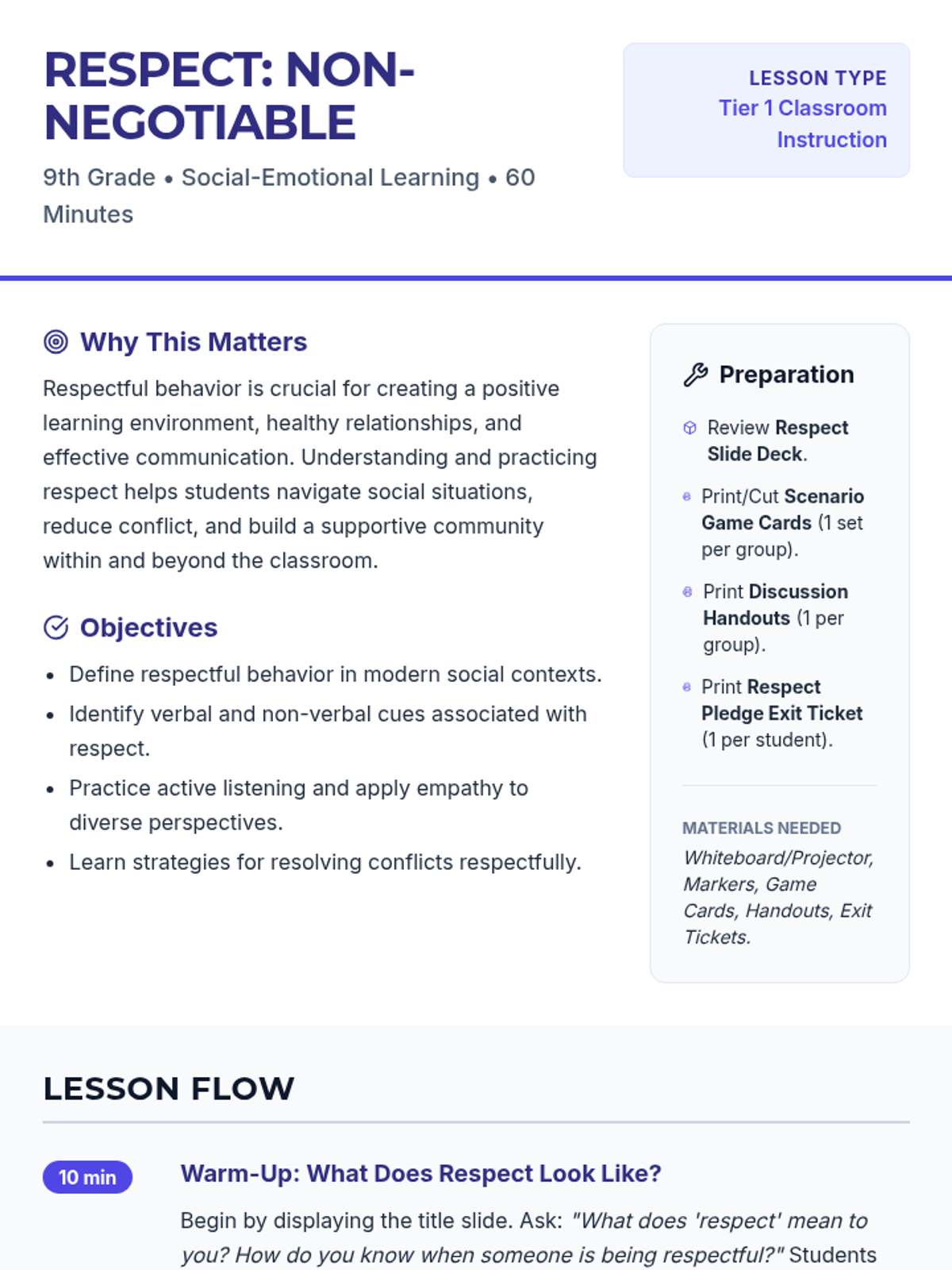 A comprehensive 60-minute lesson for 9th-grade students focused on defining respect, identifying verbal and non-verbal cues, practicing active listening, and applying empathy in conflict resolution.