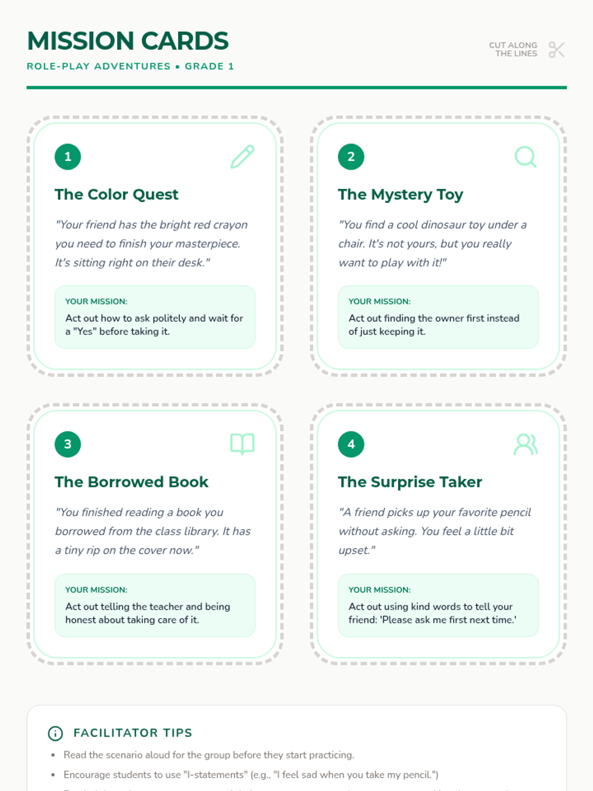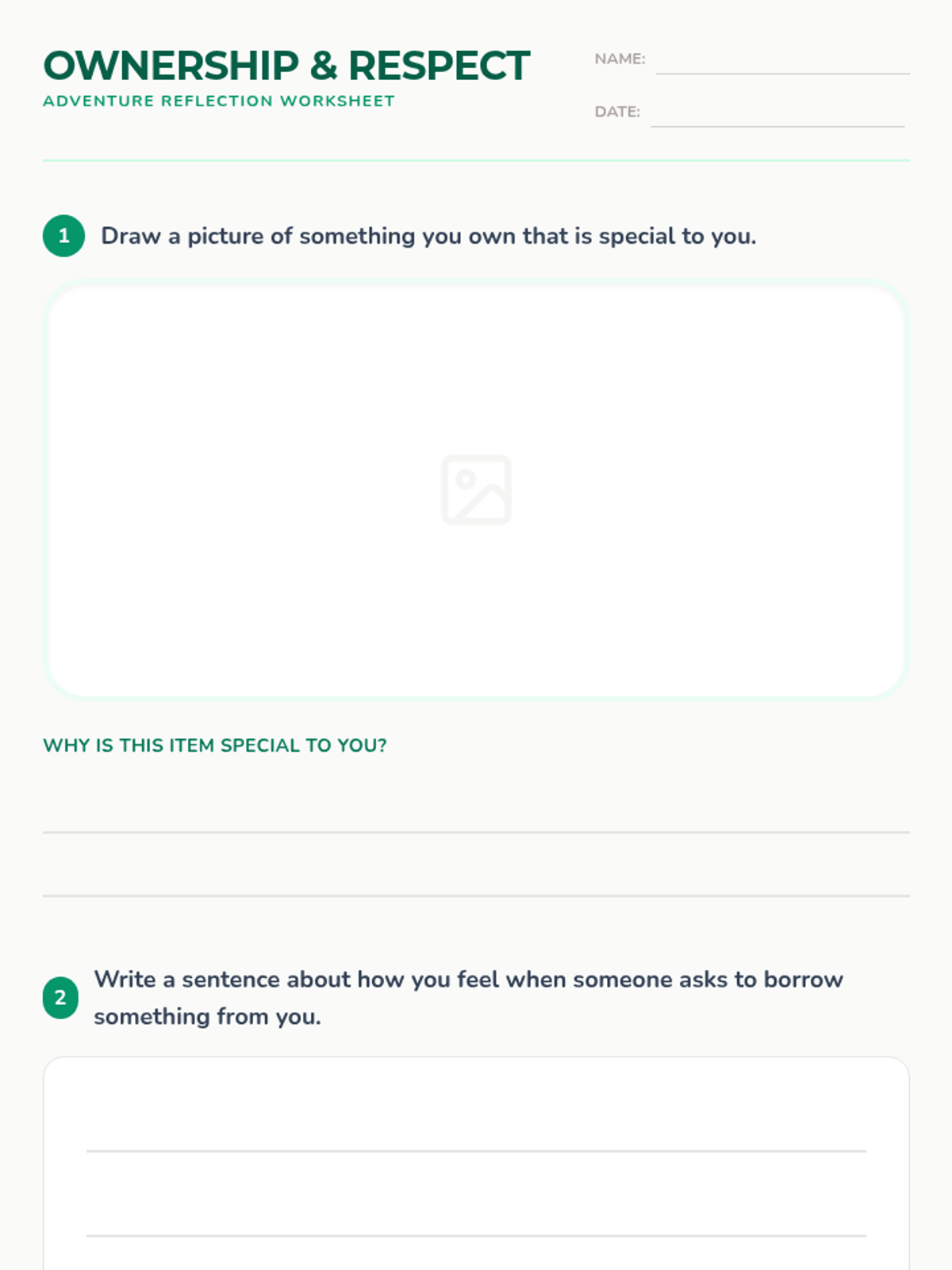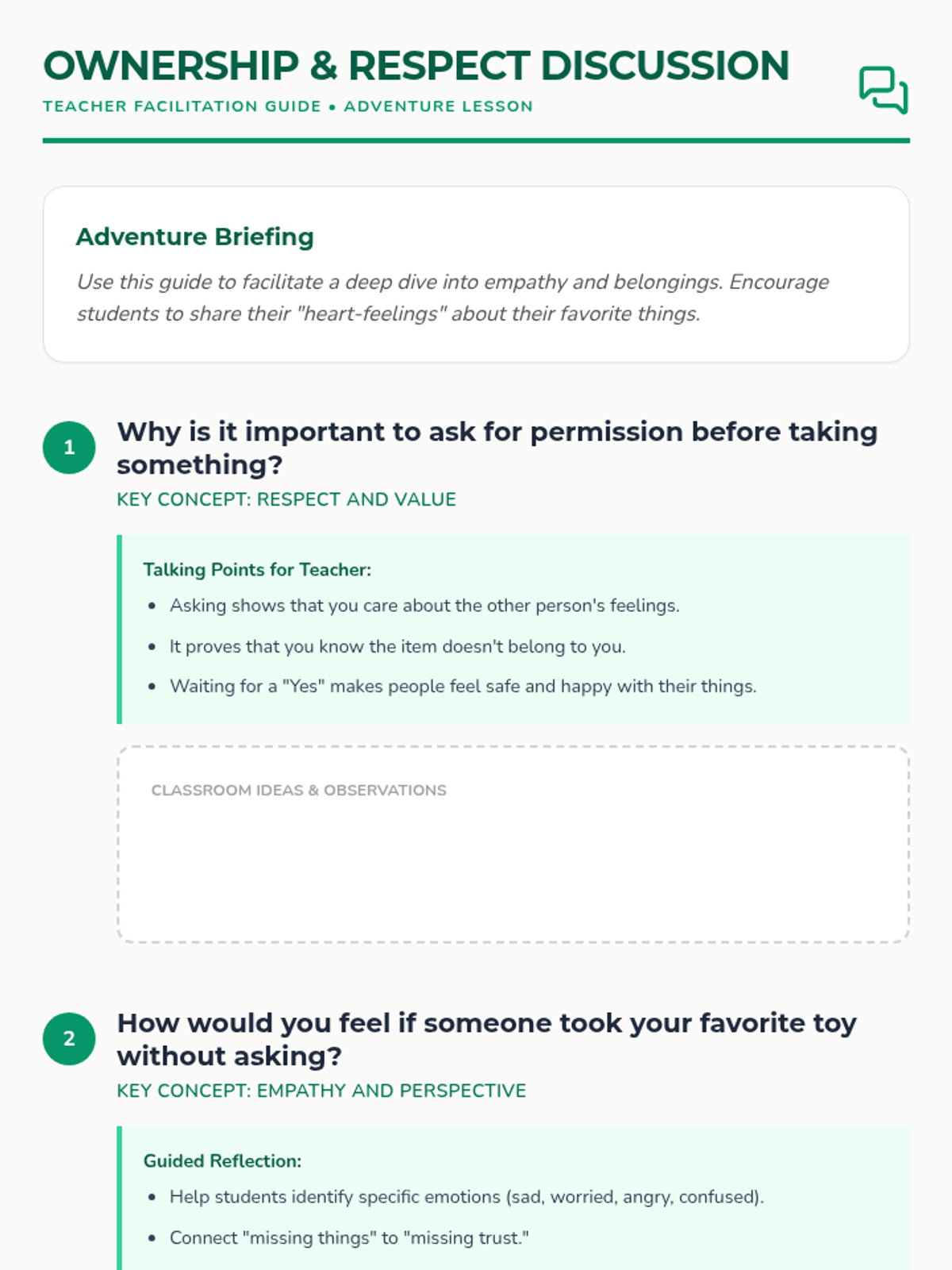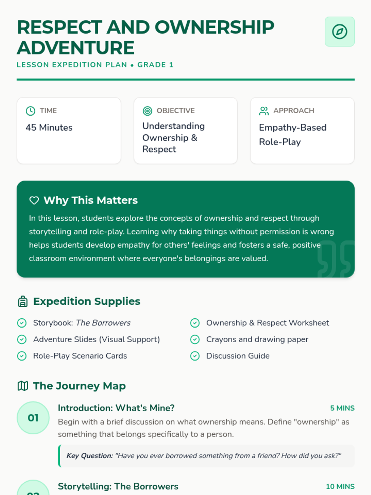 A 1st-grade lesson exploring ownership and respect through storytelling, role-play, and reflection to build empathy and positive classroom habits.