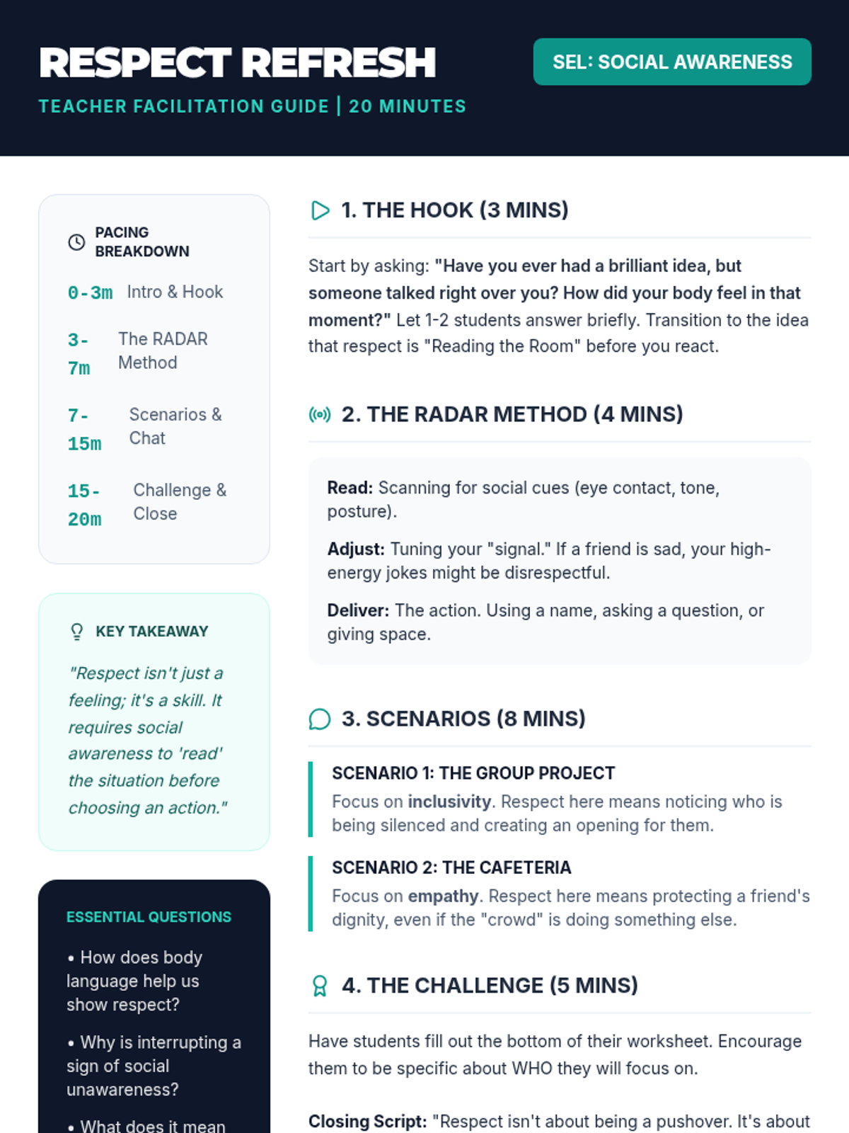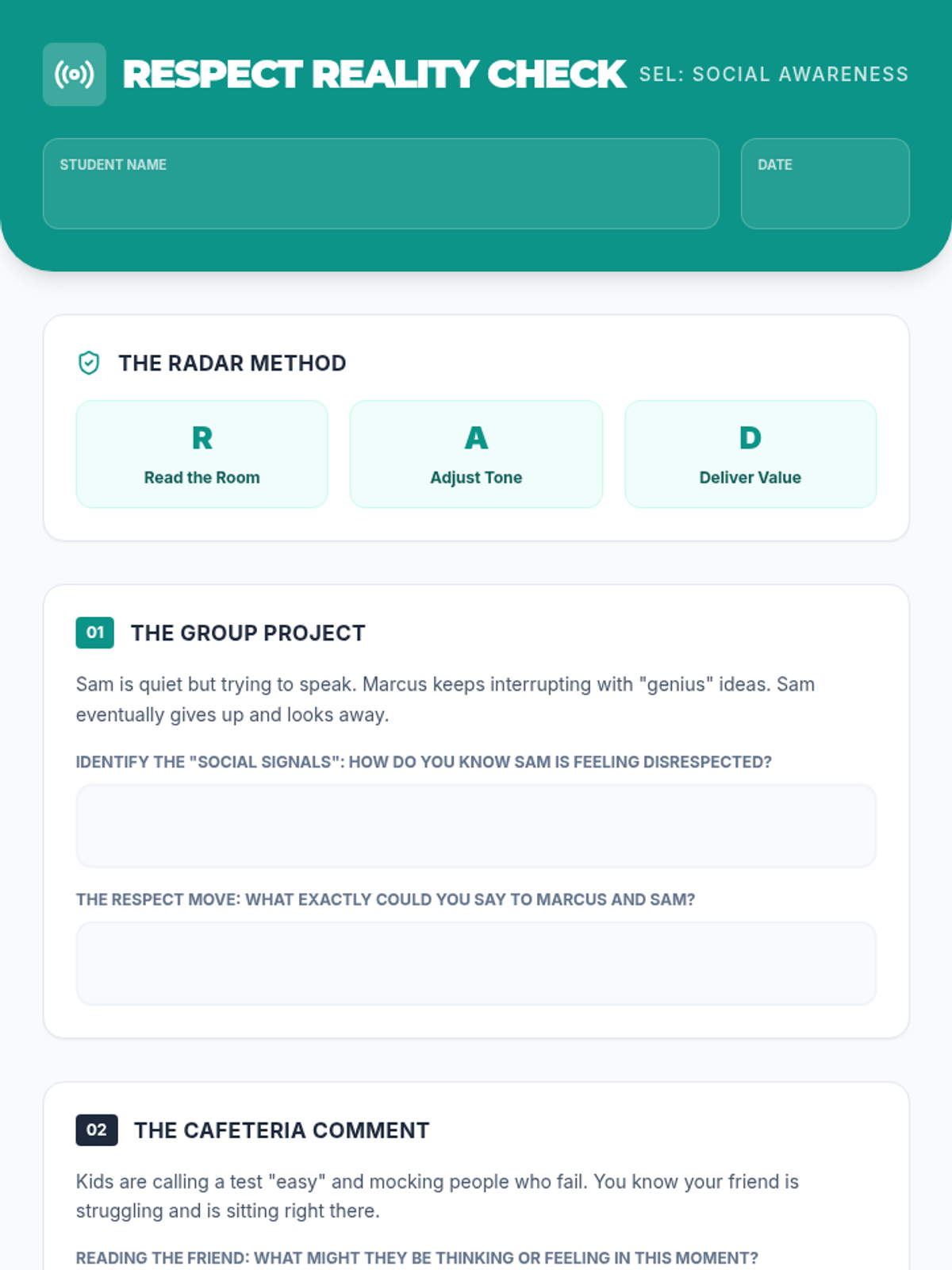 A 20-minute SEL lesson focused on social awareness and respect through real-life scenarios. Students learn to 'read the room' and respond with empathy and consideration.