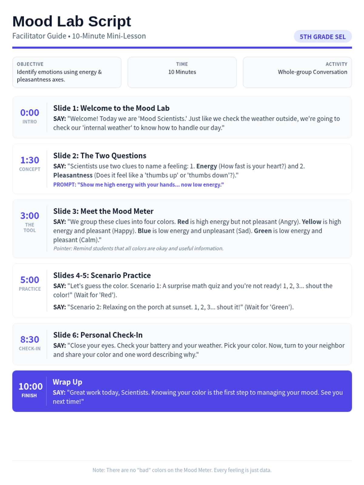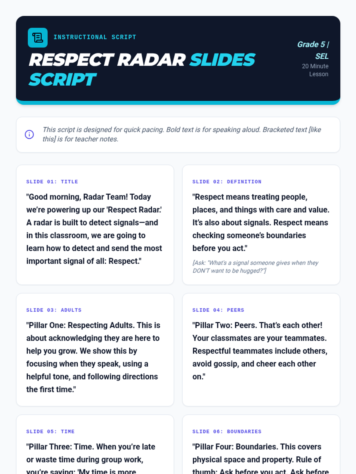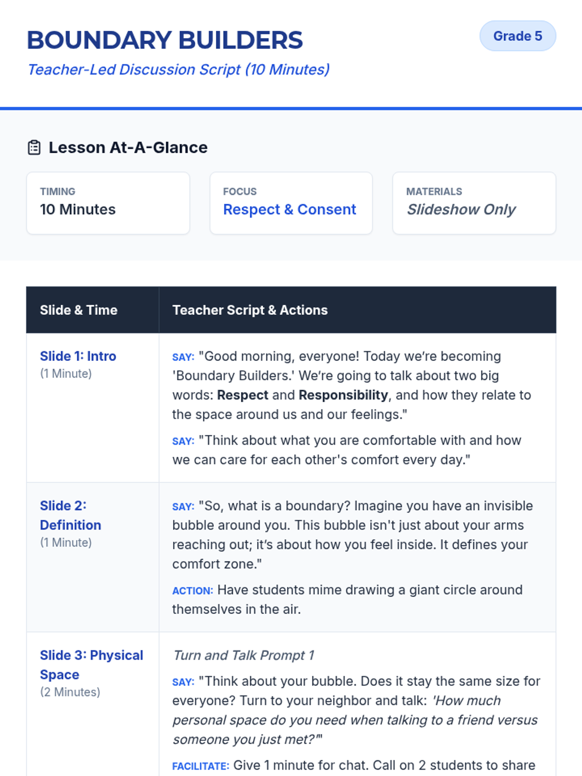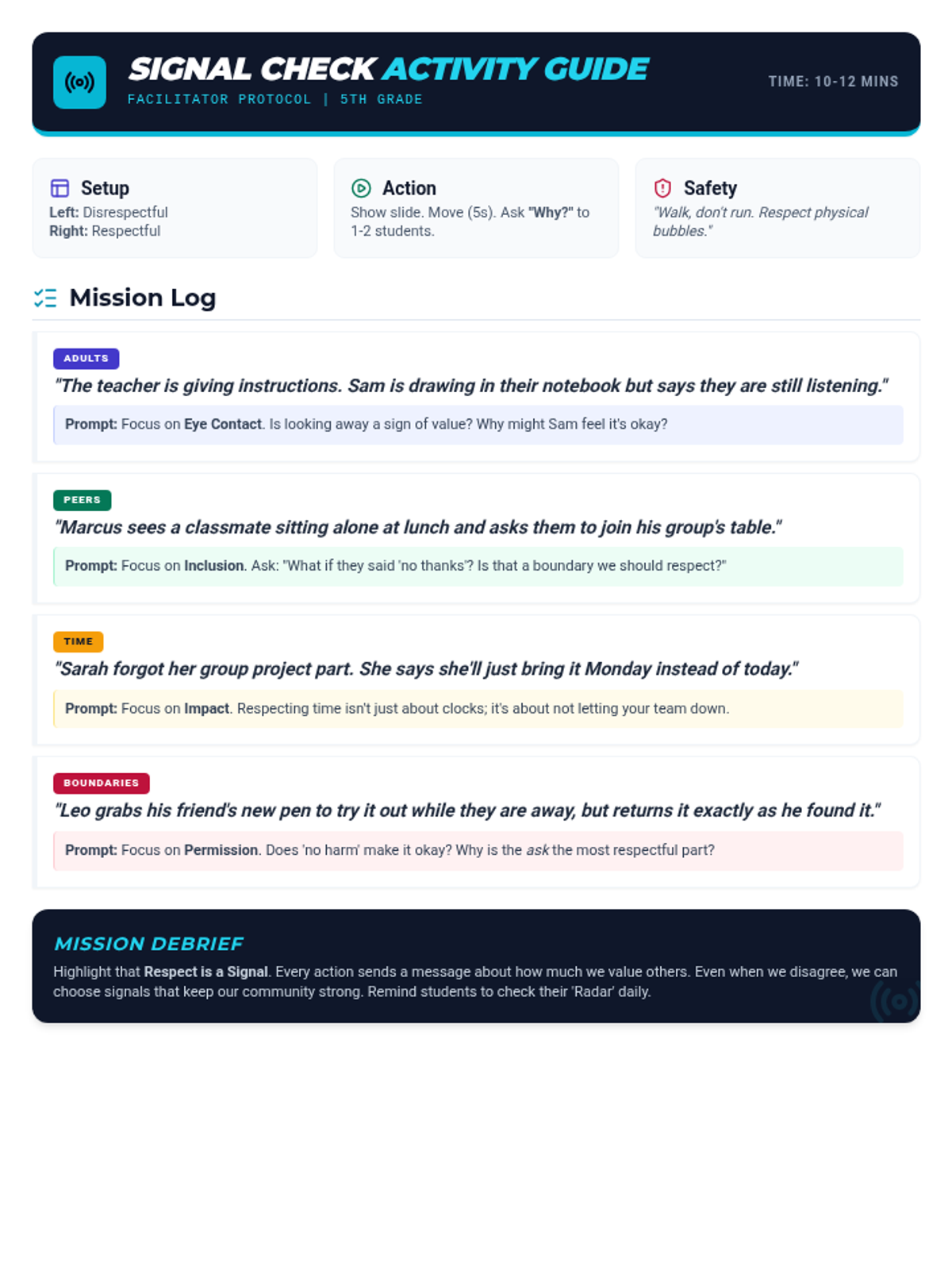 A fast-paced, 20-minute lesson designed to help 5th graders identify and practice respect across four key areas: adults, peers, time, and boundaries. Featuring a high-energy movement activity where students physically take a stand on various social scenarios.