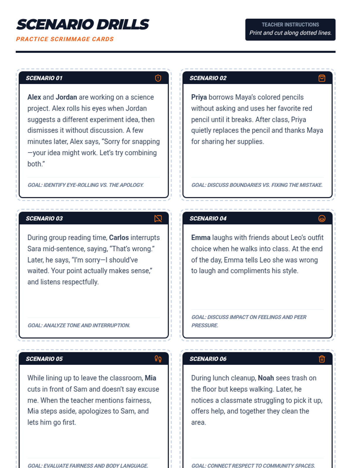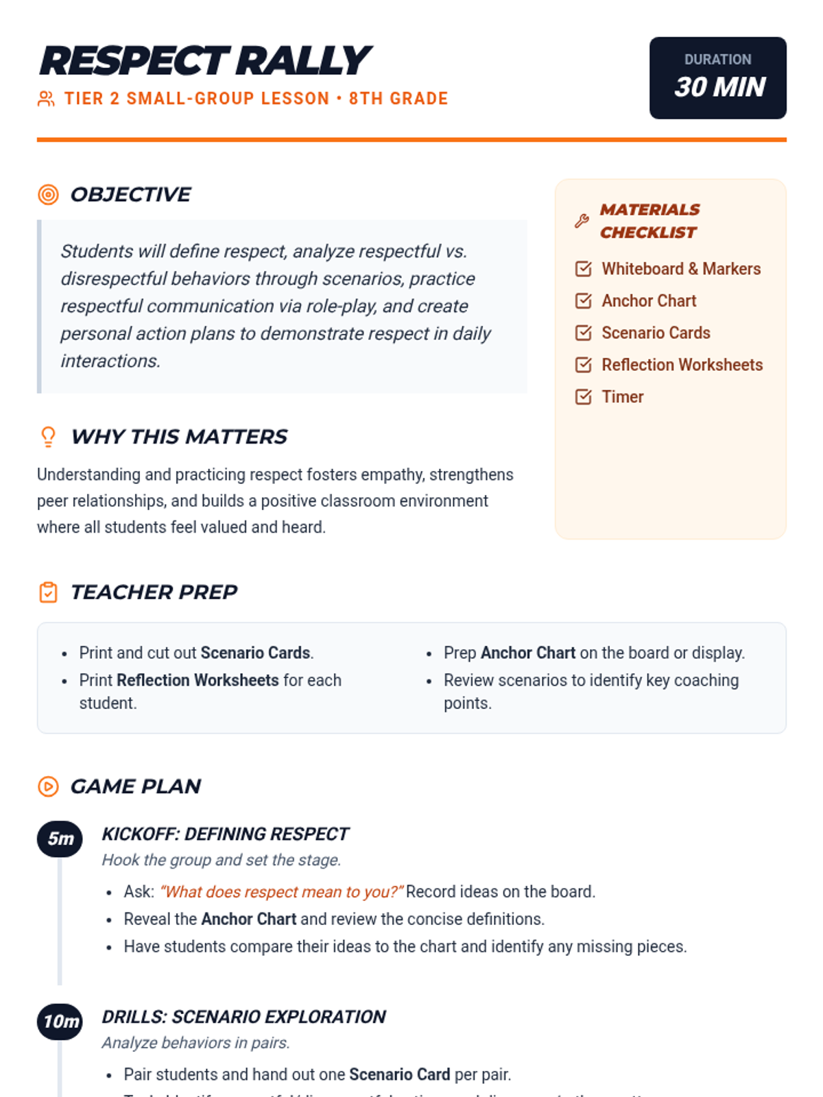 A 30-minute Tier 2 small-group lesson for 8th graders to explore respect, practice communication, and develop empathy through role-play and reflection.