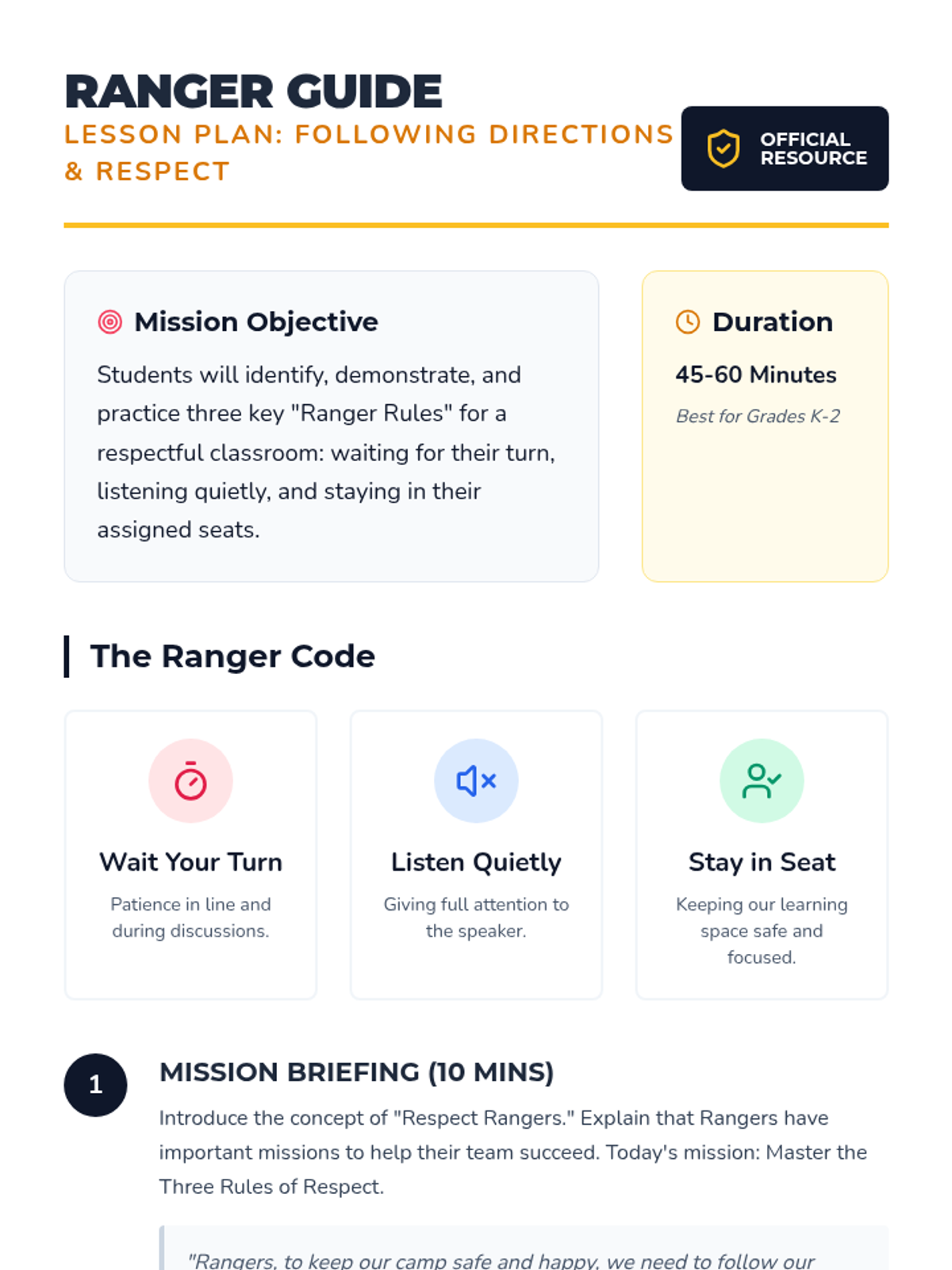 A comprehensive lesson package focused on teaching students how to follow directions and show respect by waiting their turn, listening quietly, and staying in their seats.