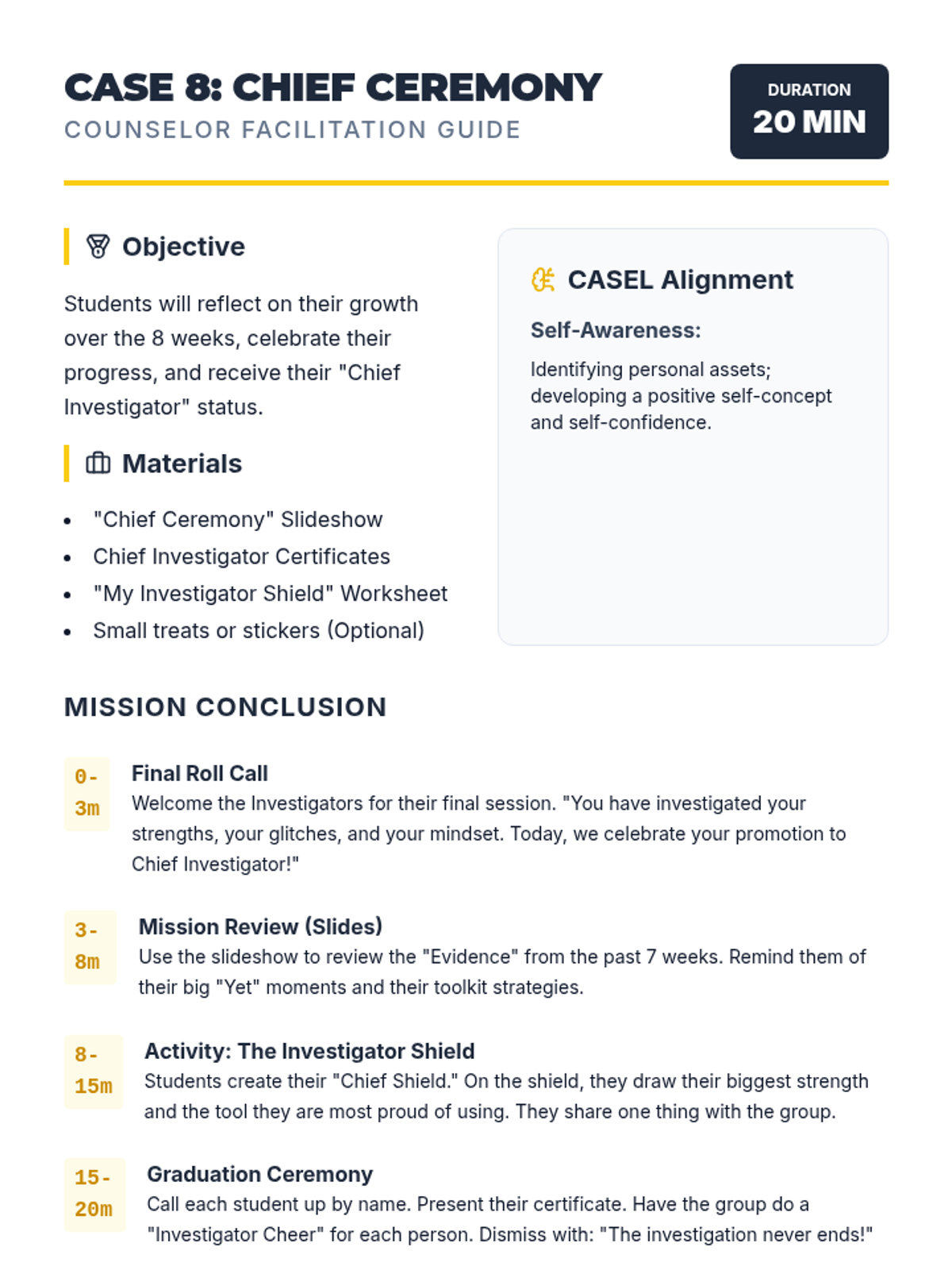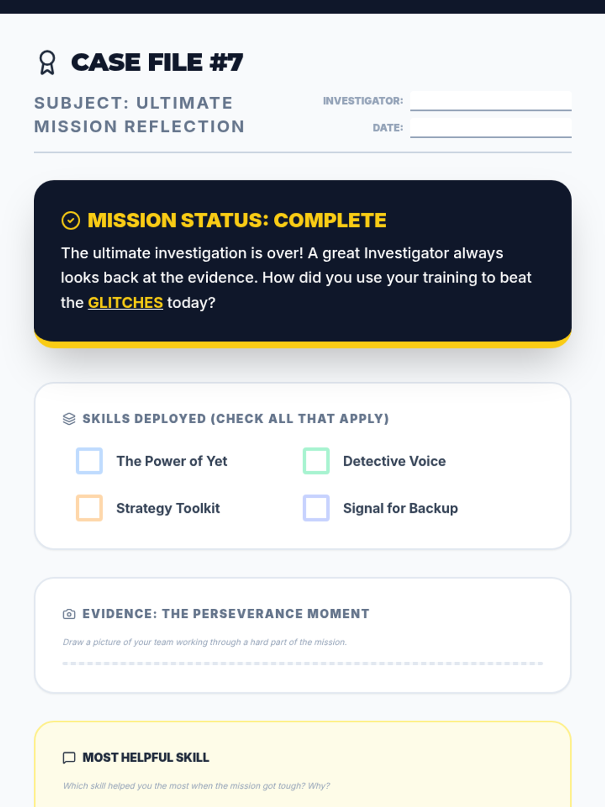 Students celebrate their progress, review key skills, and receive their 'Chief Investigator' status.