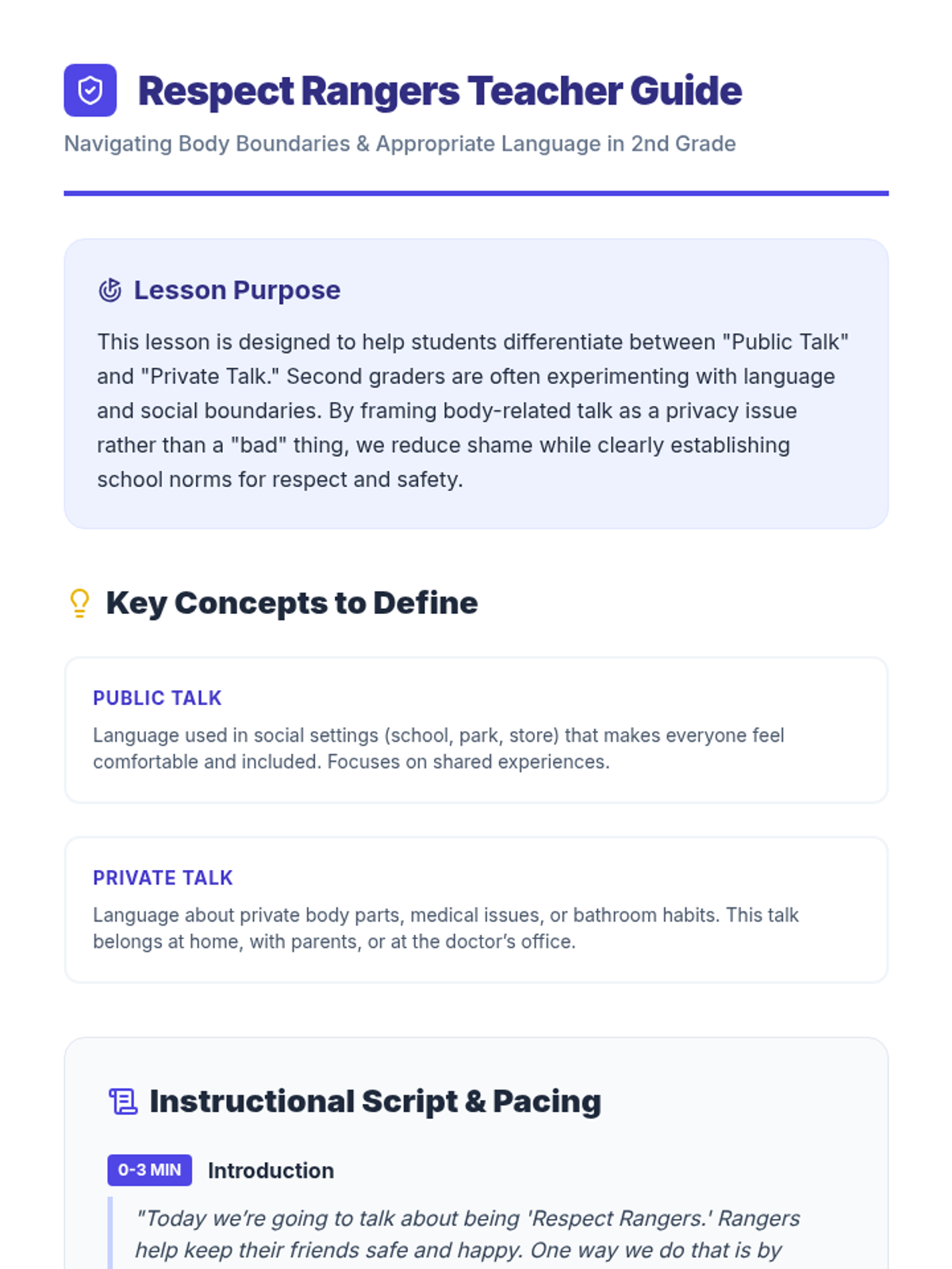 A 10-20 minute lesson for 2nd graders focusing on body privacy, appropriate school language, and respecting personal boundaries. It uses a short story to illustrate why some body-related talk is for home or doctors, not for the playground or classroom.
