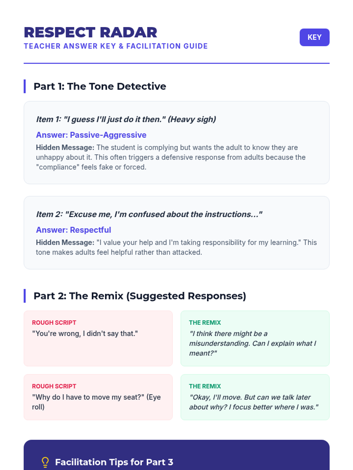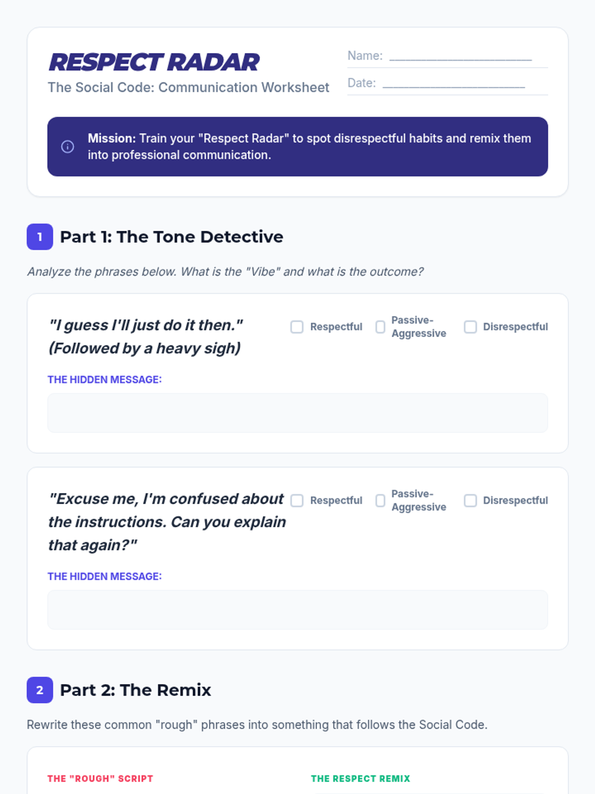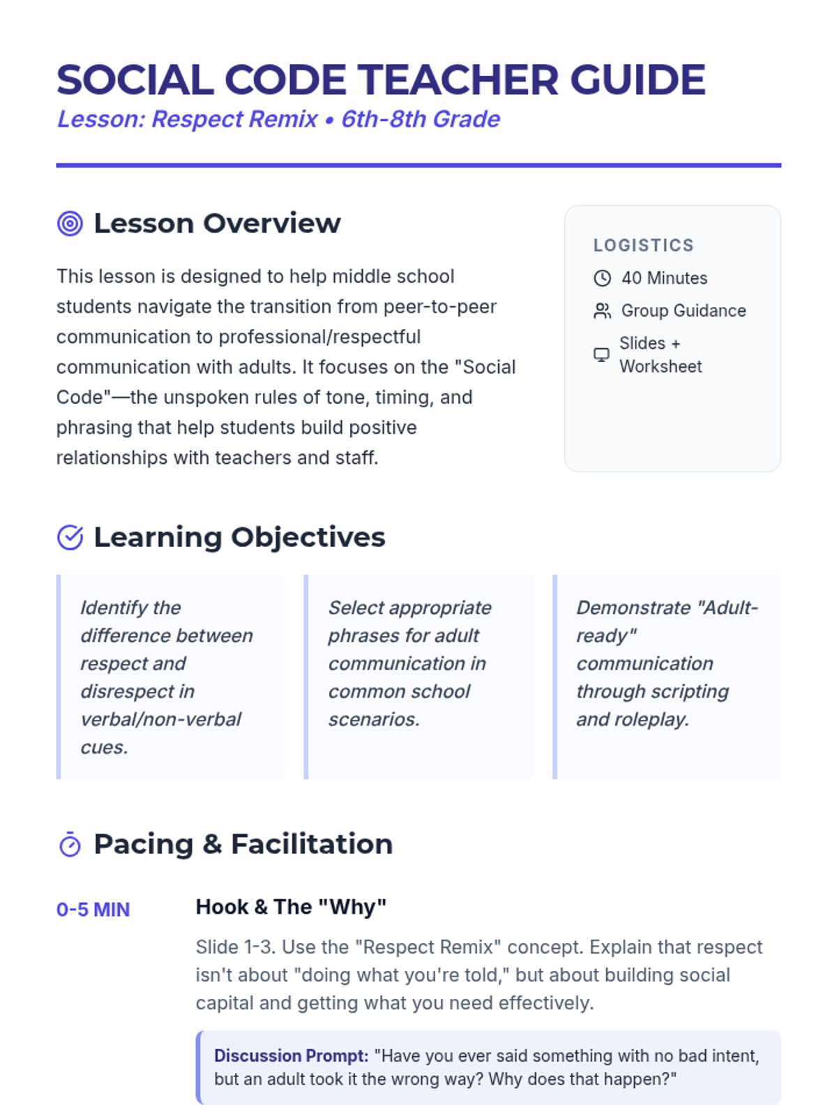 A 40-minute interactive lesson for middle schoolers on the nuances of respect, specifically focusing on communication with adults in school settings. Students will explore tone, body language, and verbal phrasing.