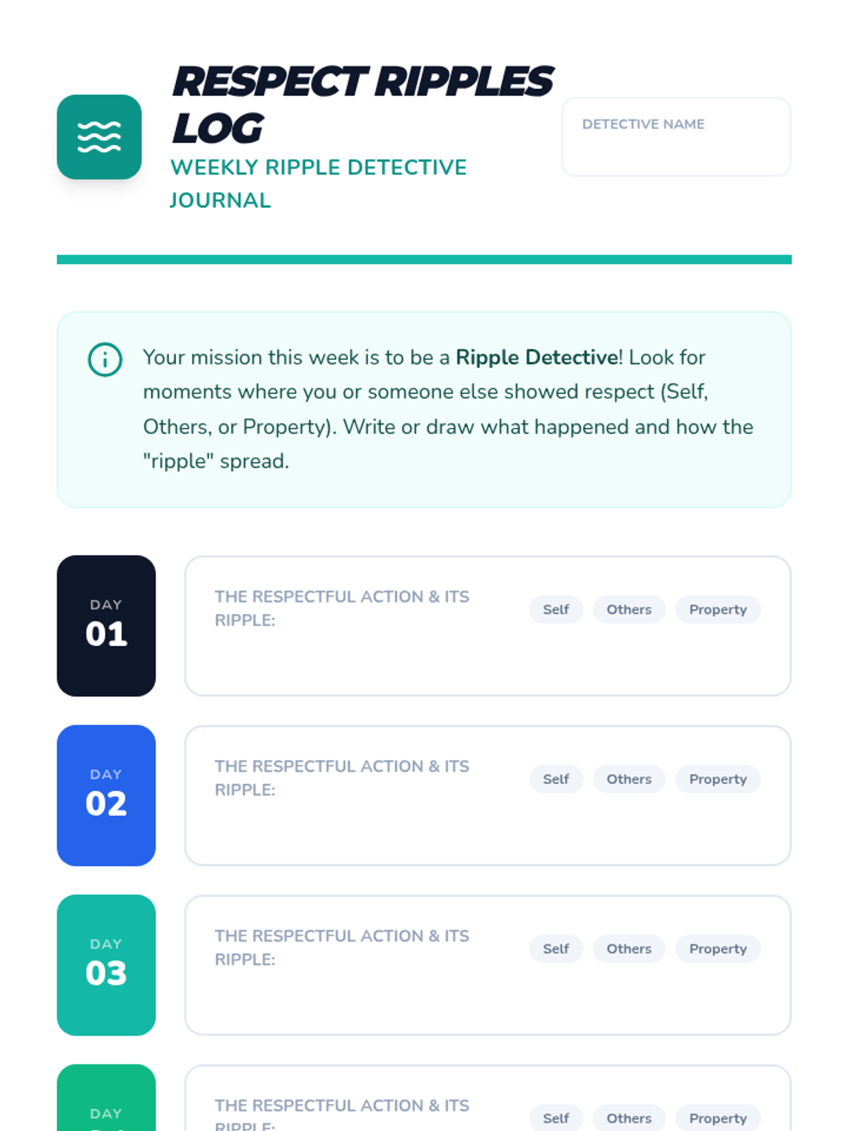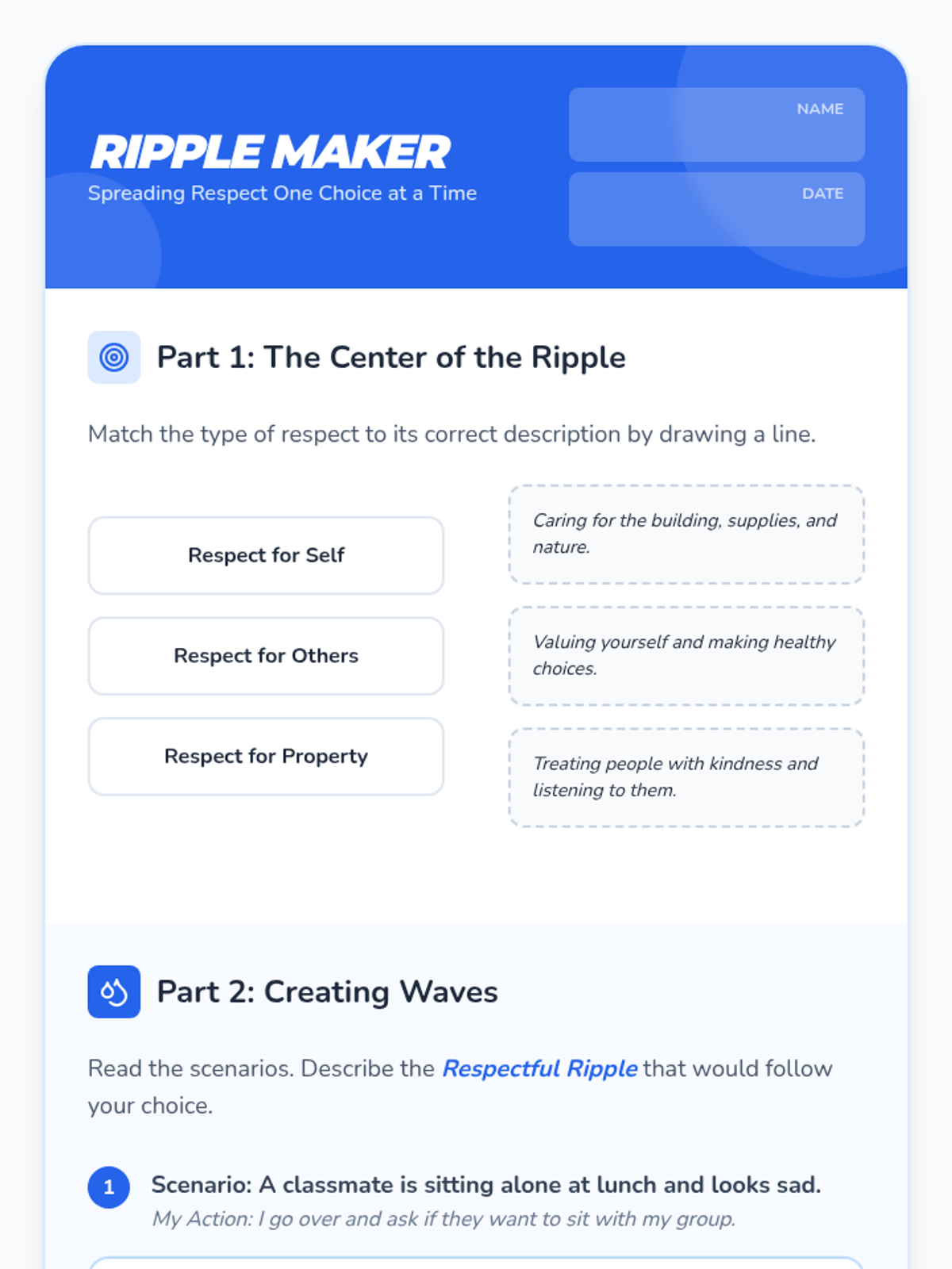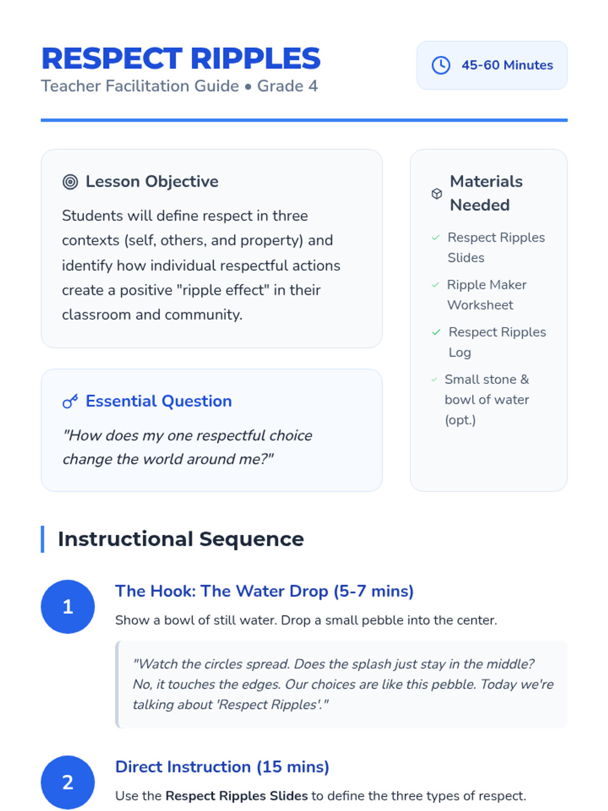 A lesson for 4th graders exploring the concept of respect, focusing on how respectful actions create positive 'ripples' in their community, school, and home.
