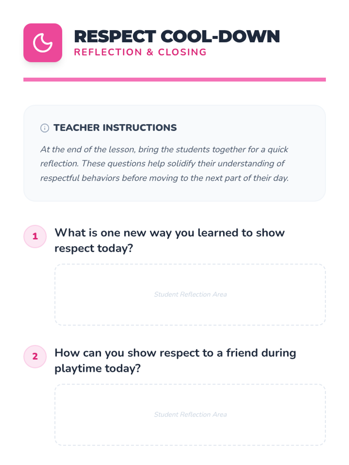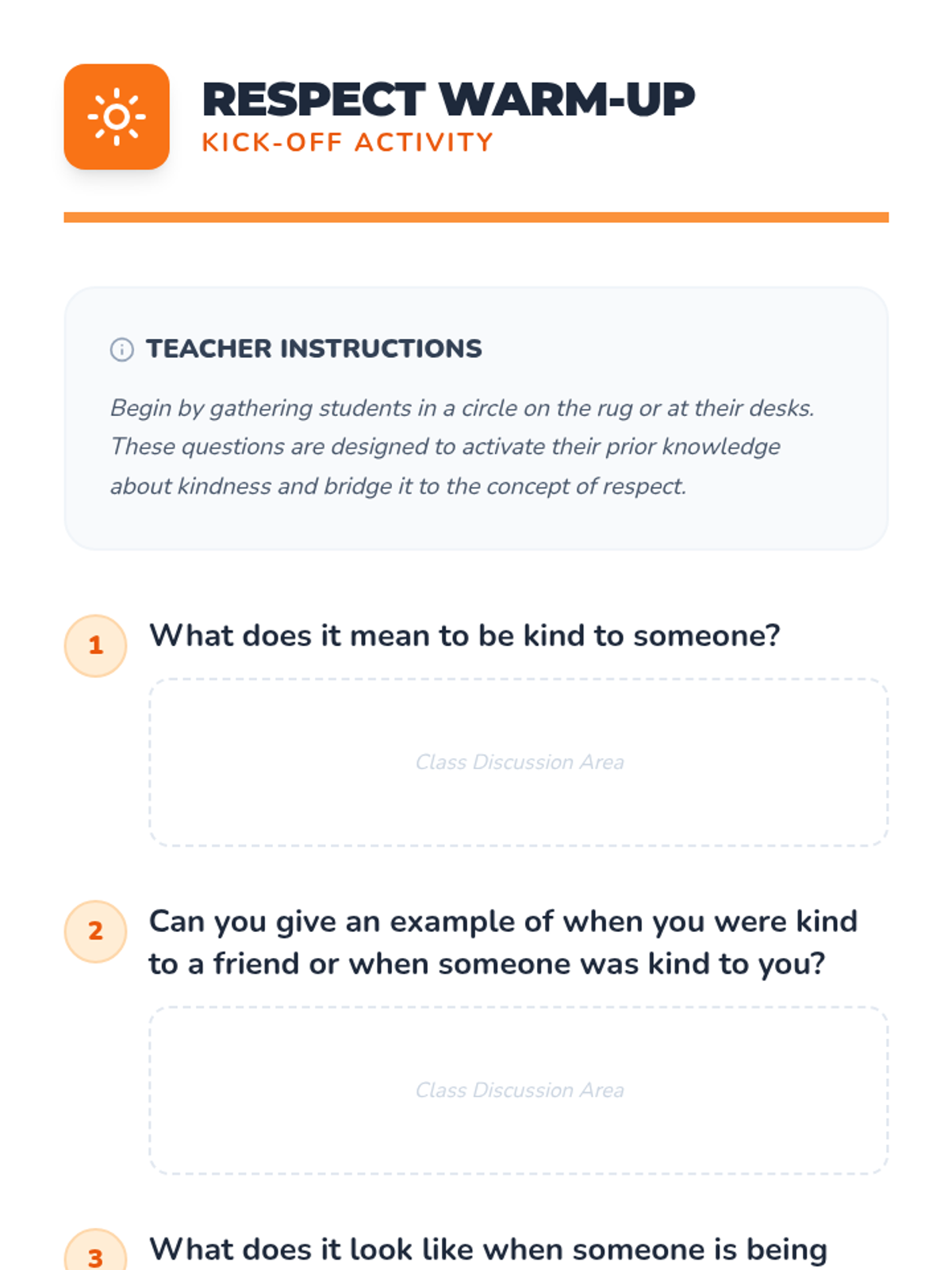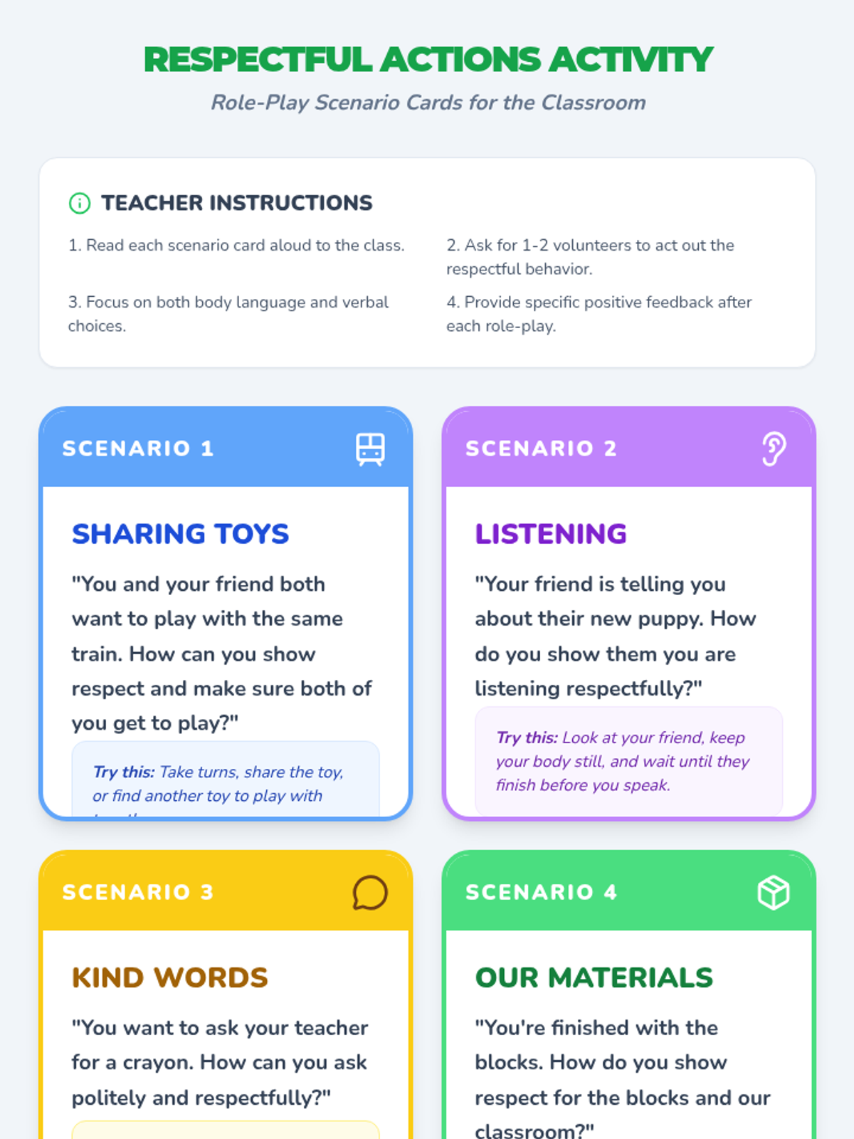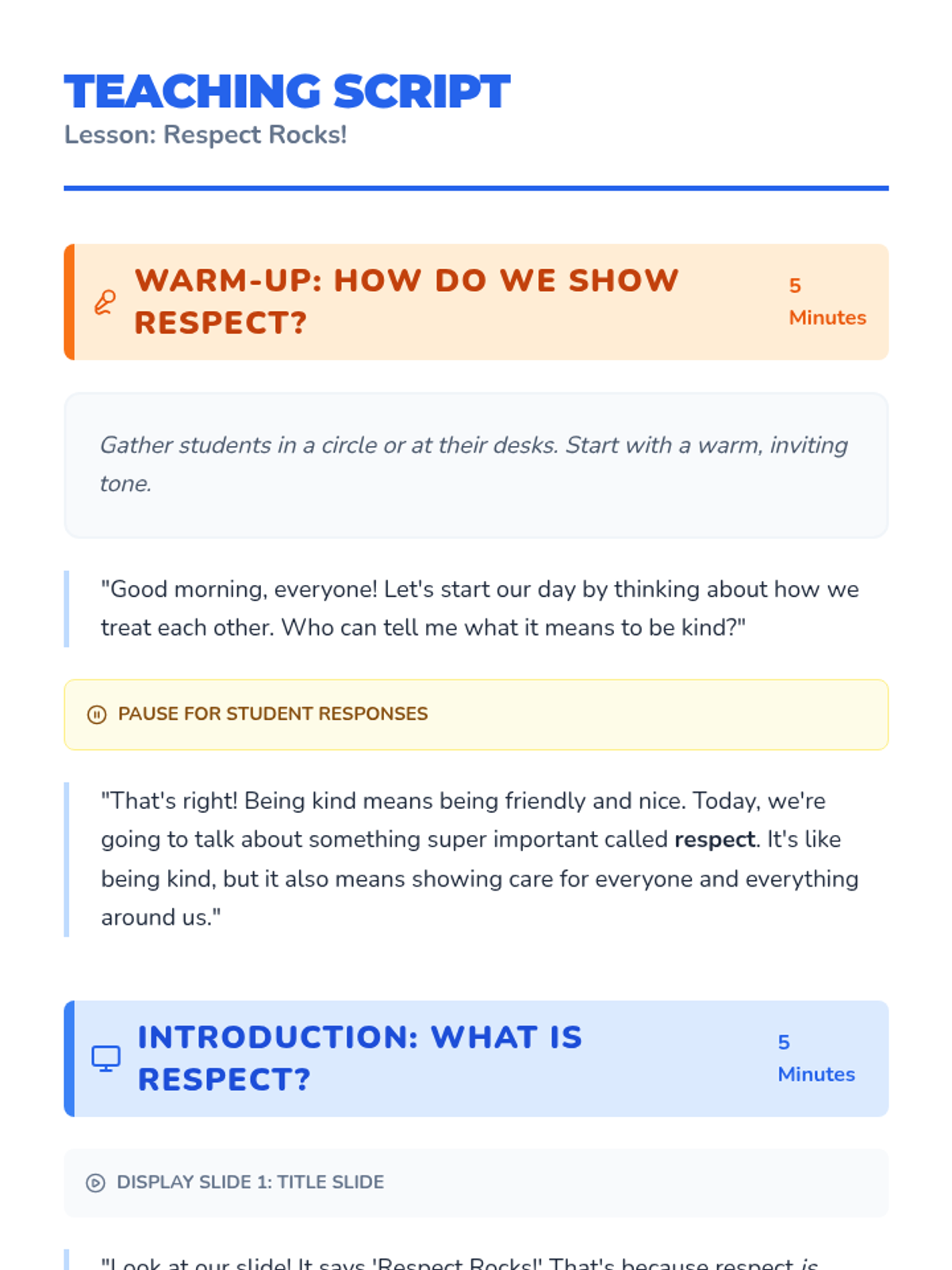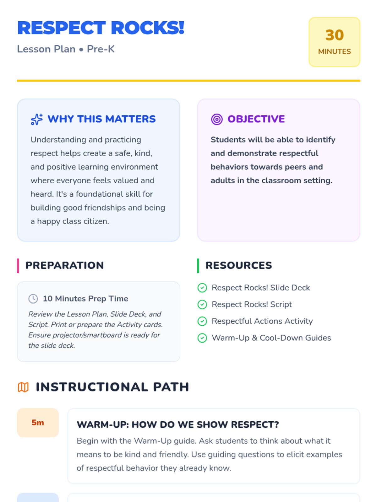 This interactive Pre-K lesson introduces the concept of respect through discussion, visual aids, and role-playing, helping students identify and practice kind and respectful behaviors in the classroom.