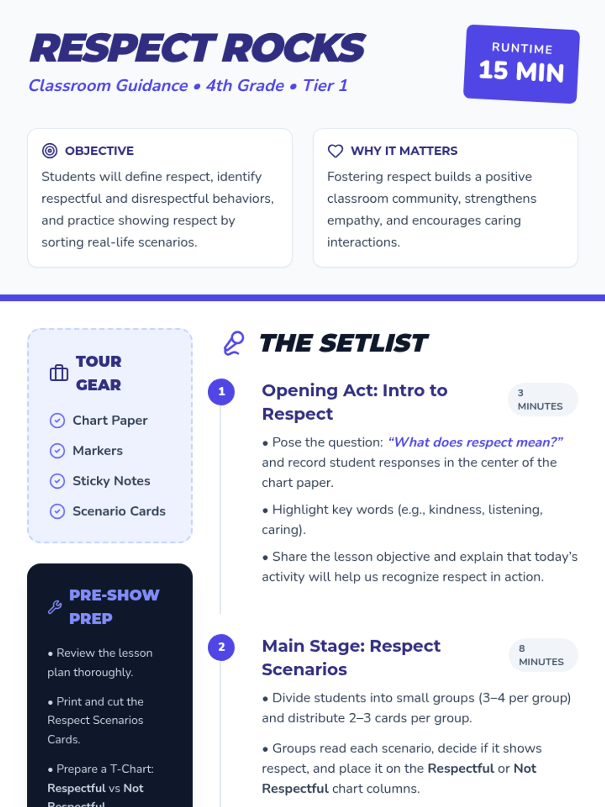 A 15-minute Tier 1 lesson for 4th graders to explore respect through discussion and scenario-based activities, using a 'Rock Star' theme.