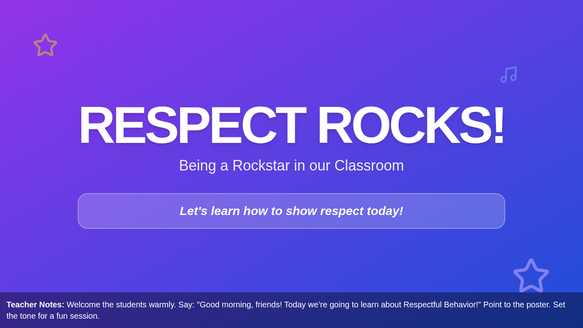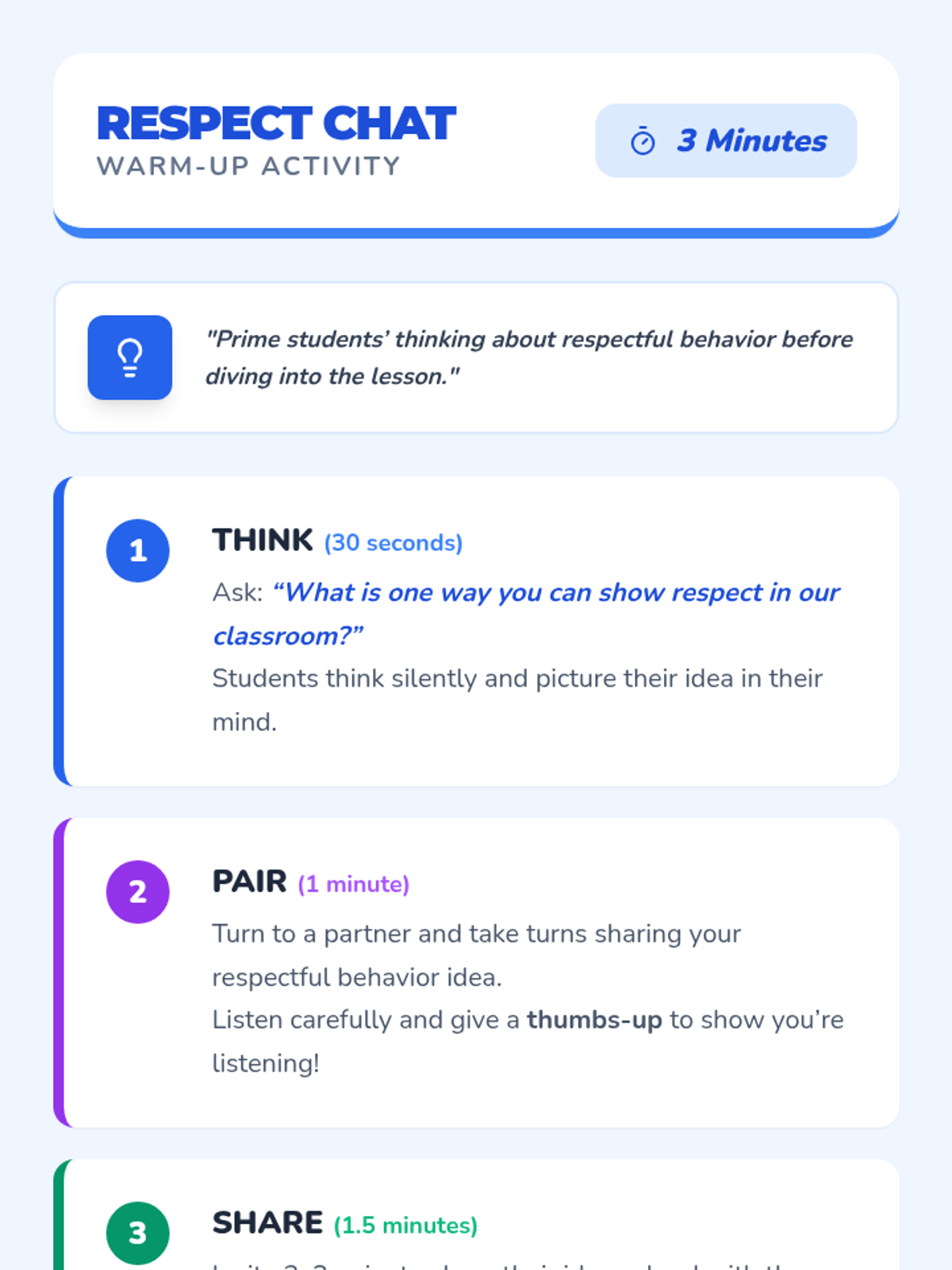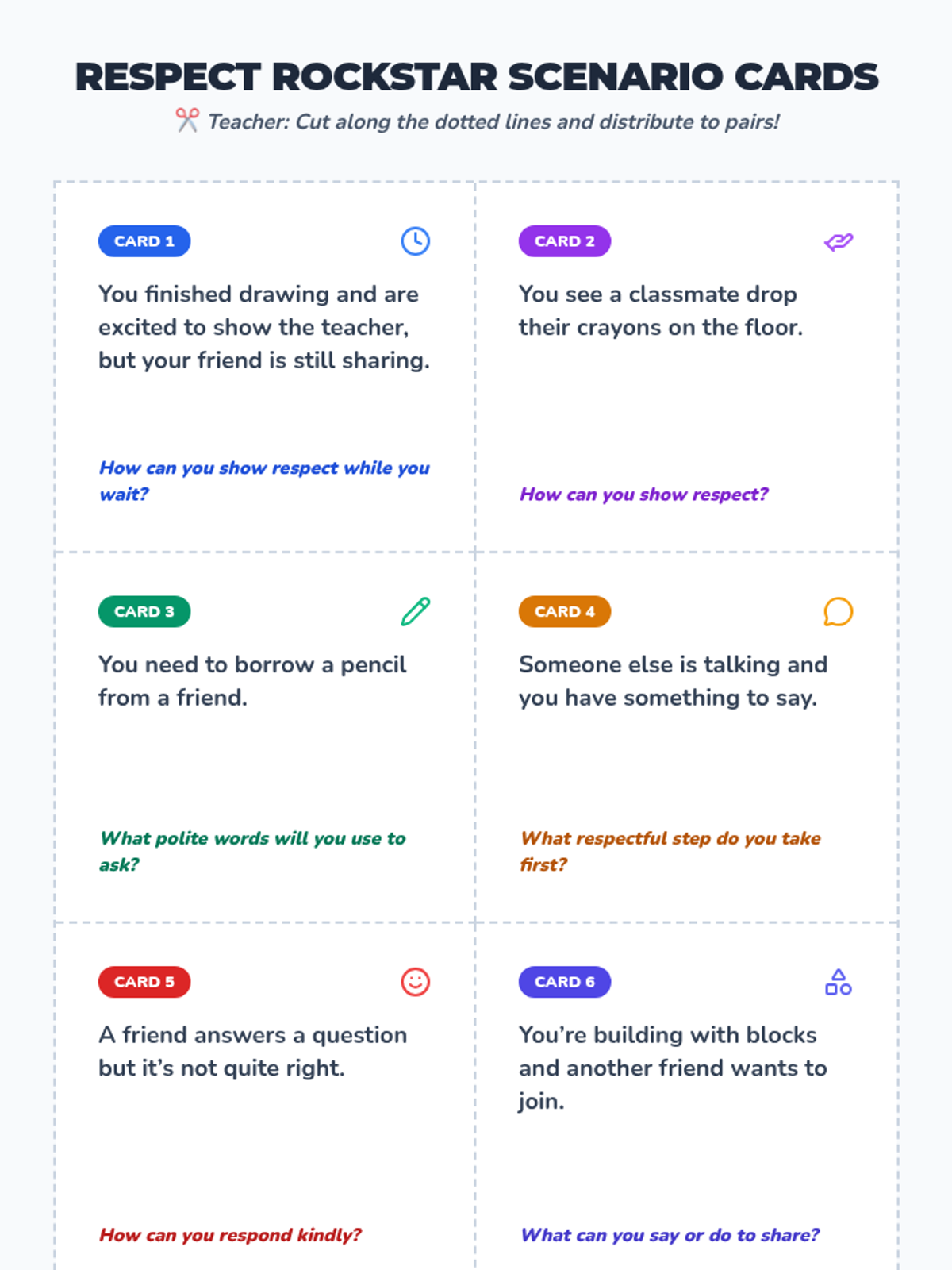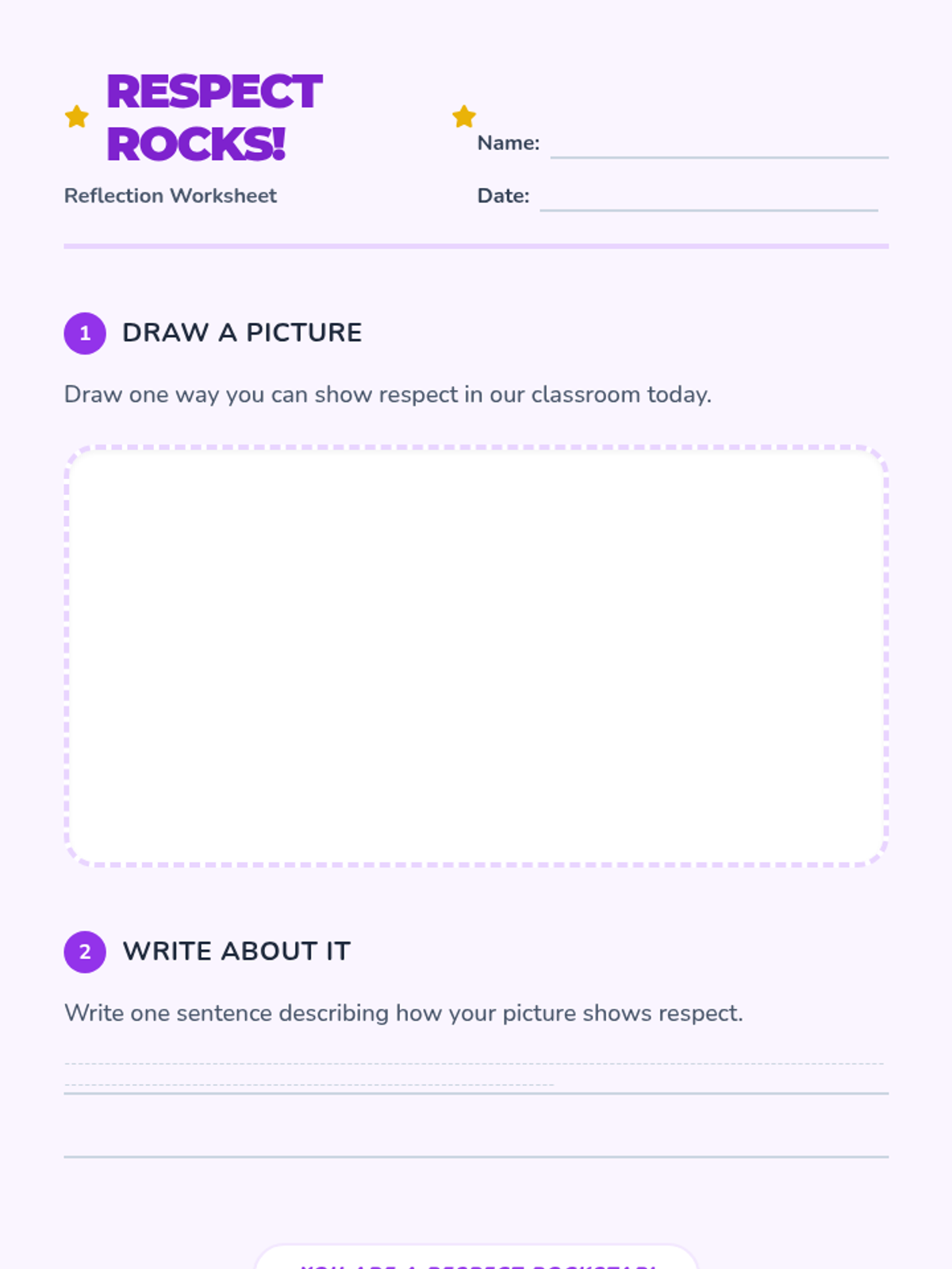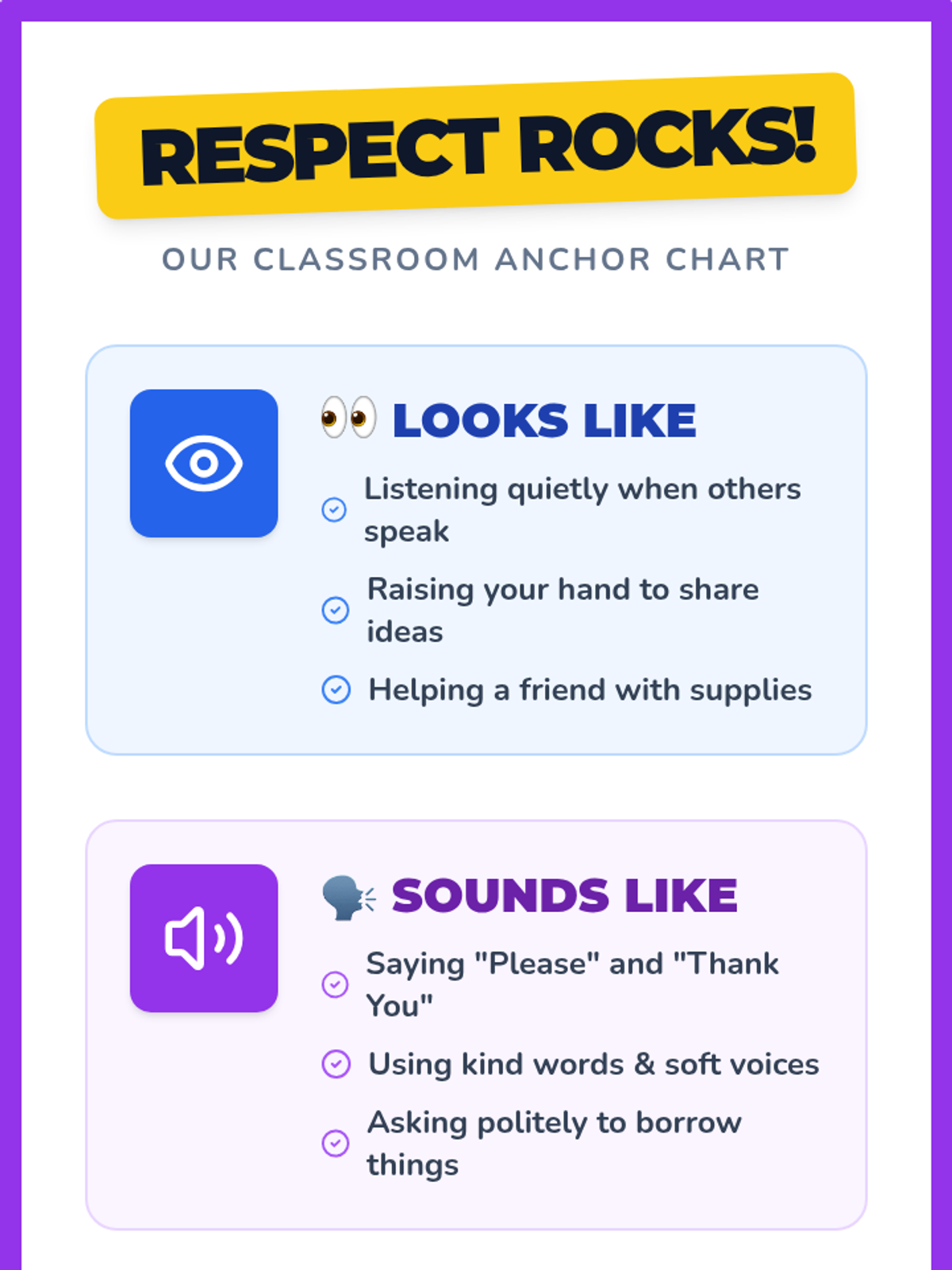 In this fun 30-minute lesson, 1st graders will learn what respectful behavior looks, sounds, and feels like in our classroom. By exploring examples and practicing through activities, students will build a foundation of kindness and cooperation that supports a positive learning environment.