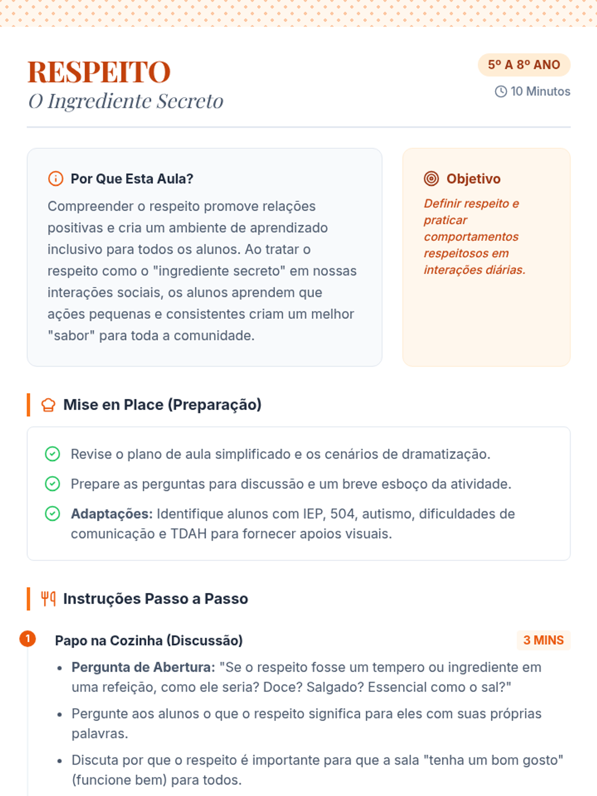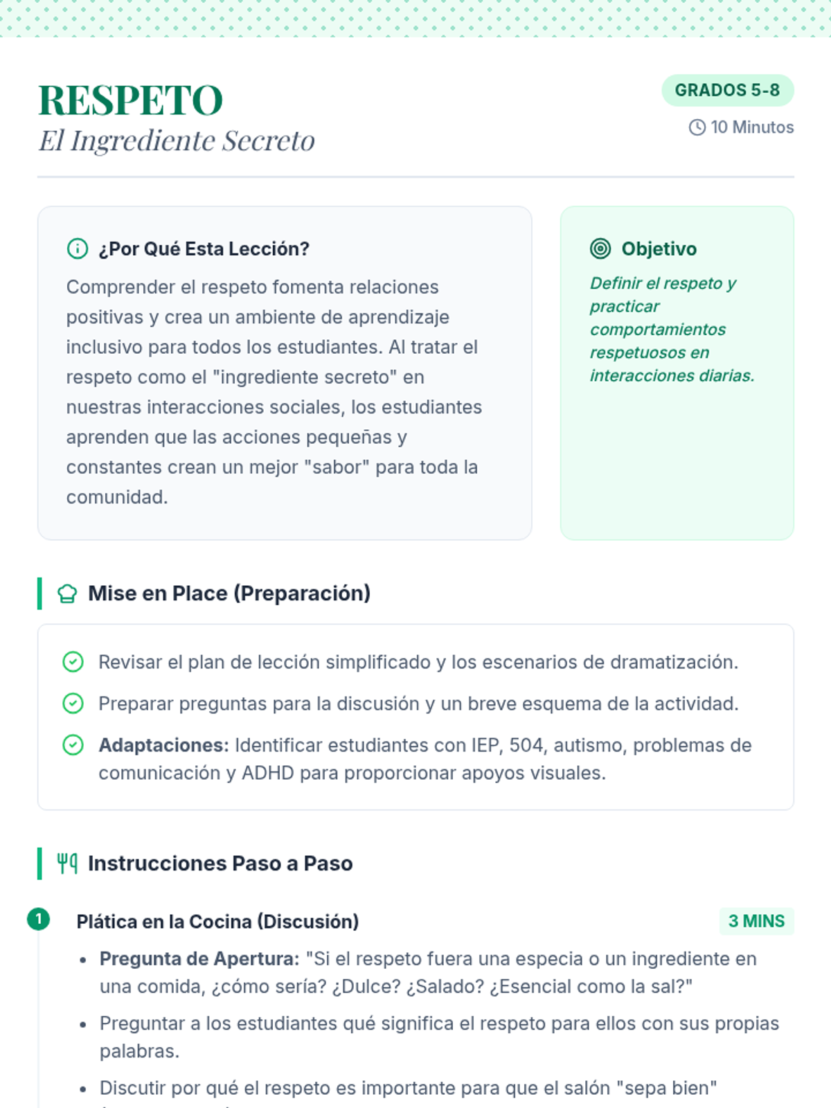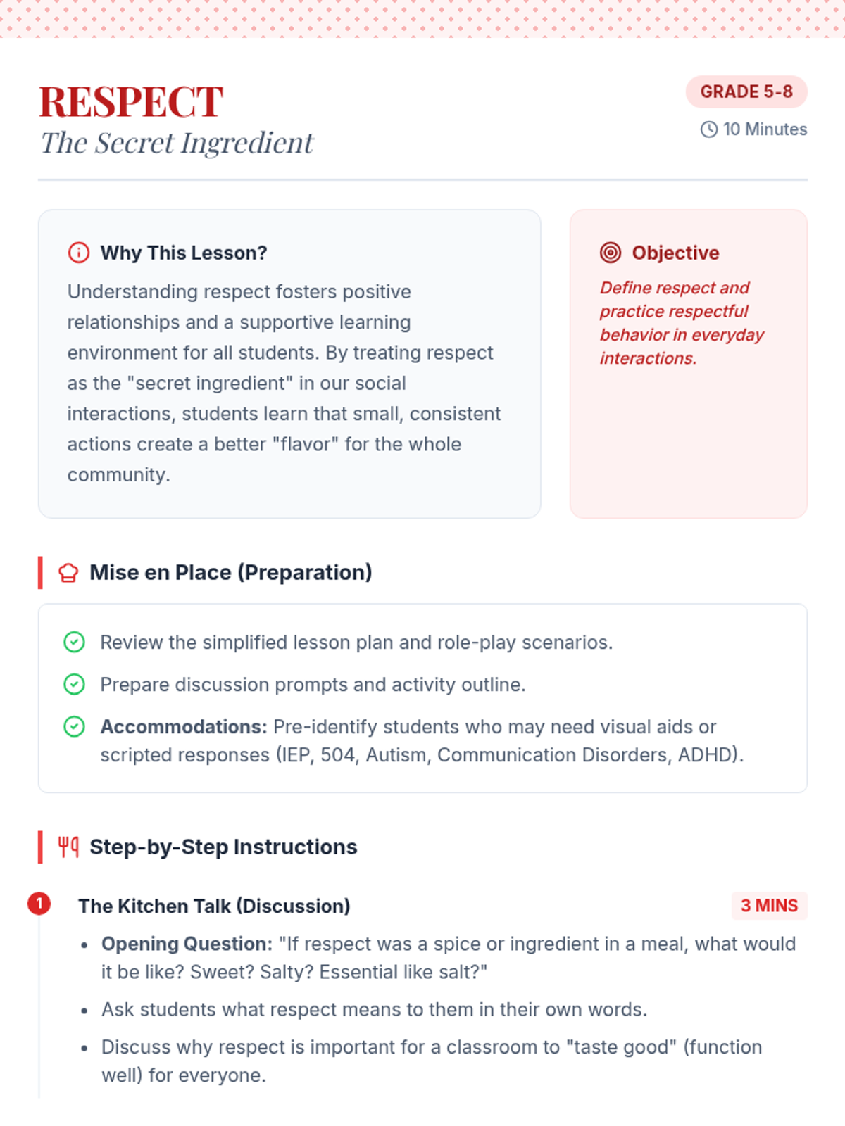 A 10-minute lesson for grades 5-8 exploring respect through a culinary-themed 'Secret Ingredient' metaphor, featuring multilingual plans and role-play activities.