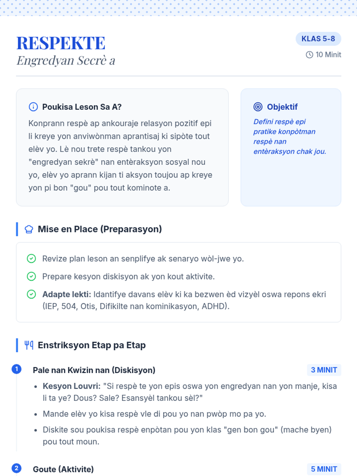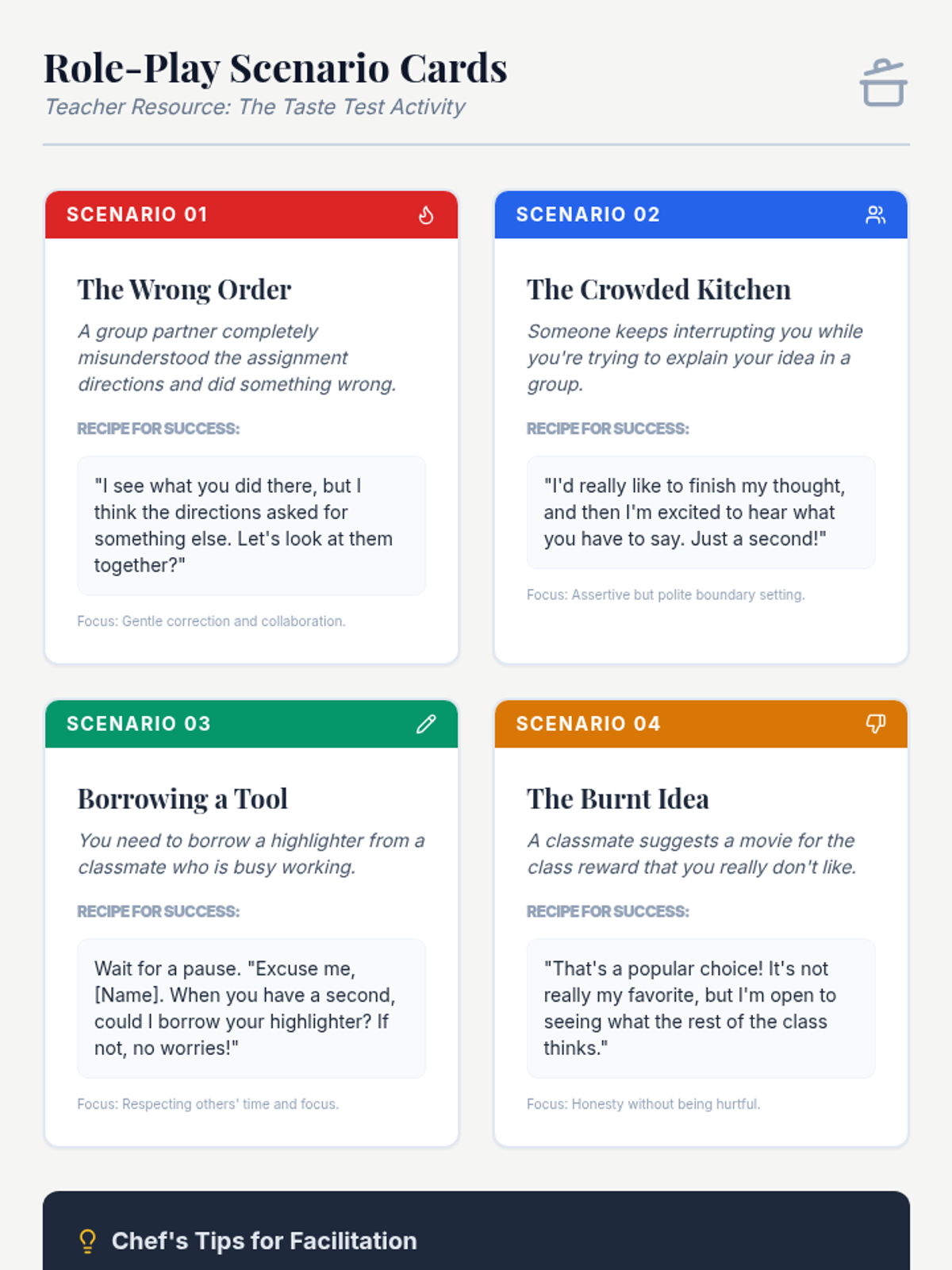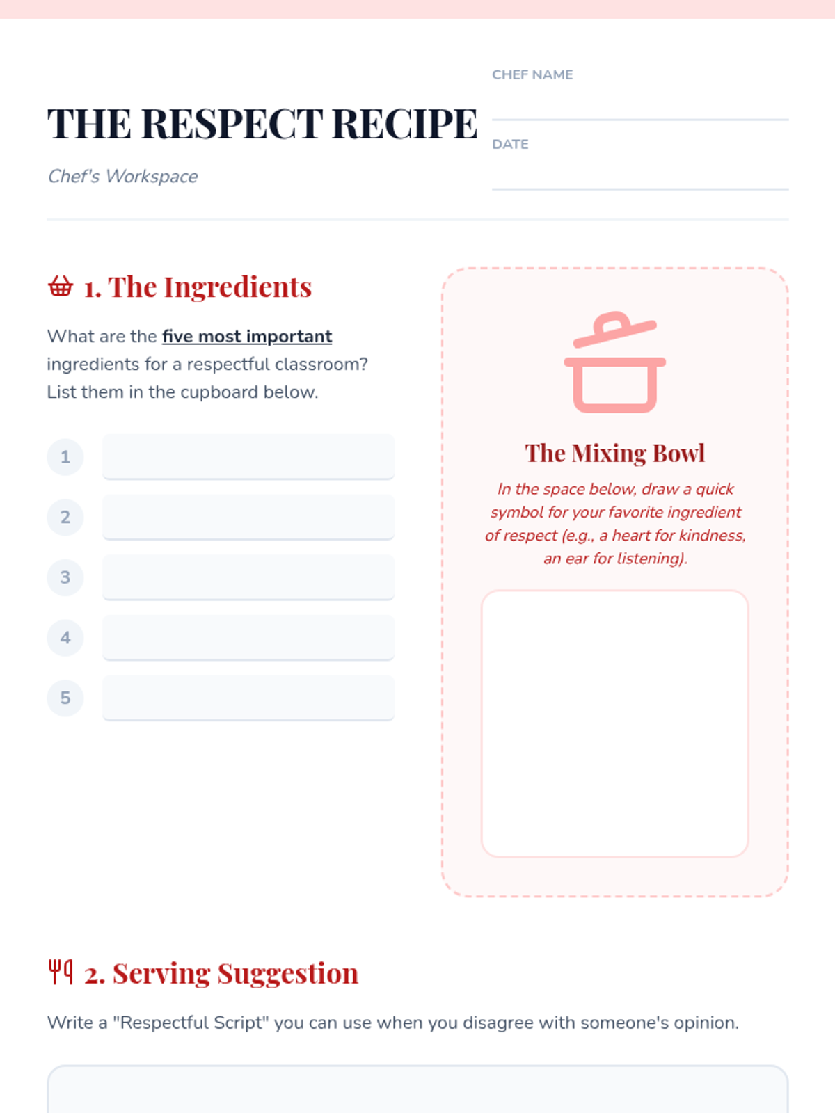 A 10-minute lesson for grades 5-8 exploring respect through a culinary-themed 'Secret Ingredient' metaphor, featuring multilingual plans and role-play activities.