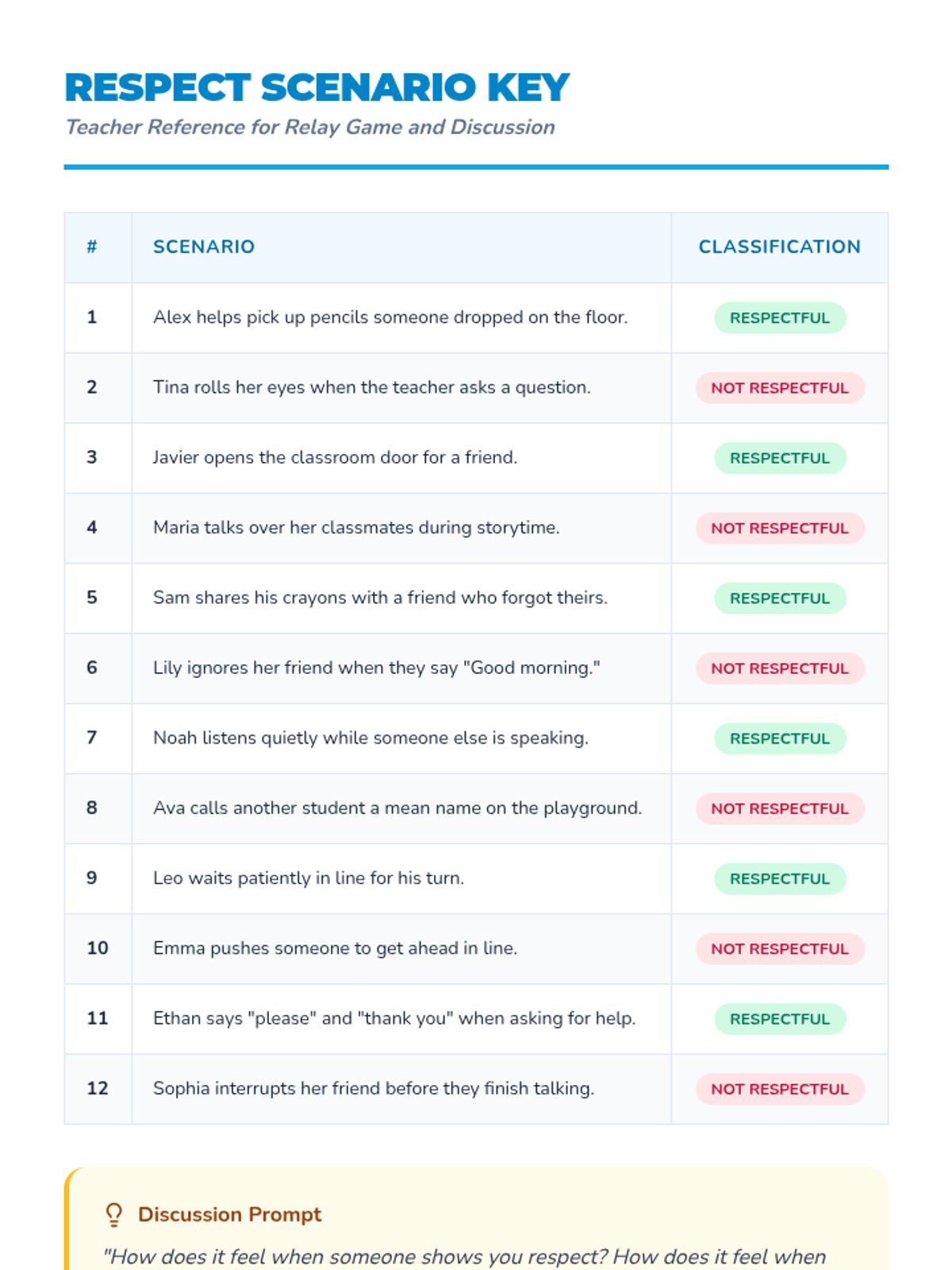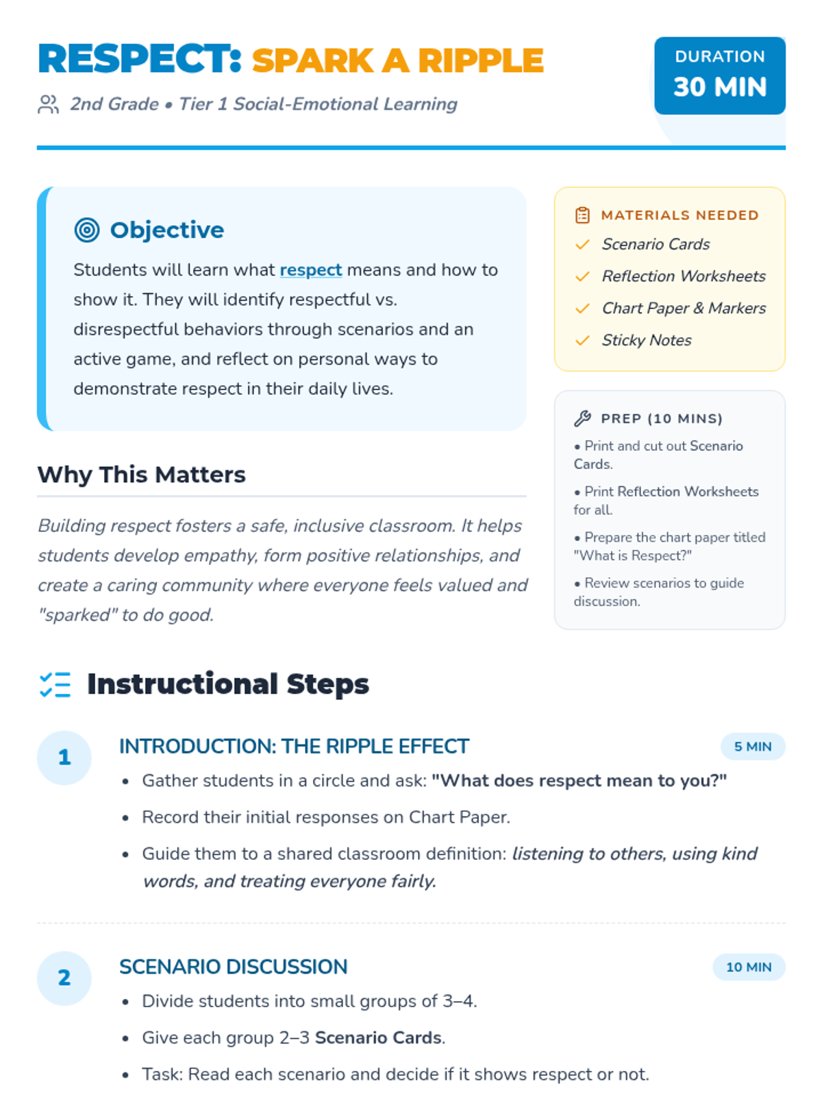 In this 30-minute Tier 1 lesson for 2nd grade, students will explore the concept of respect through discussion, games, and reflection. Understanding respect helps students build positive relationships and a caring classroom environment.