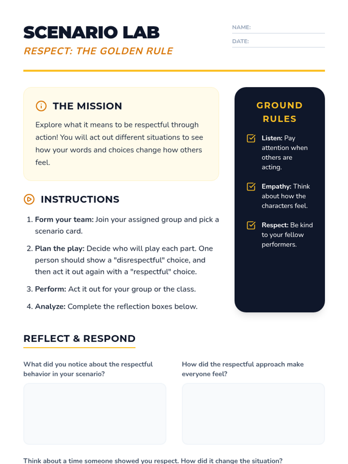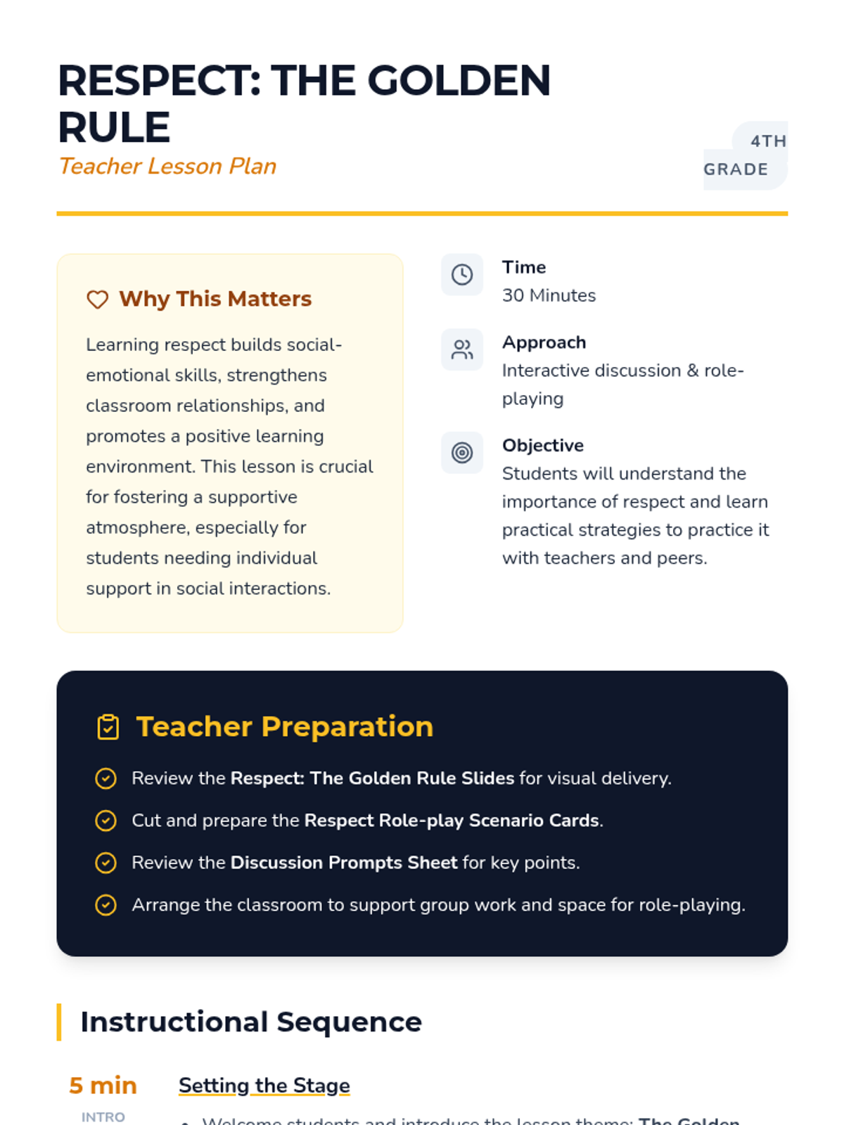 A 4th-grade lesson focused on the importance of respect for teachers and peers, teaching practical strategies to foster a positive classroom environment through the 'Golden Rule'.