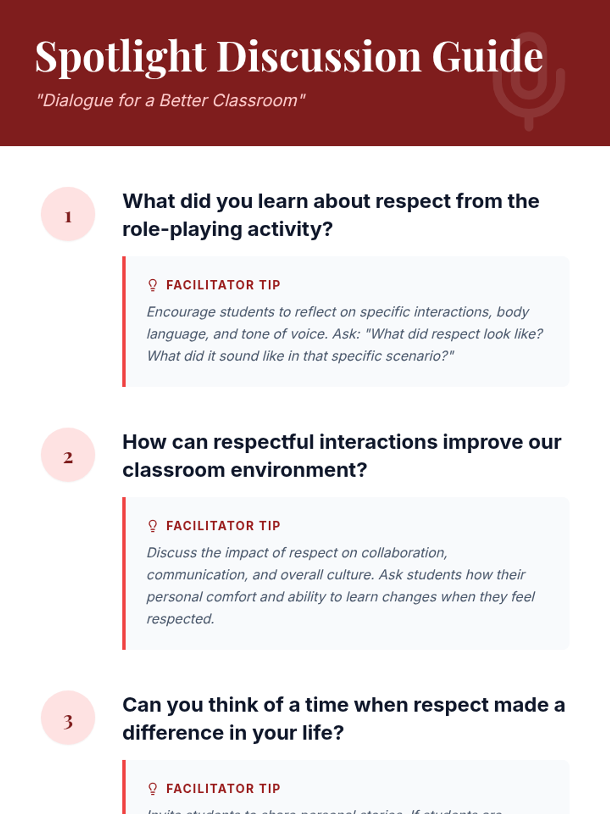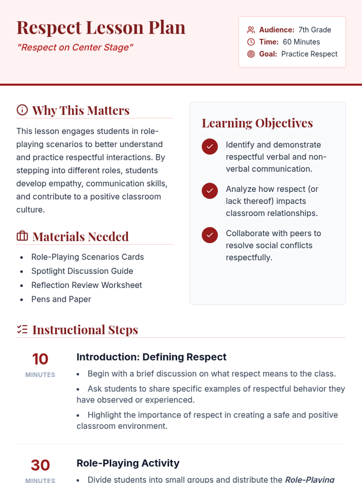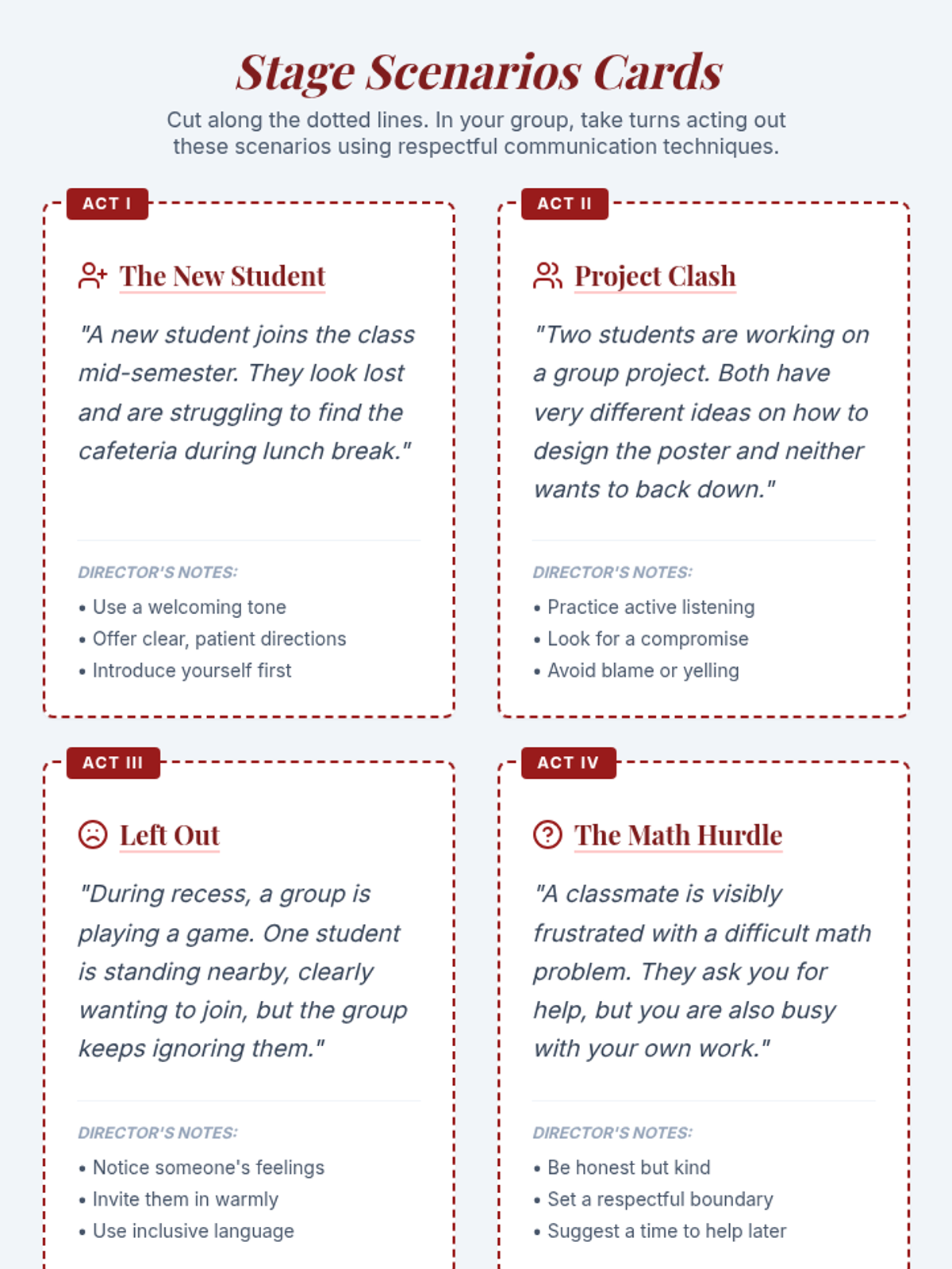 A 60-minute interactive lesson for 7th-graders focusing on empathy and communication through theatrical role-playing scenarios to build a respectful classroom culture.