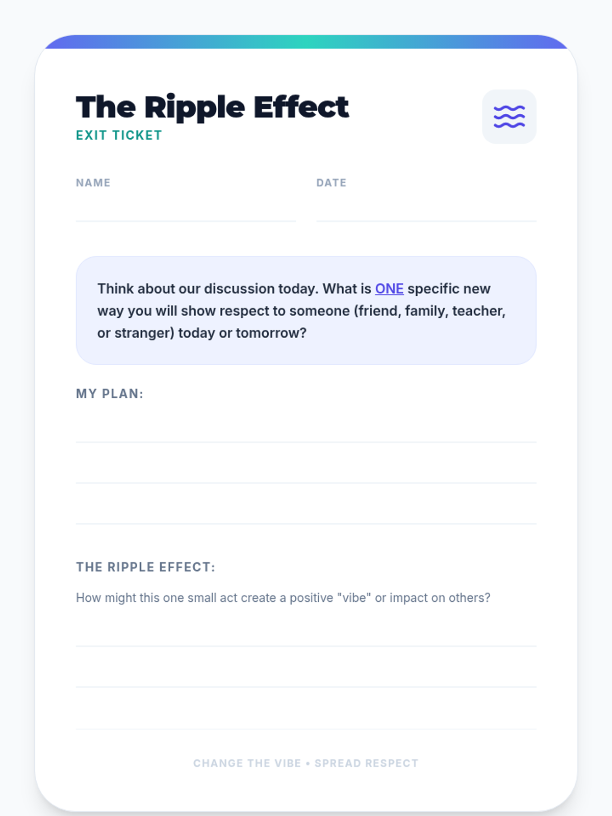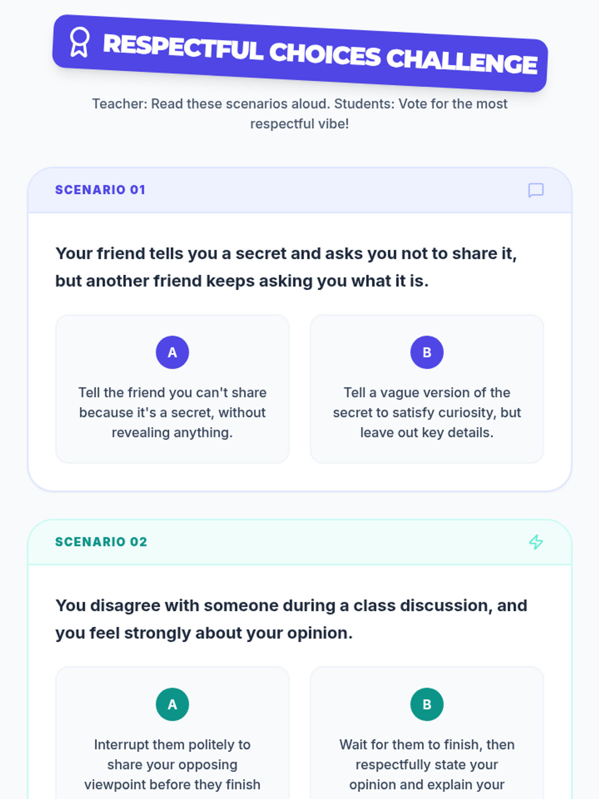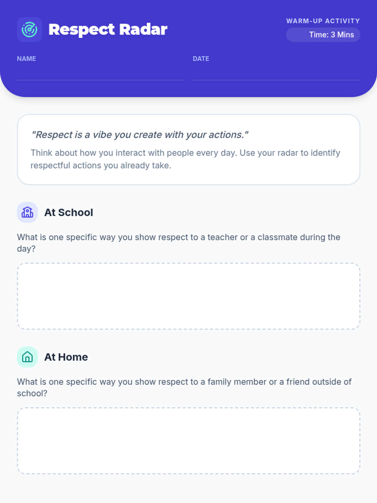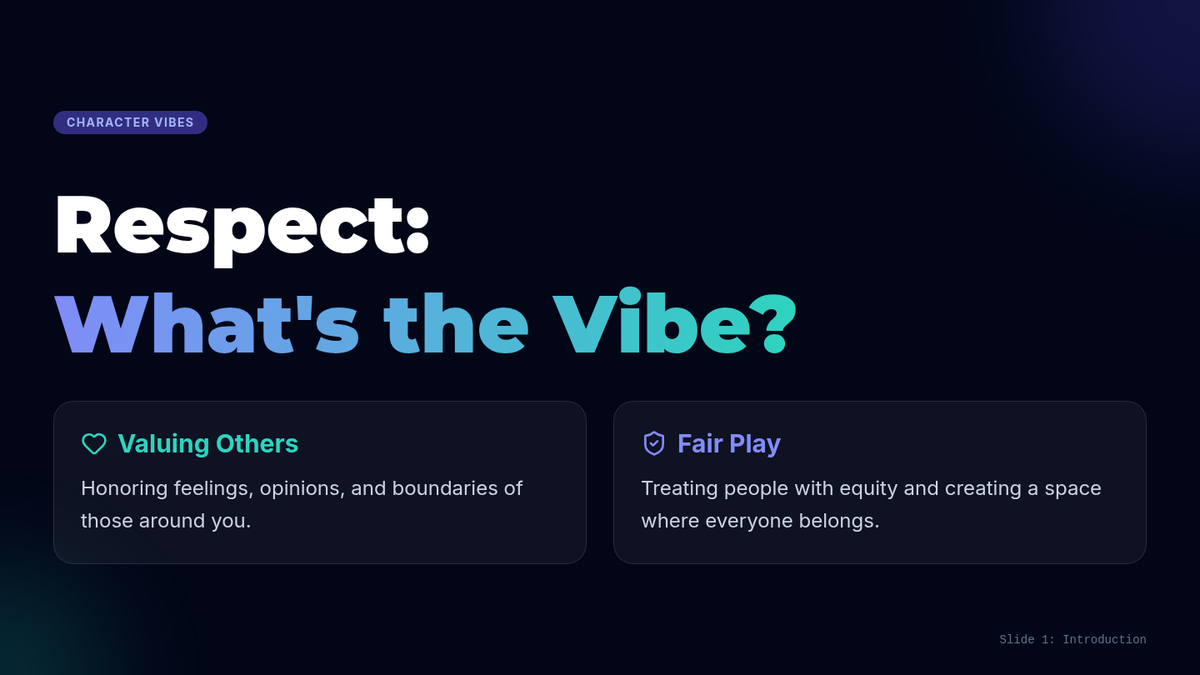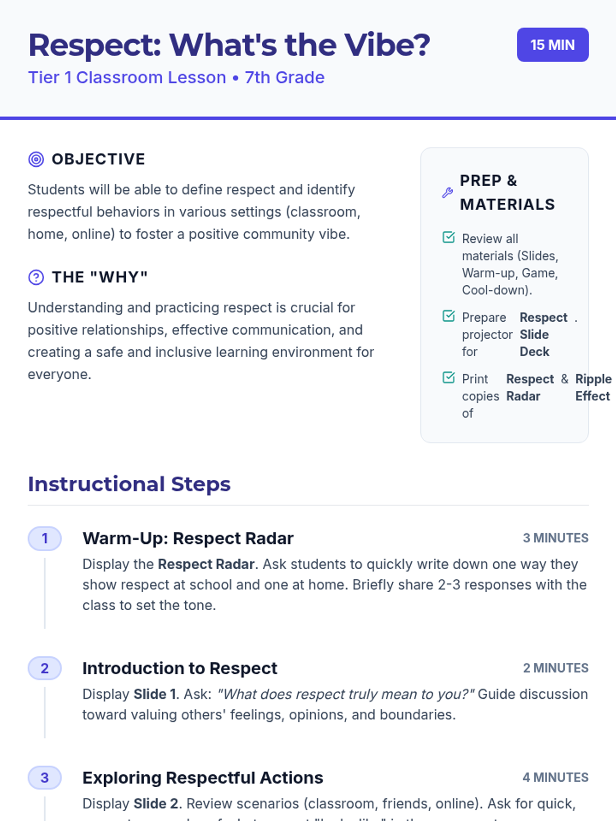 A quick, interactive 15-minute lesson for 7th graders to define respect and identify respectful behaviors through discussion, a scenario-based game, and personal reflection.