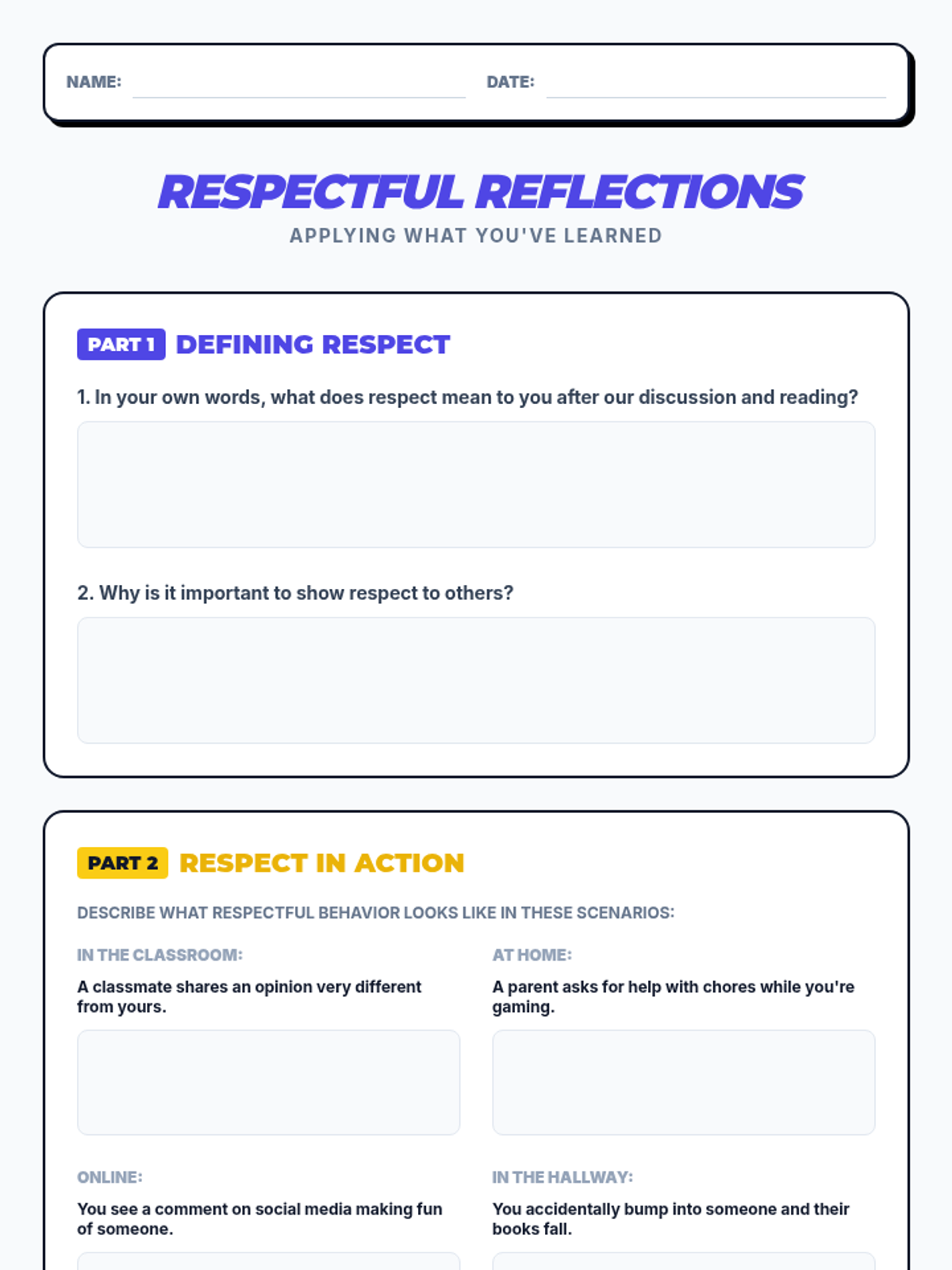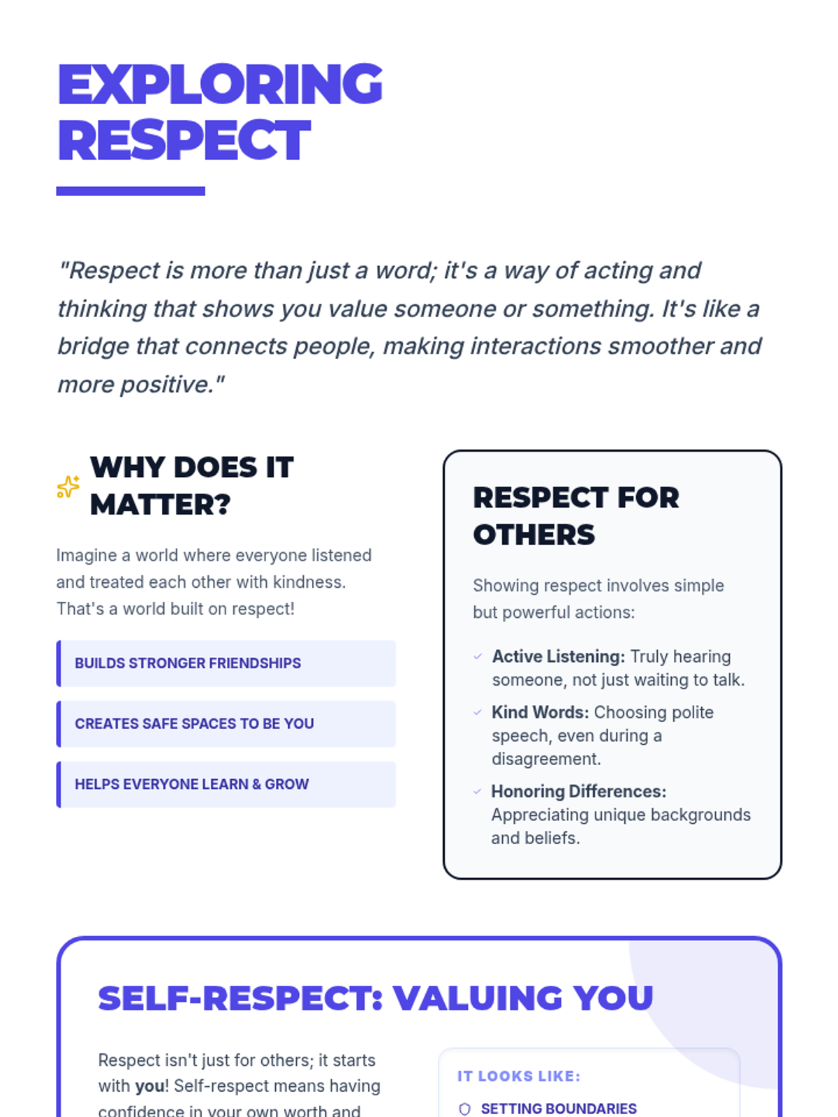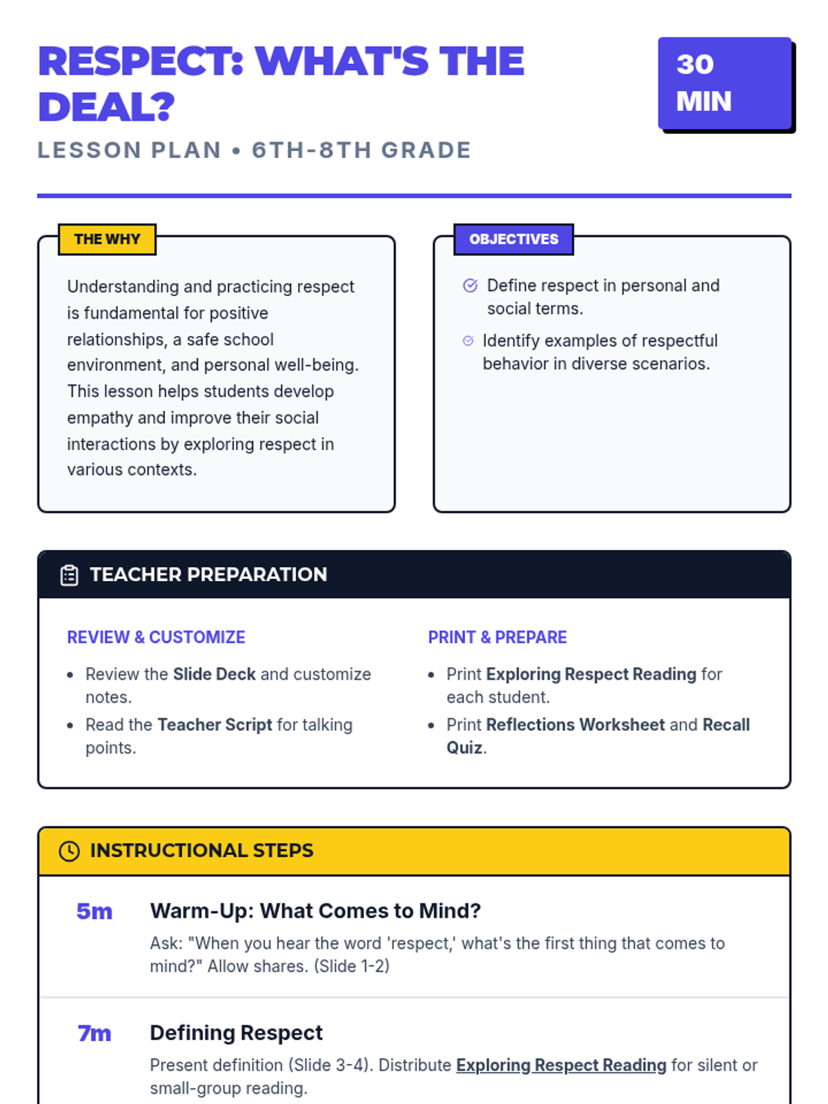 A 30-minute lesson for 6th-8th graders that explores the definition, components, and practical application of respect in daily life.