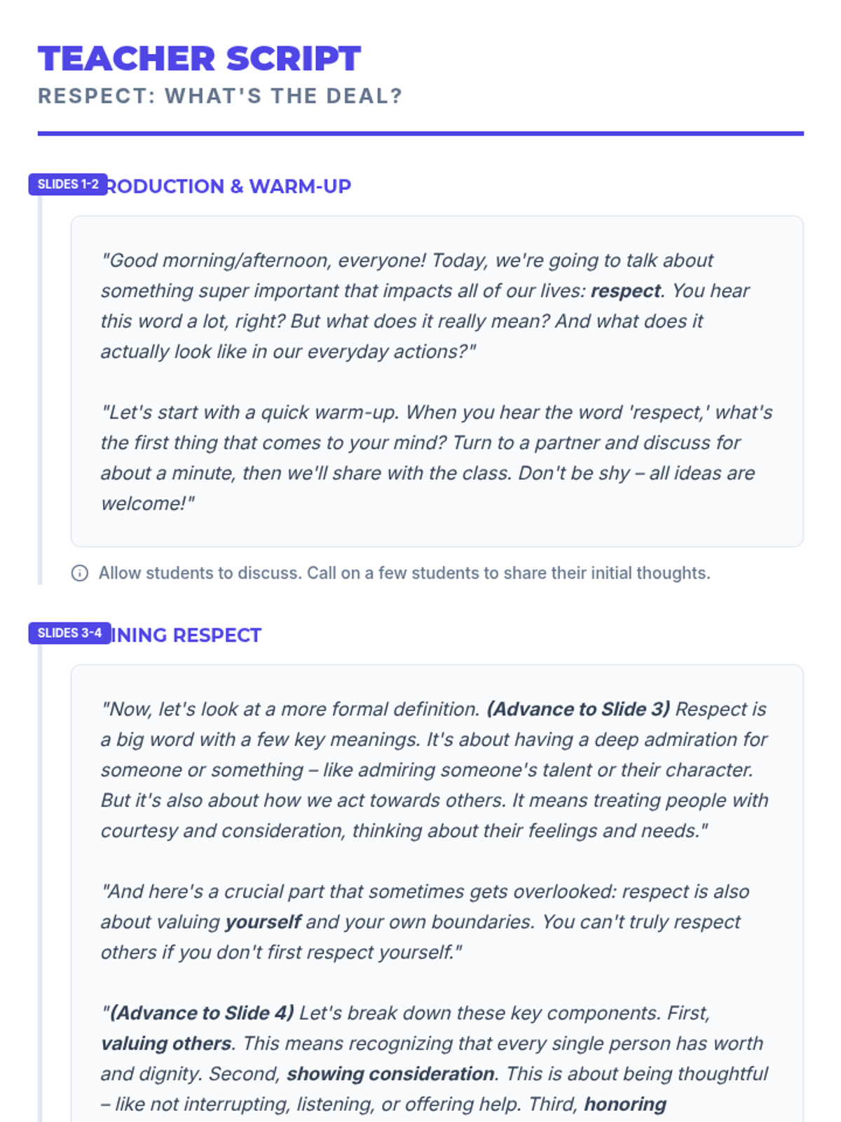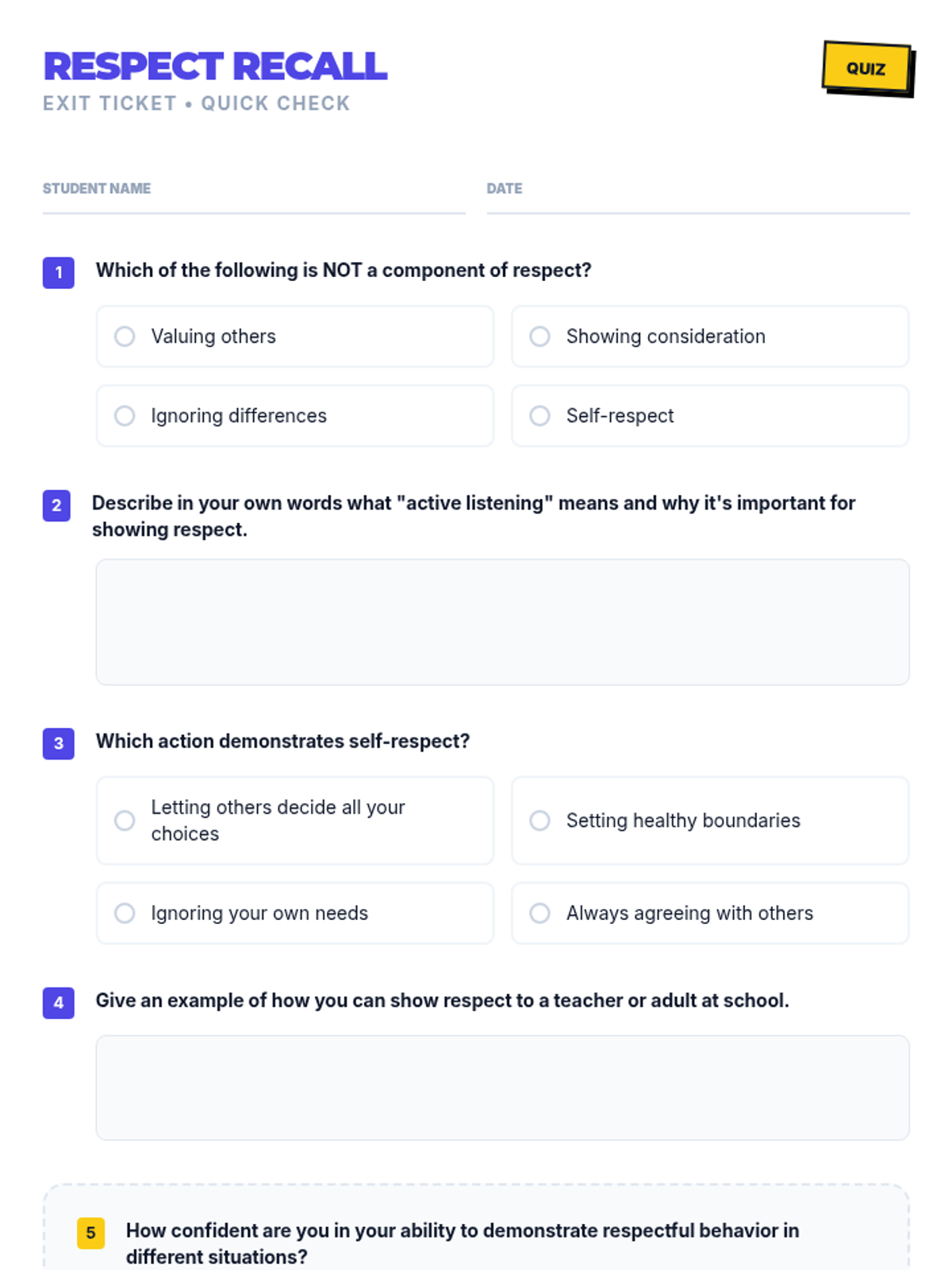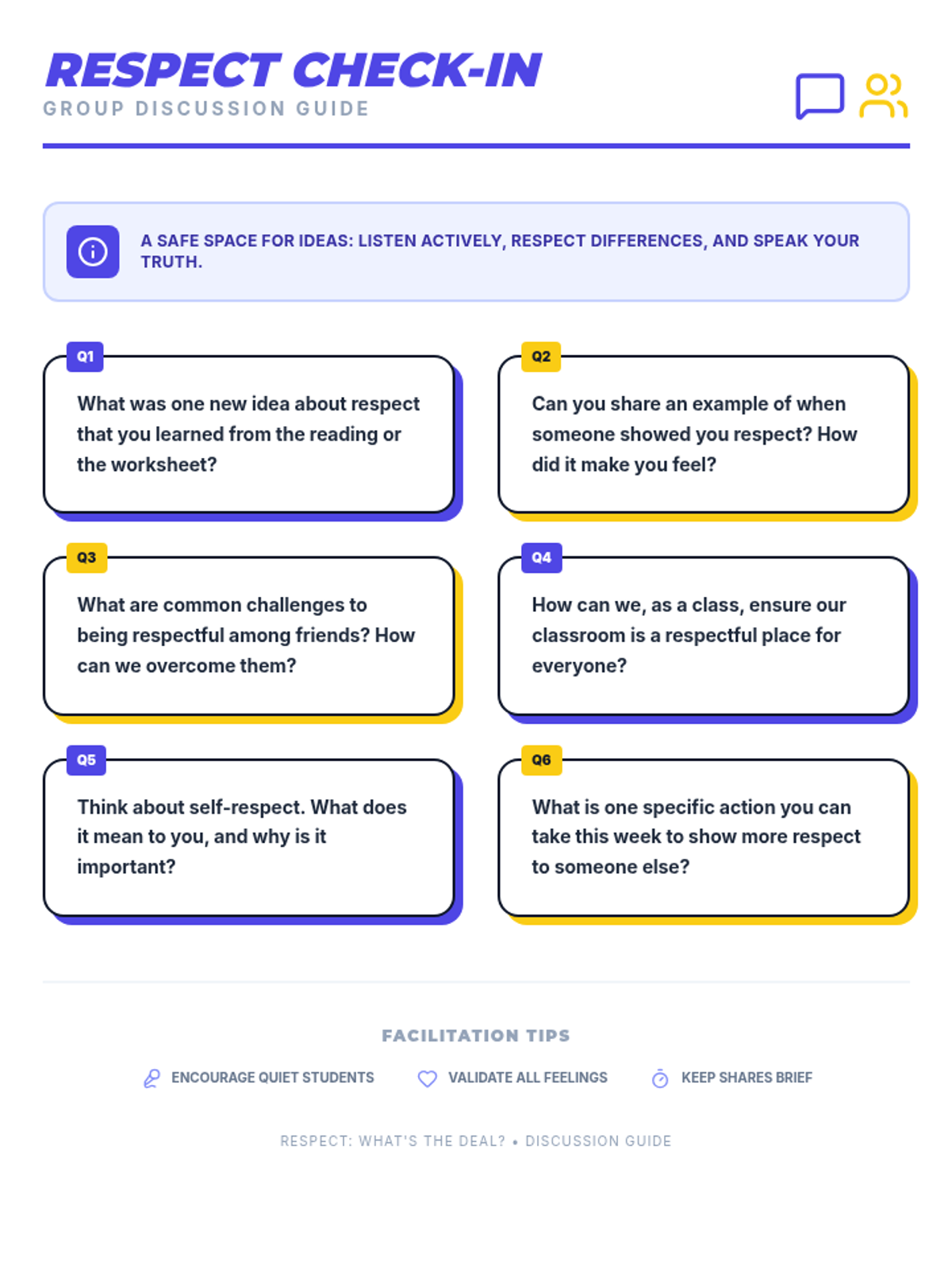 A 30-minute lesson for 6th-8th graders that explores the definition, components, and practical application of respect in daily life.