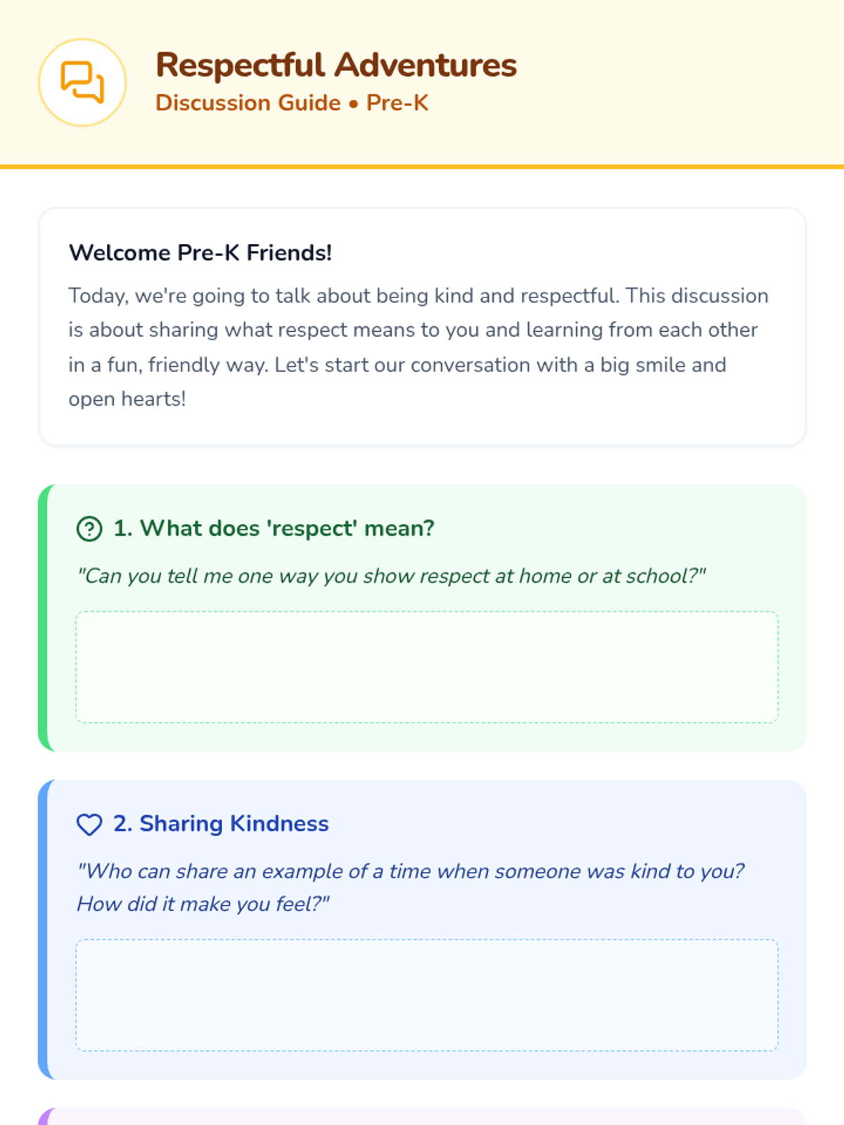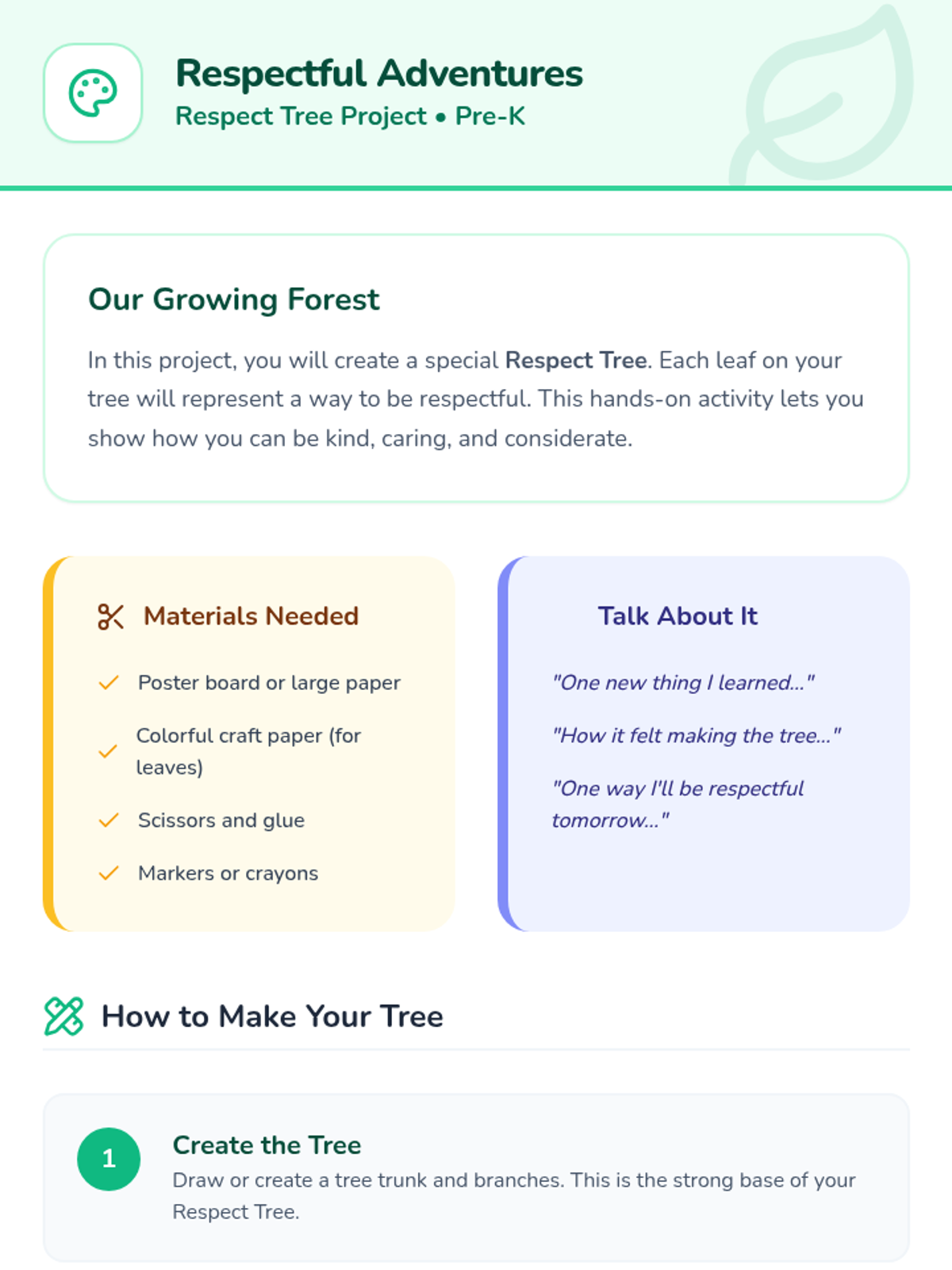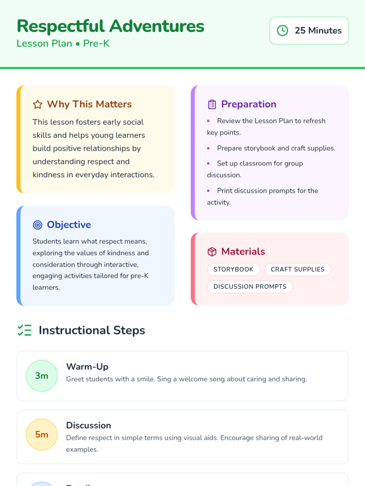A 25-minute interactive lesson for pre-K students exploring respect, kindness, and consideration through storytelling, role-play, and a creative 'Respect Tree' project.