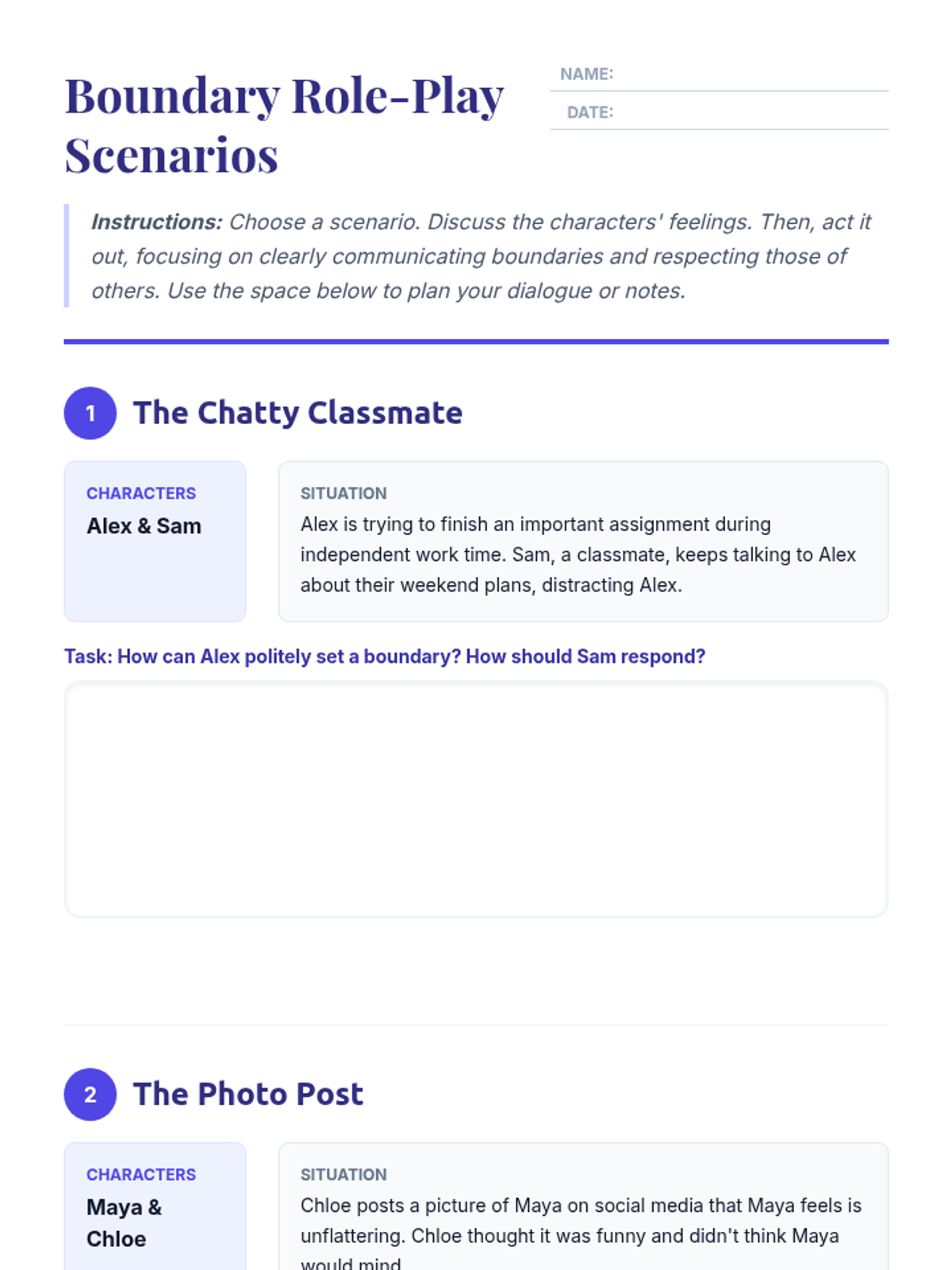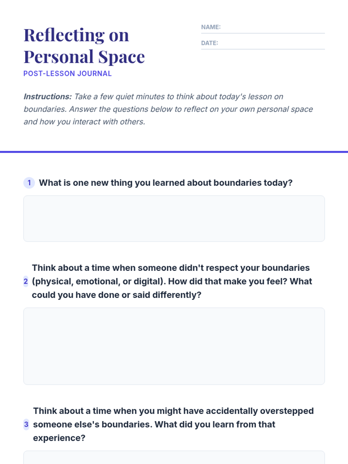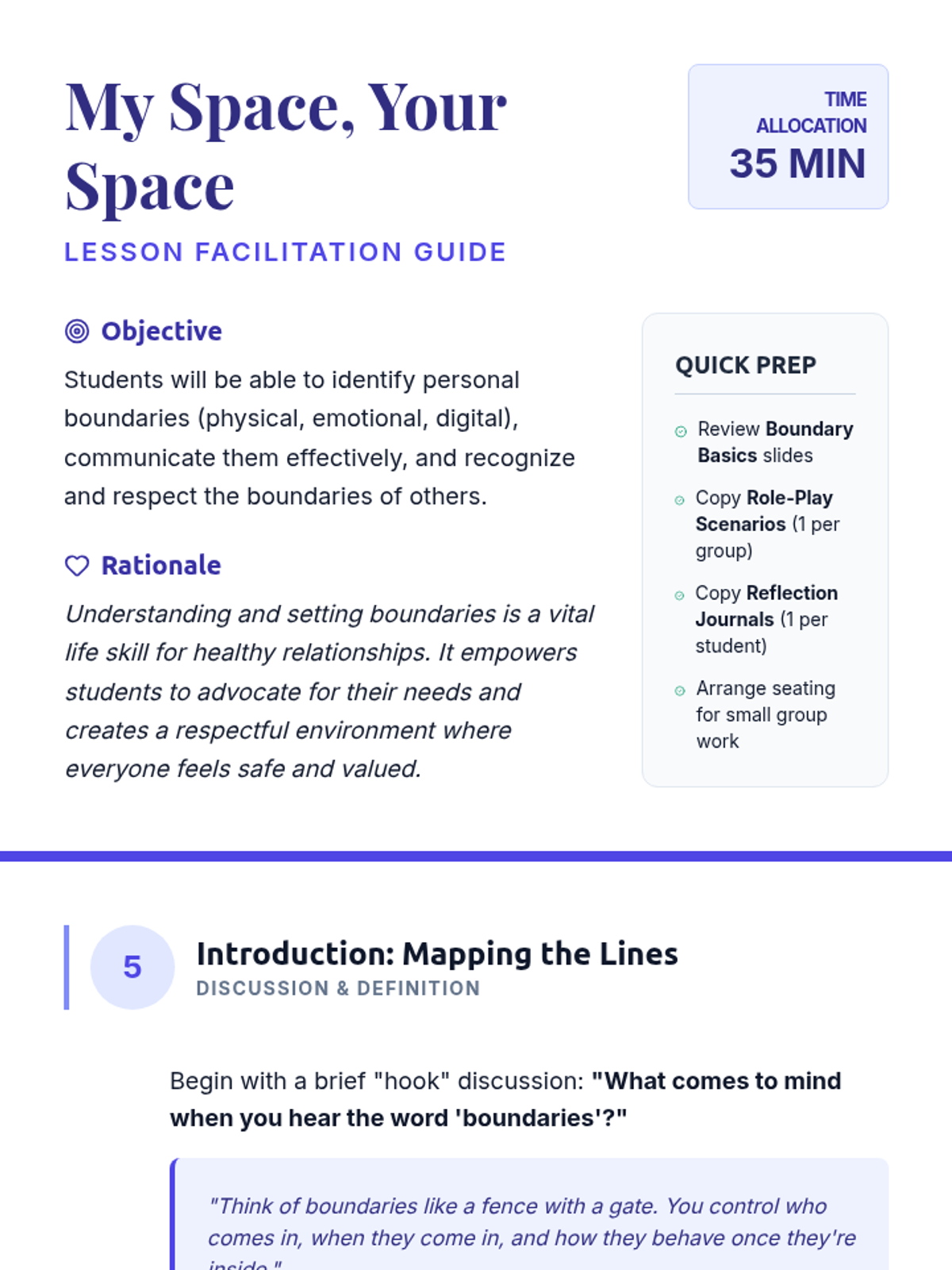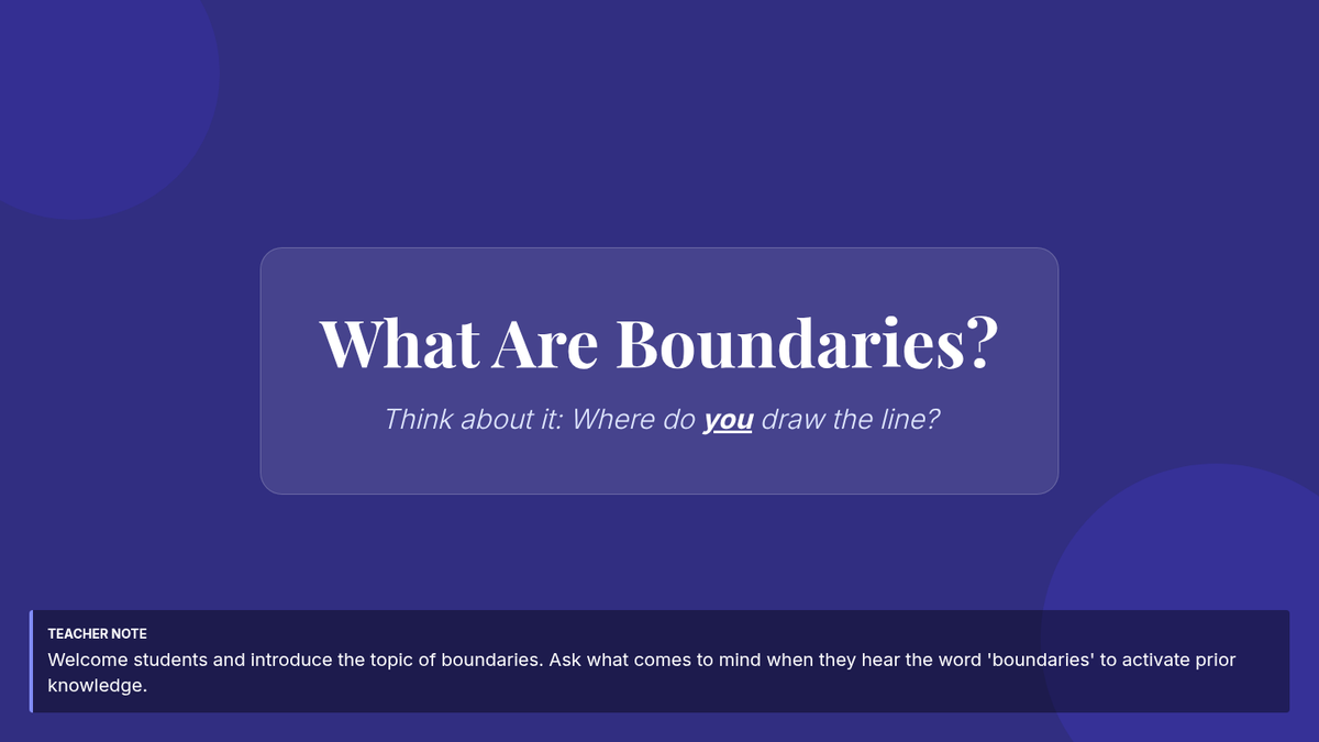 A 35-minute small group lesson for 8th-grade students focused on identifying, communicating, and respecting physical, emotional, and digital boundaries.