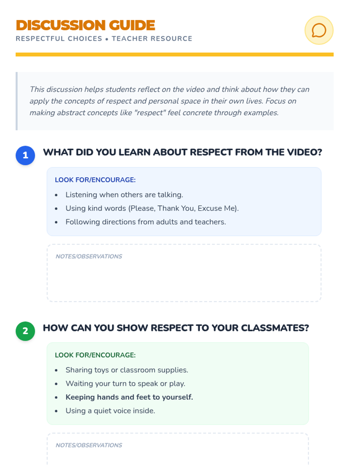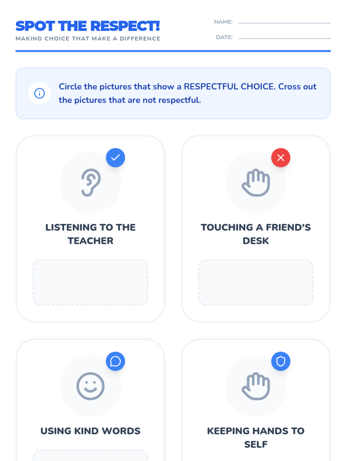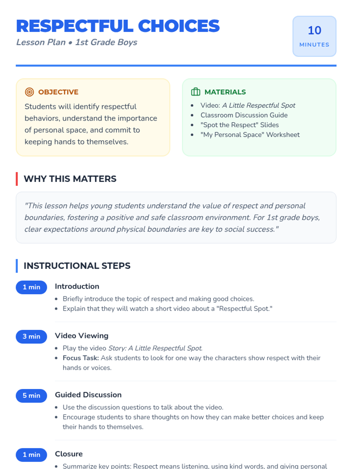 A short, impactful lesson for 1st grade boys focused on respect, personal space, and making positive choices using the 'A Little Respectful Spot' concept.