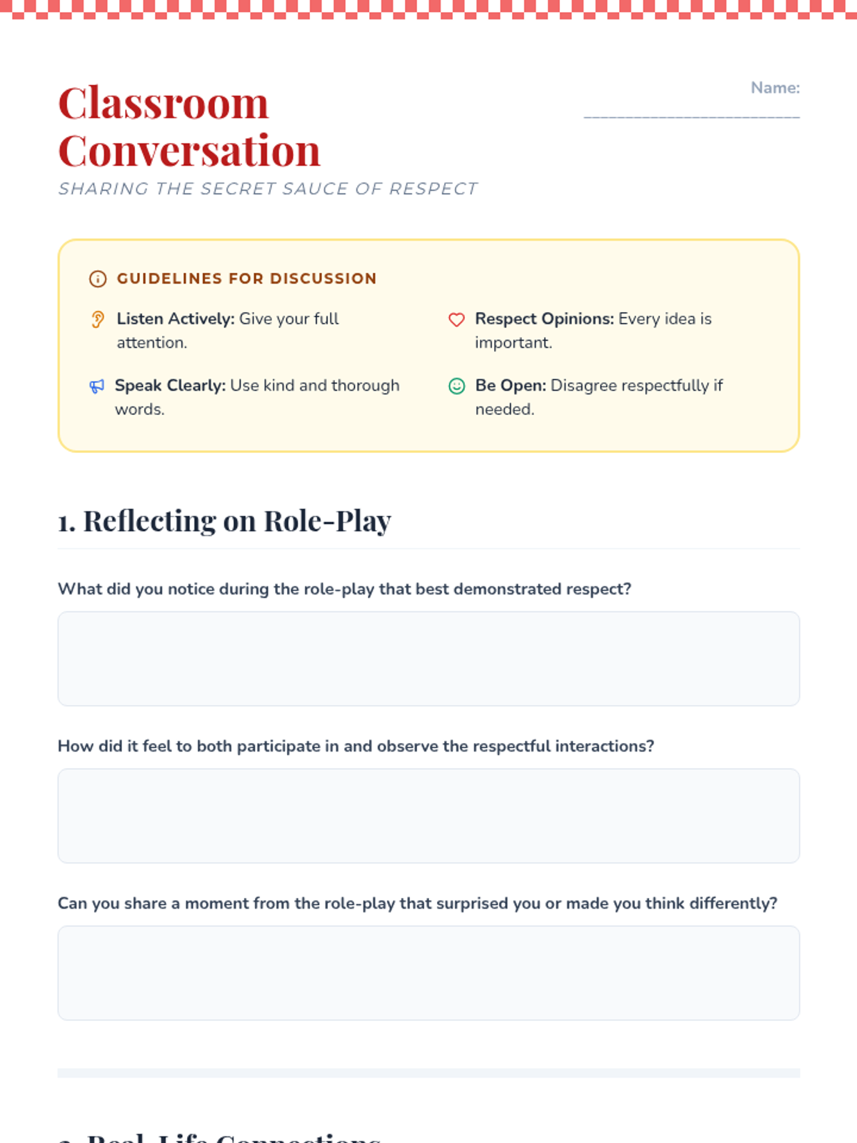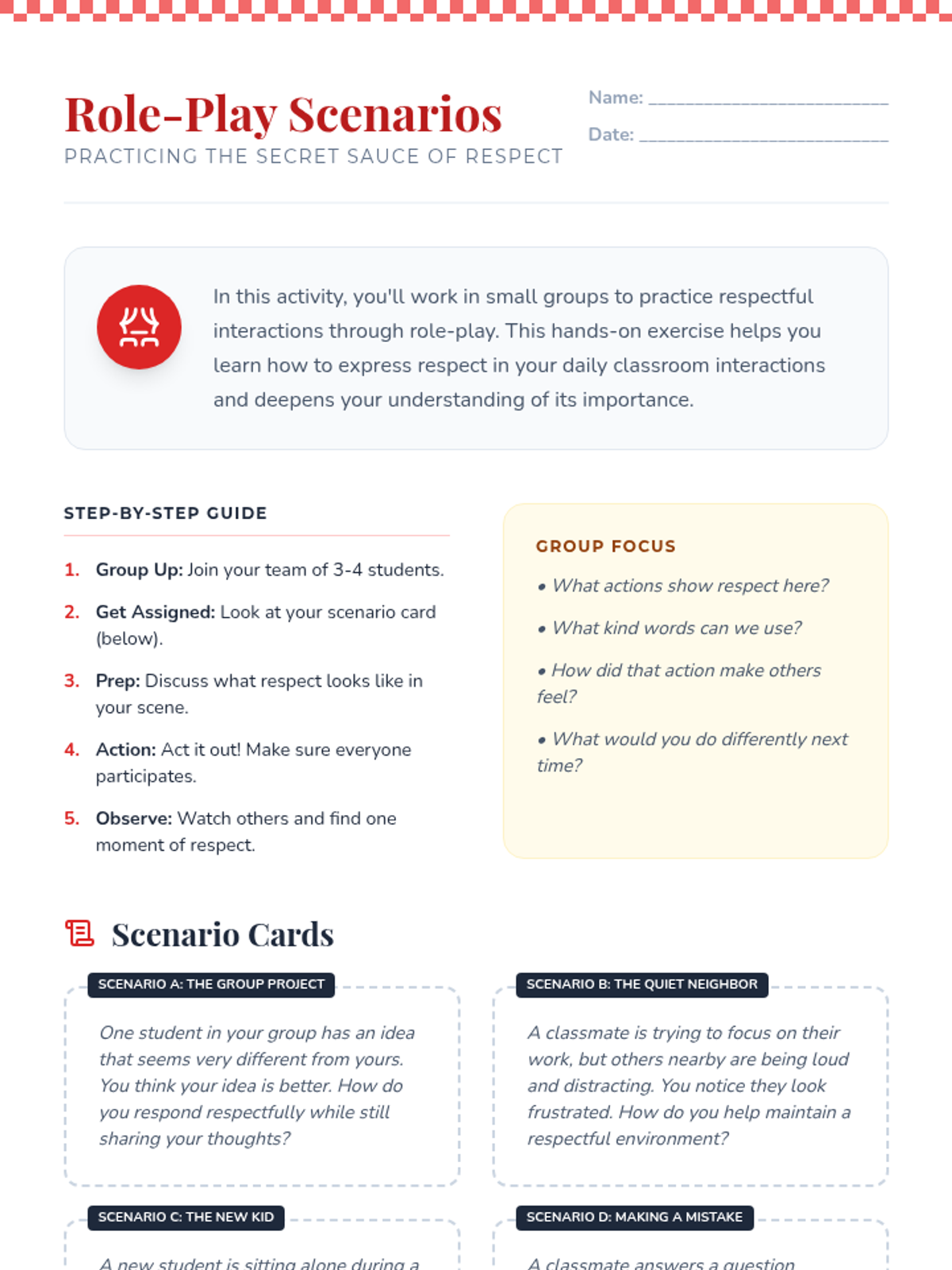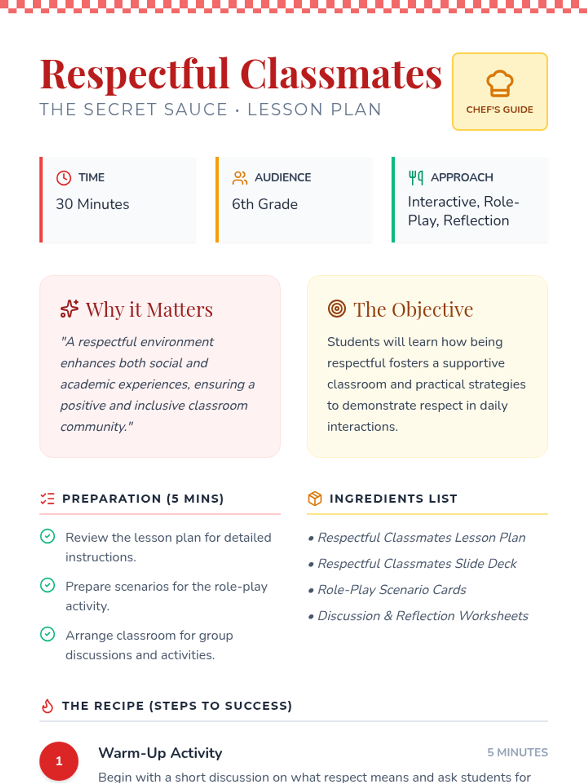 A comprehensive lesson for 6th graders to understand and practice respectful classroom behavior using a "Secret Sauce" culinary theme. Students engage in brainstorming, role-play scenarios, and reflective discussions to build a supportive community.