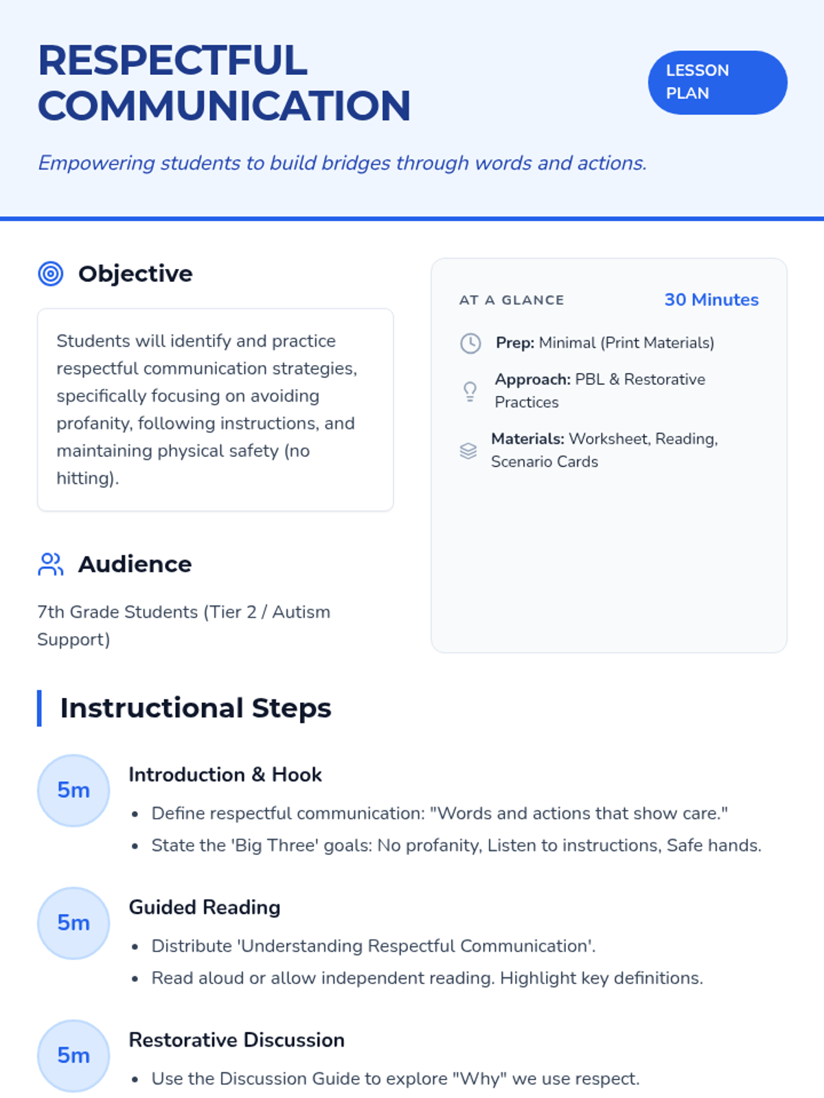 A Tier 2 social-emotional learning lesson for 7th graders with autism, focusing on respectful communication, following instructions, and physical safety using PBL and Restorative Practices.
