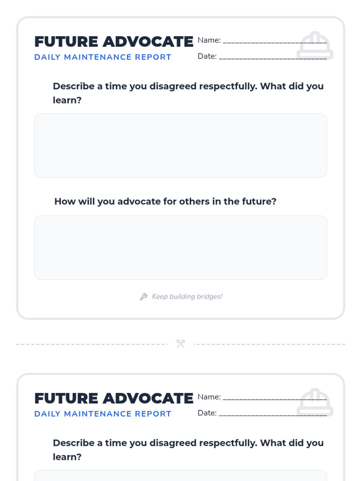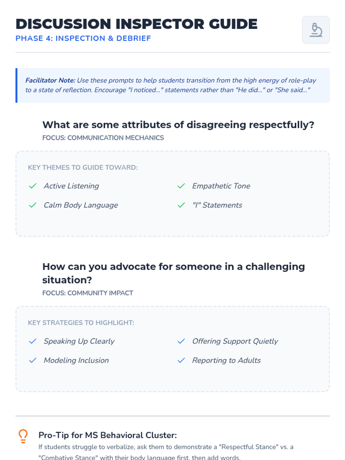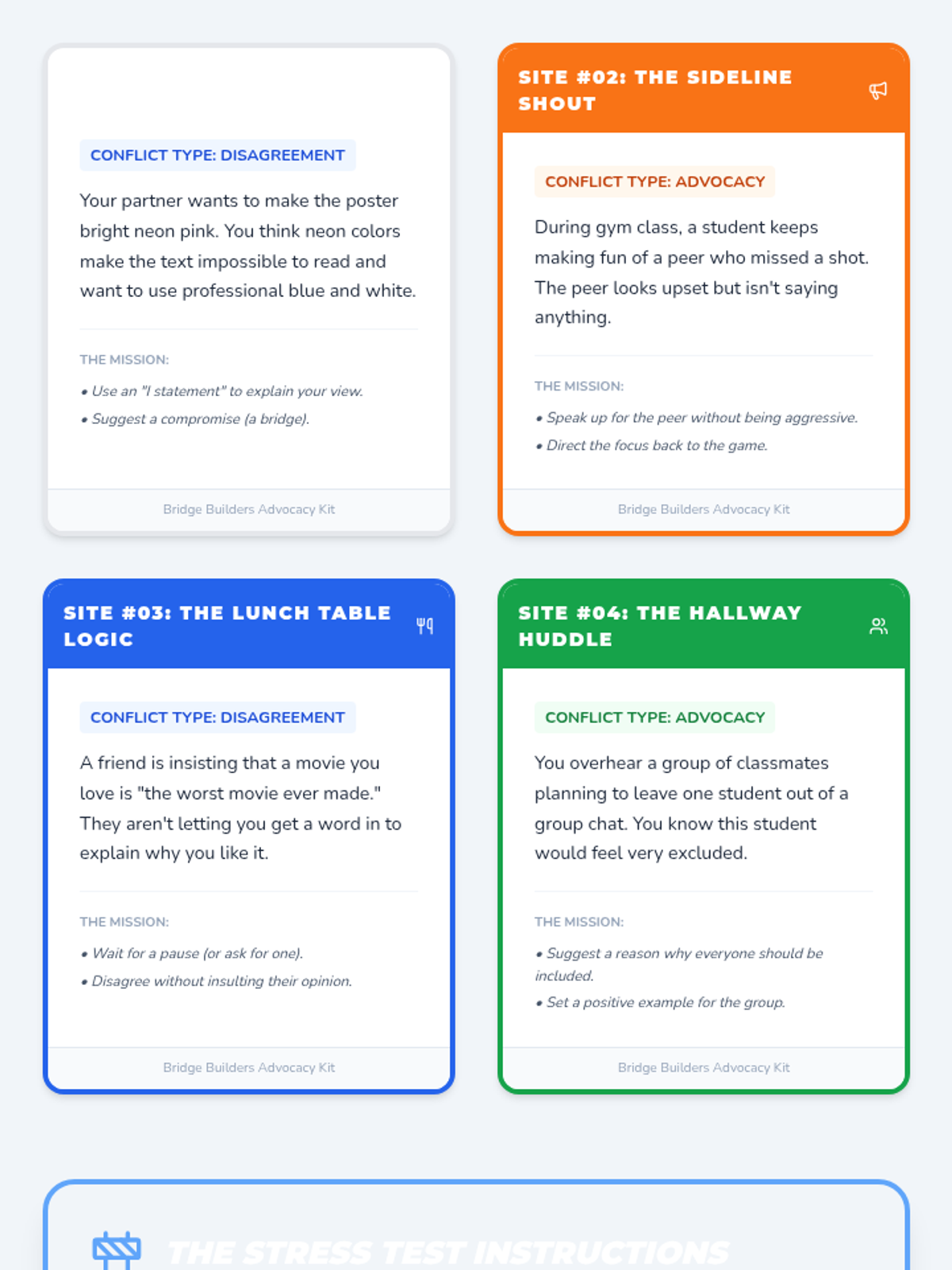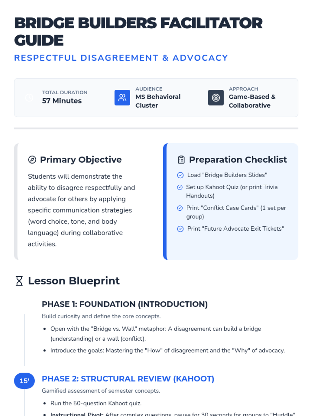 A comprehensive lesson for middle school students on the art of respectful disagreement and advocating for others. Using a 'Bridge Builders' theme, students explore communication strategies, role-play real-world scenarios, and reflect on their impact on classroom culture.