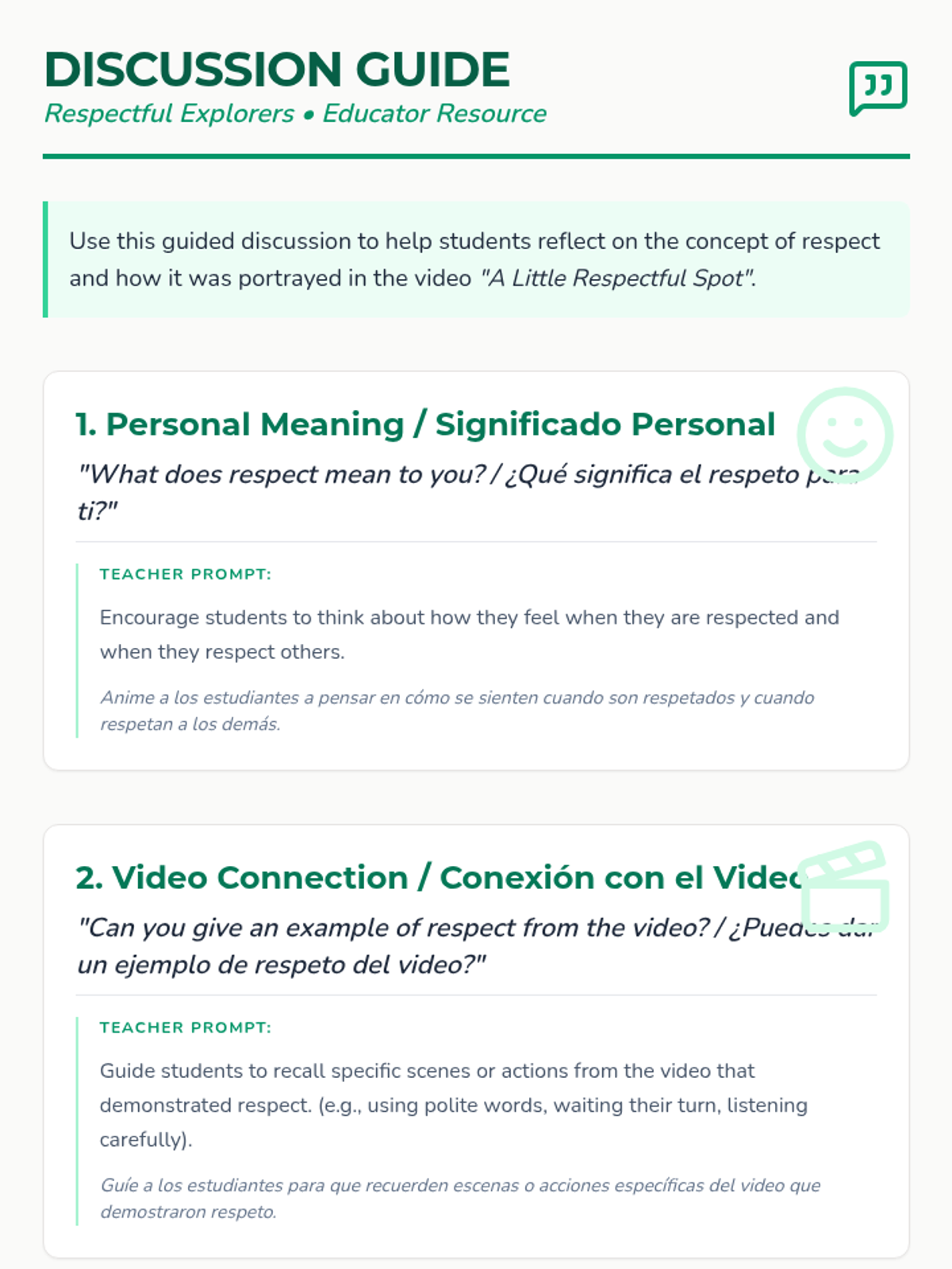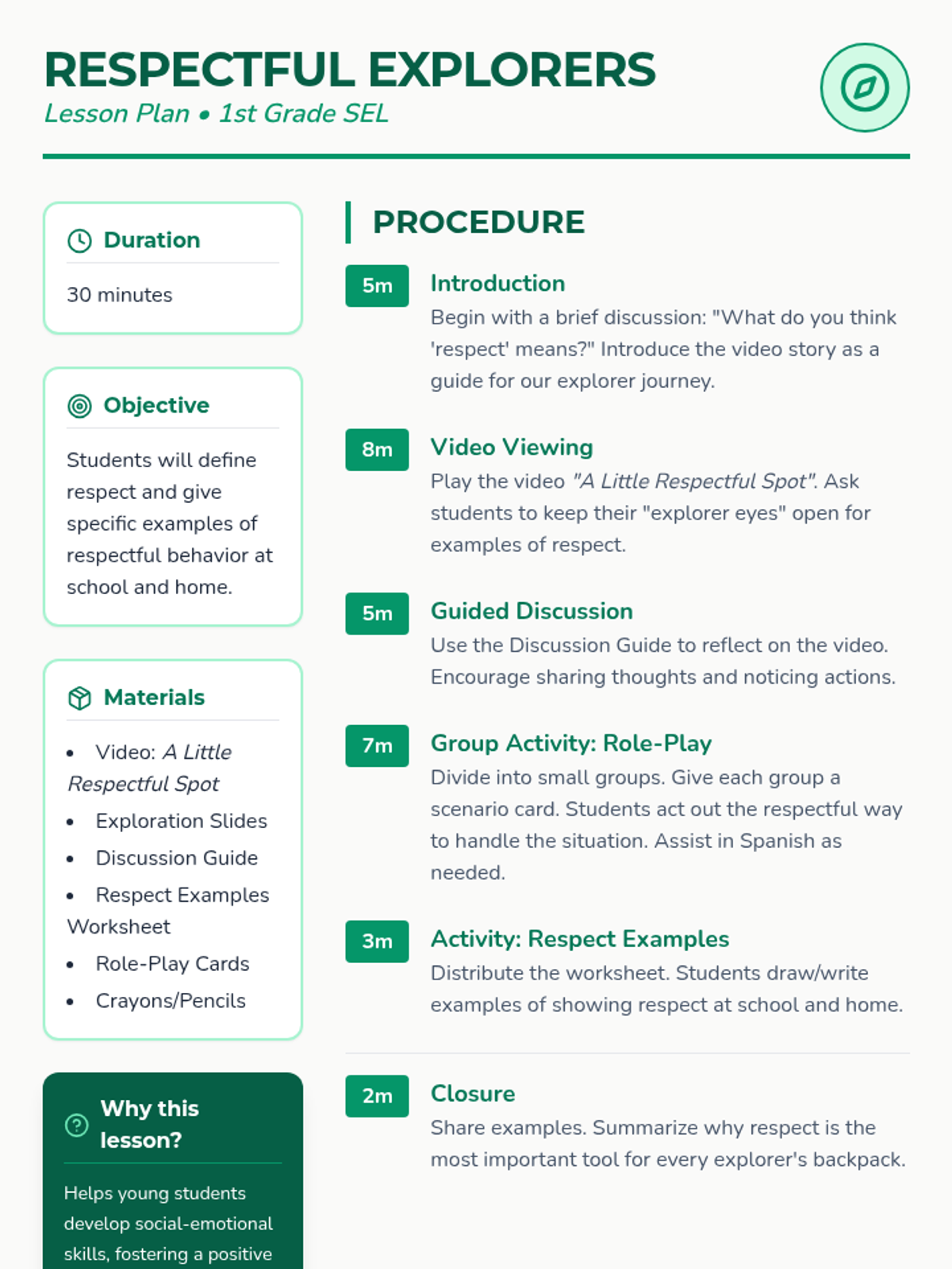 Students will learn about the concept of respect through a story video, guided discussion, and role-playing. This 1st-grade lesson focuses on identifying respectful behaviors at school and home to build a positive classroom culture.