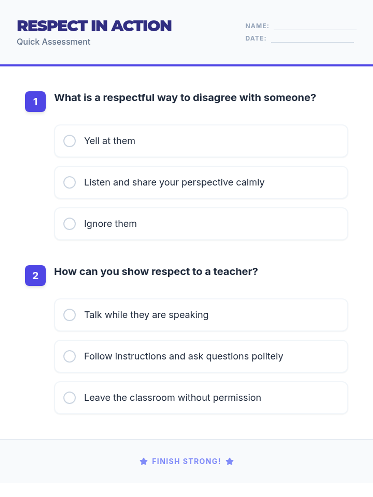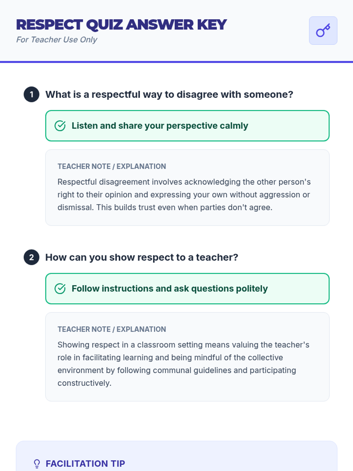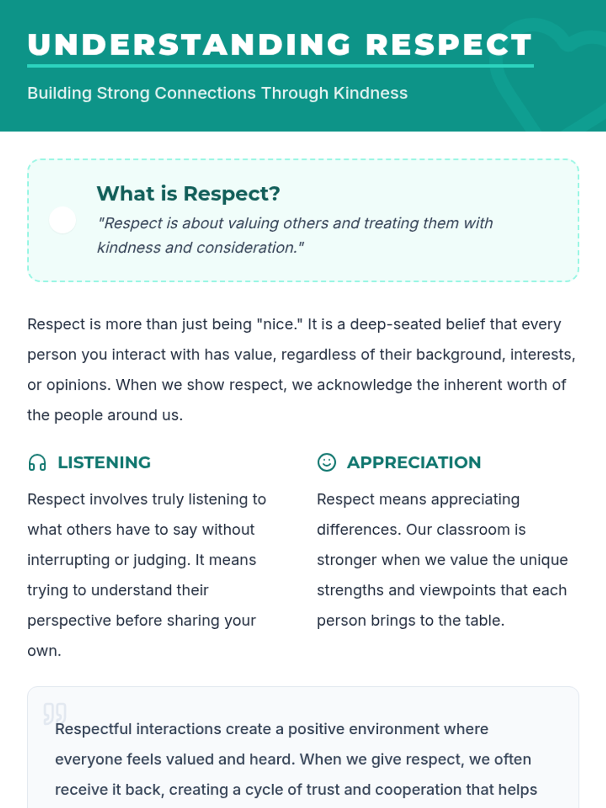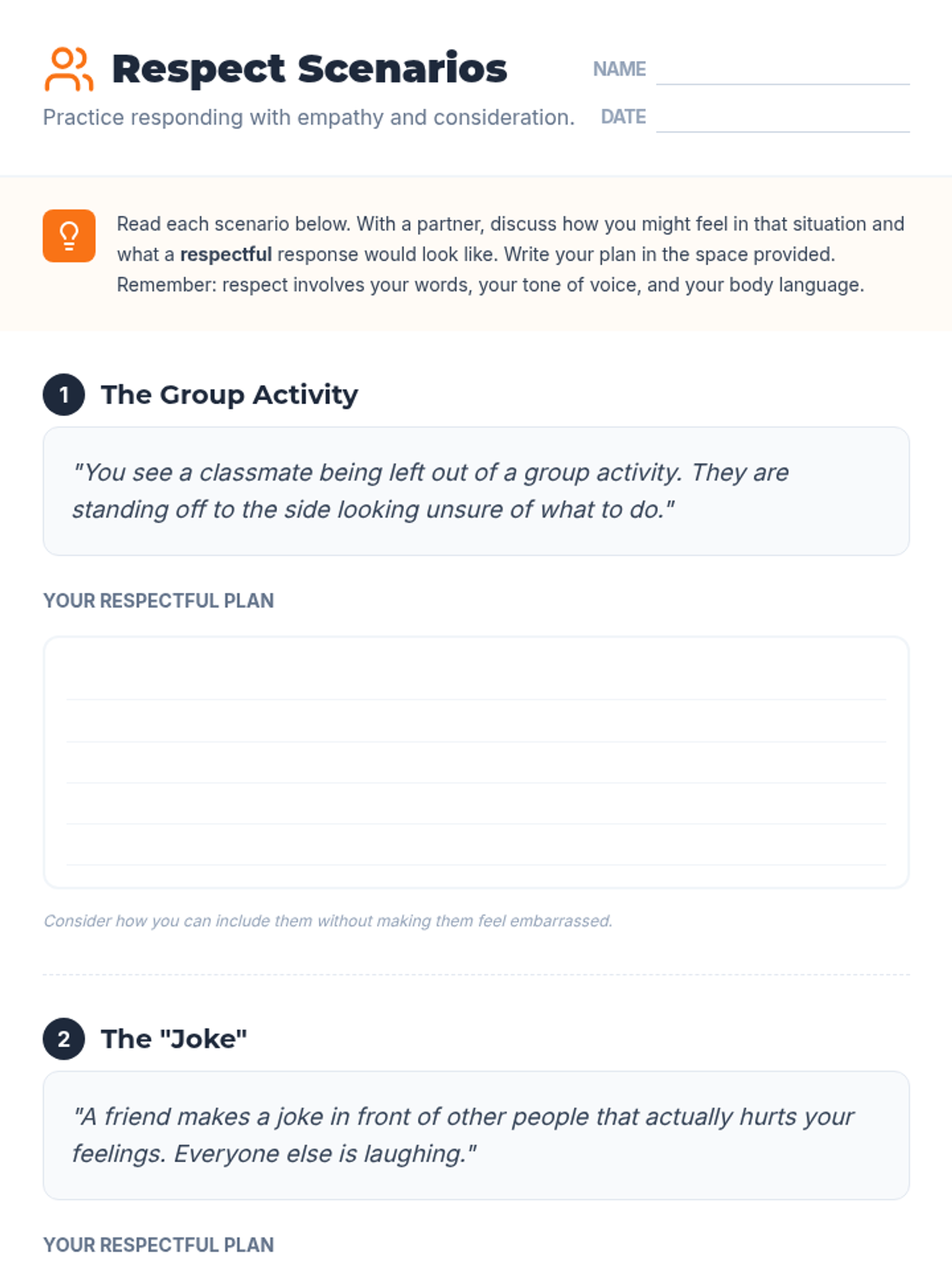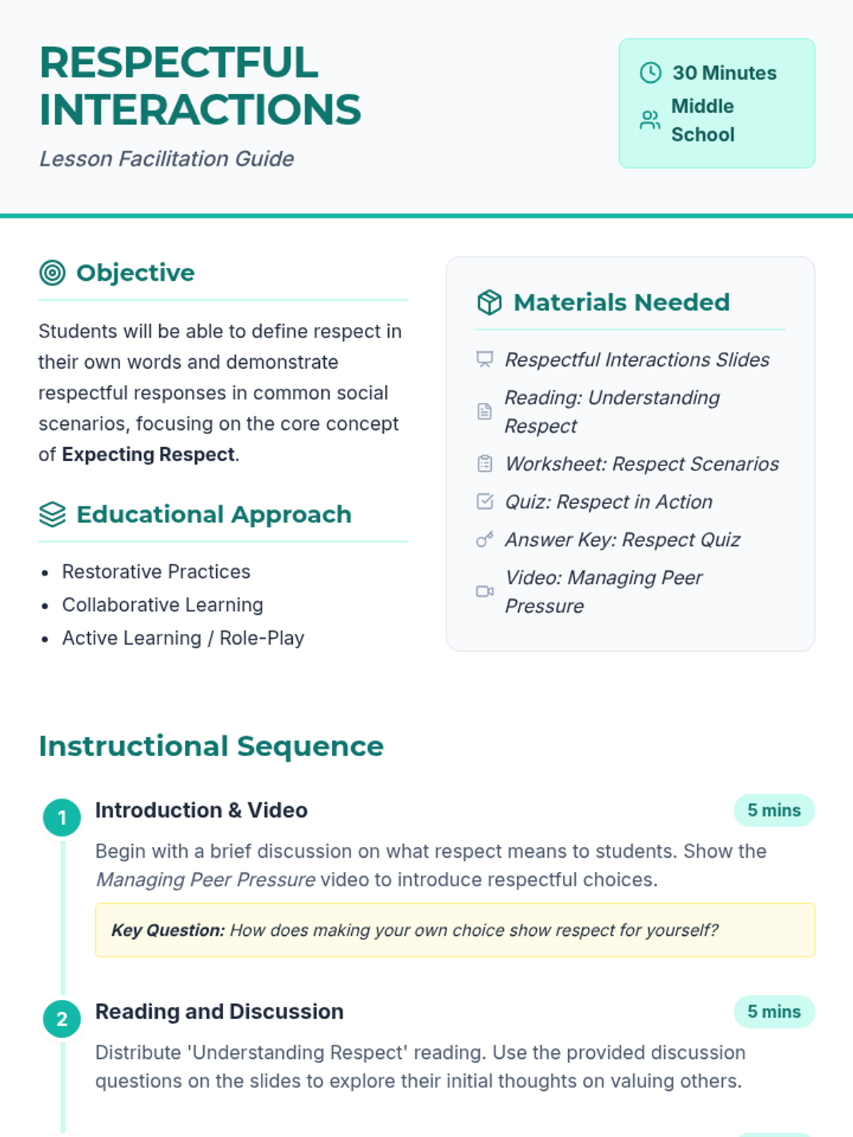 A middle school lesson focused on expecting and giving respect through restorative practices, collaborative discussion, and role-playing scenarios. Students will explore how respectful interactions build positive relationships and classroom culture.