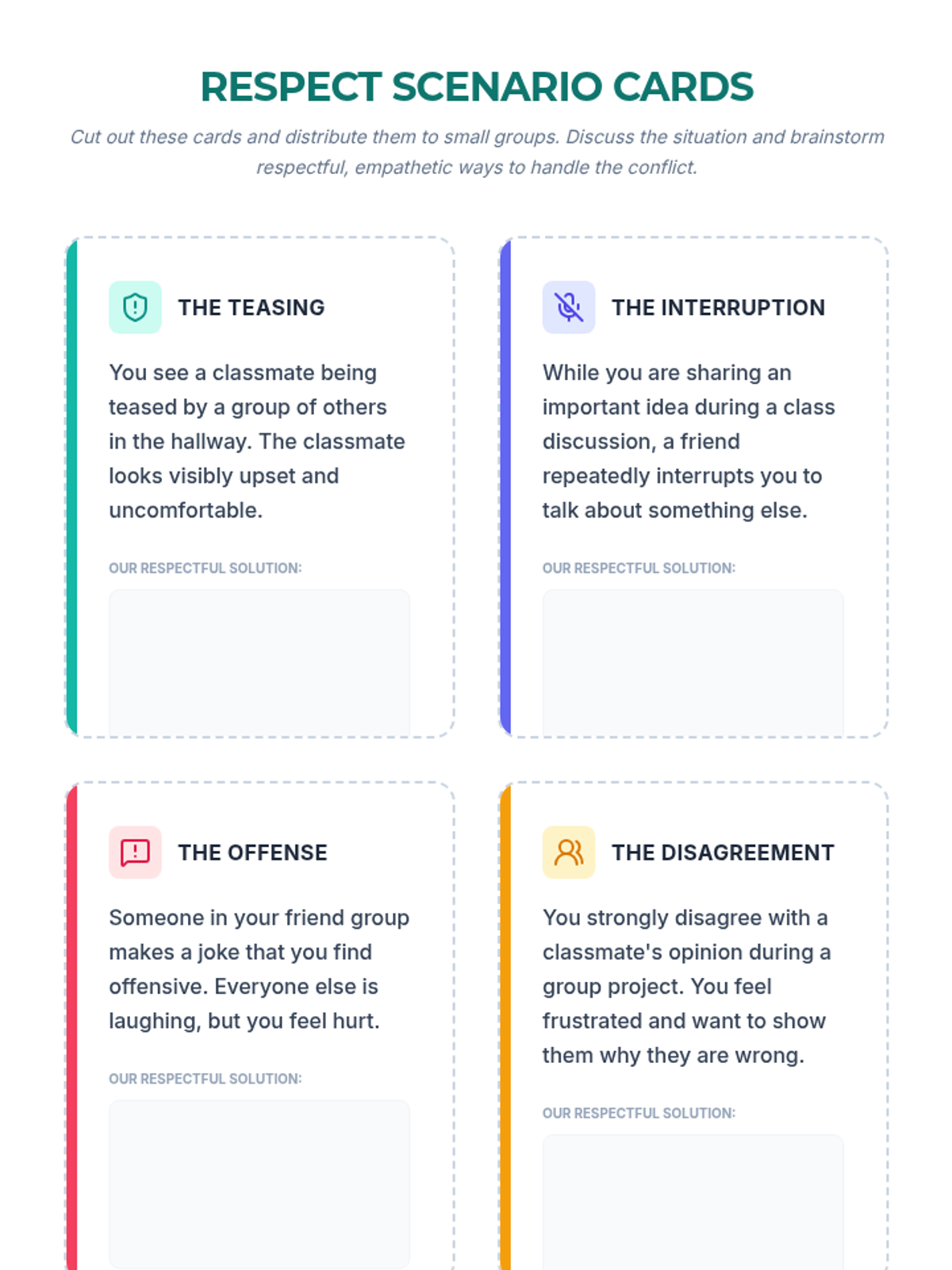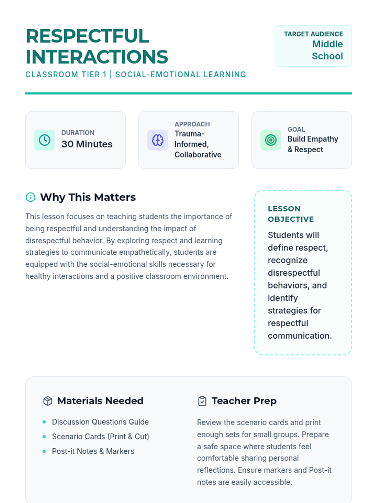 A middle school social-emotional learning lesson focused on fostering empathy, understanding respect, and developing strategies for healthy interpersonal communication.