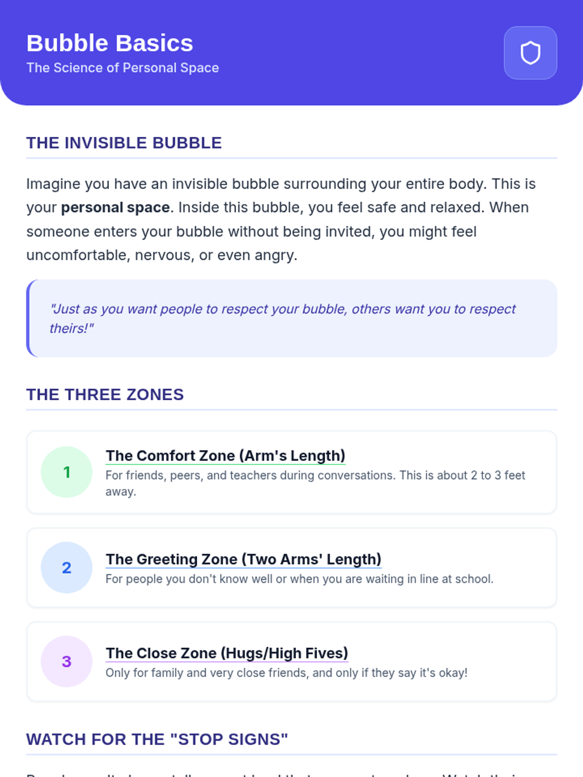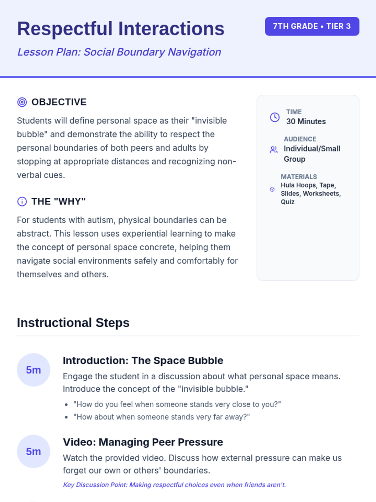 A Tier 3 social skills lesson for a 7th-grade student with autism, focusing on the concept of personal space 'bubbles' and respectful peer/adult interactions through experiential activities.