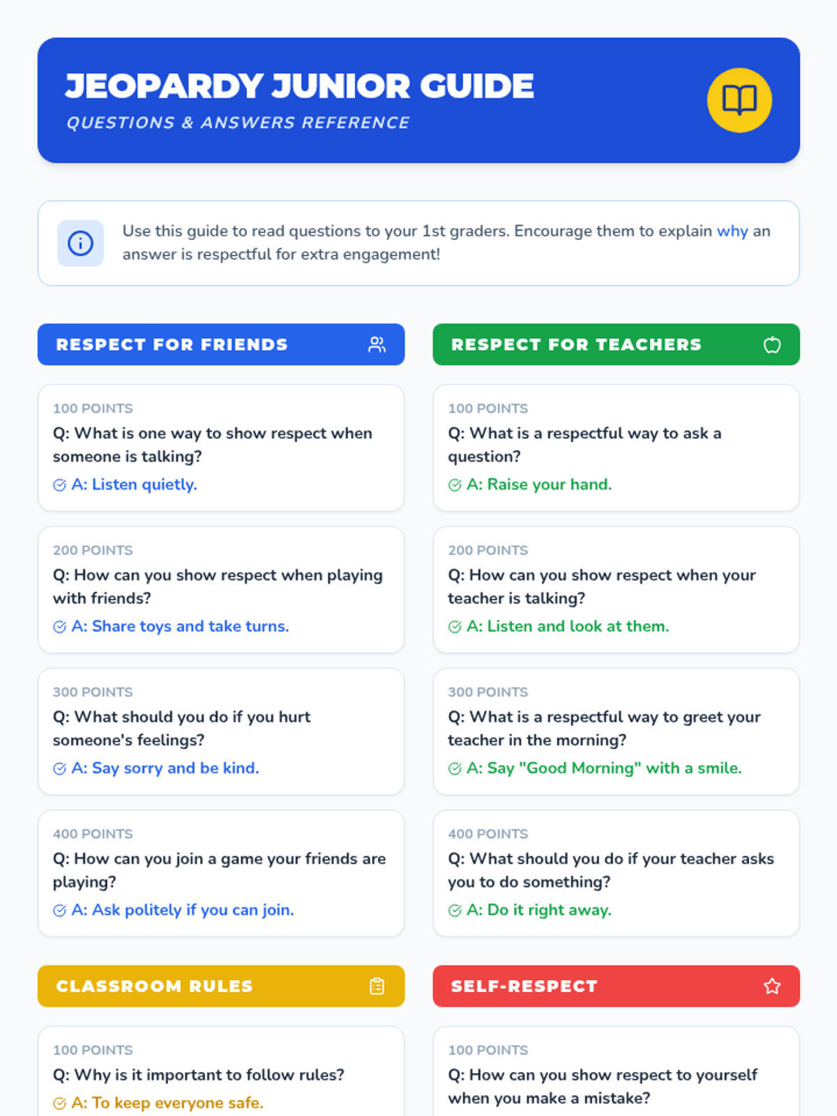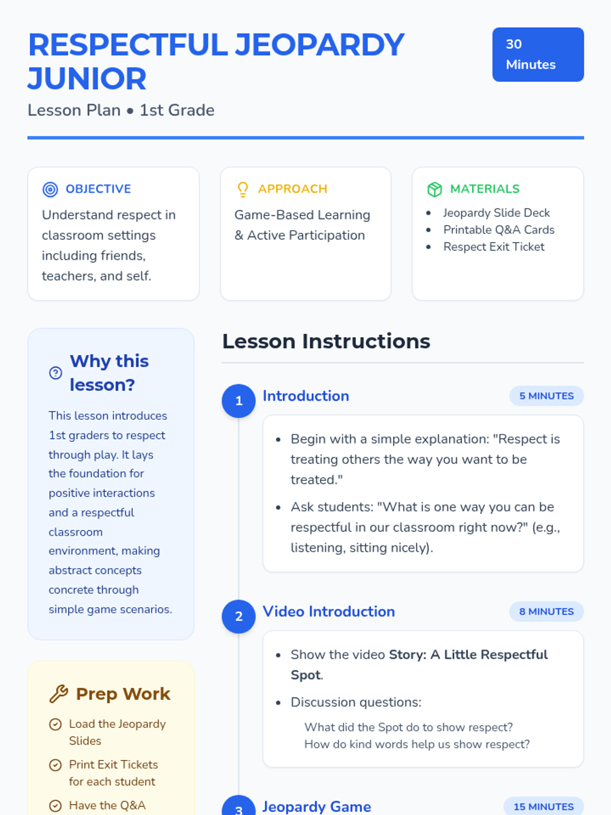 A fun, interactive lesson for 1st graders to learn about respect through a Jeopardy-style game and a story about a 'Respectful Spot'. Students explore respect for friends, teachers, rules, and themselves.