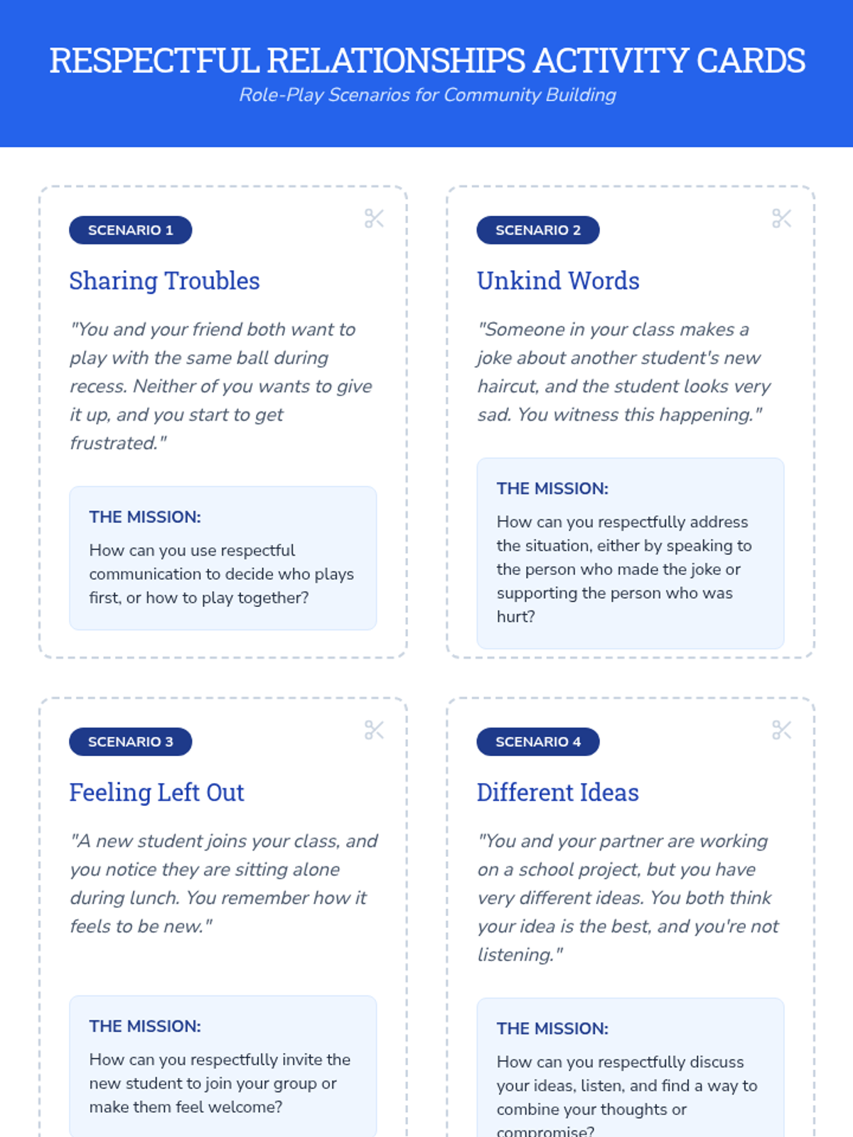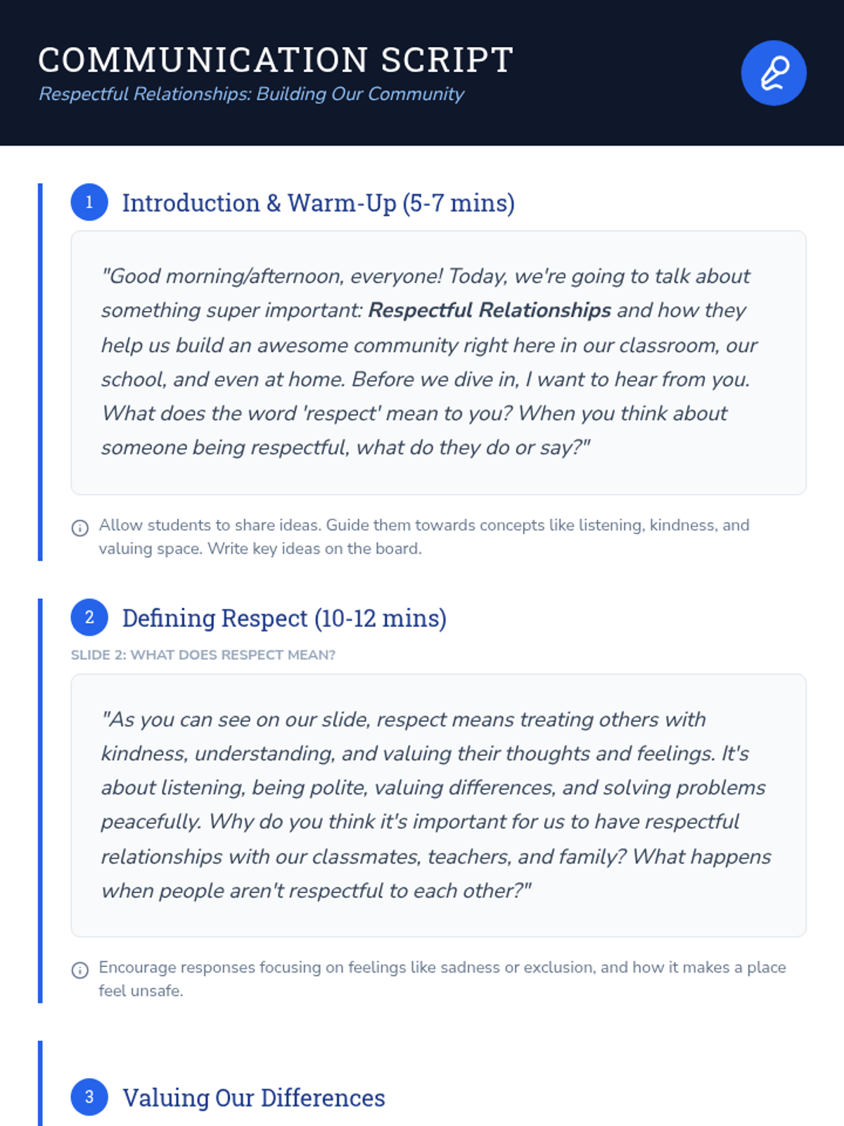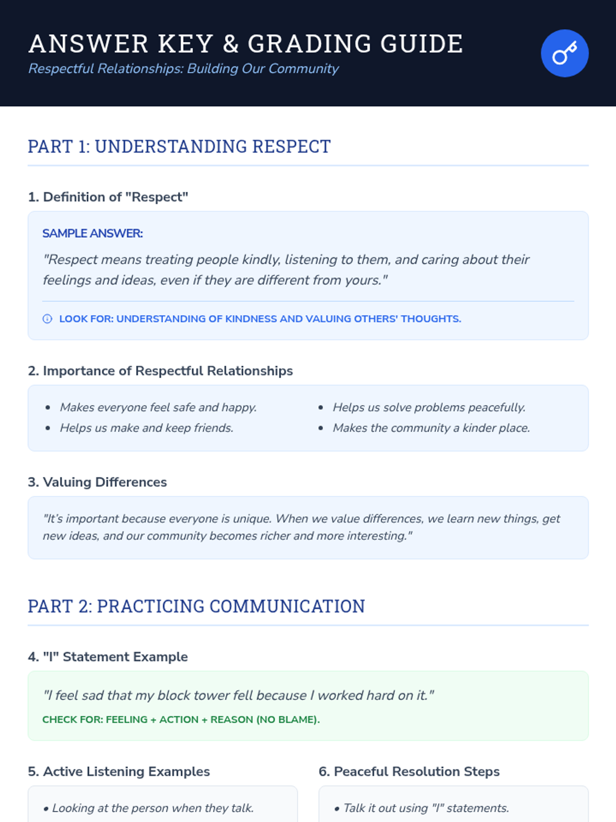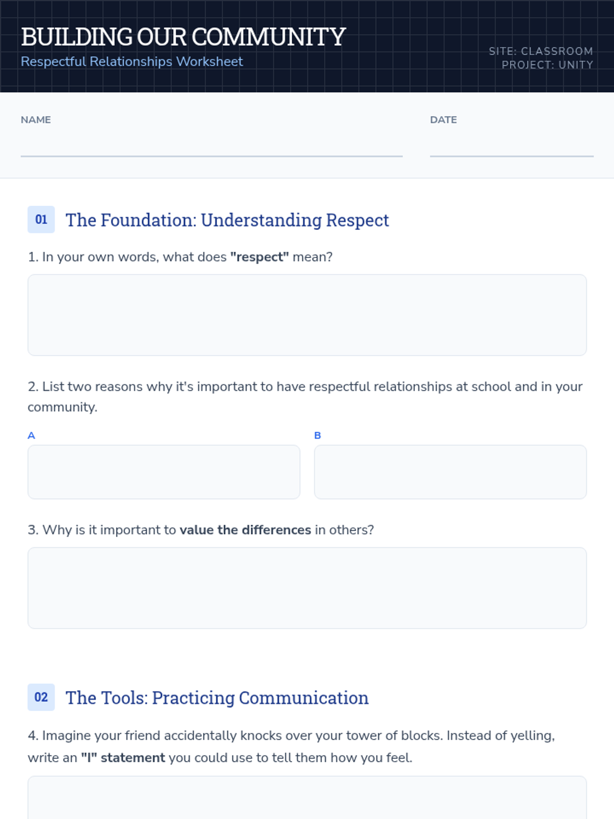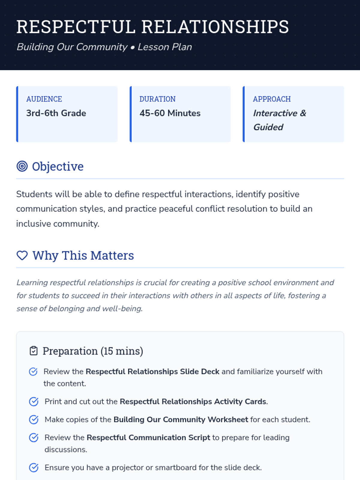 This lesson helps students define and practice respectful interactions within their school and broader communities. Through role-playing scenarios, group discussions, and identifying positive communication styles, students will learn to value differences, resolve minor conflicts peacefully, and contribute to an inclusive and supportive environment.