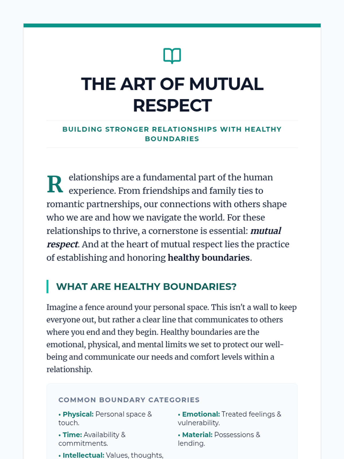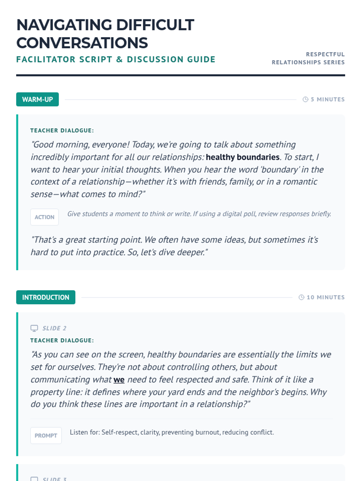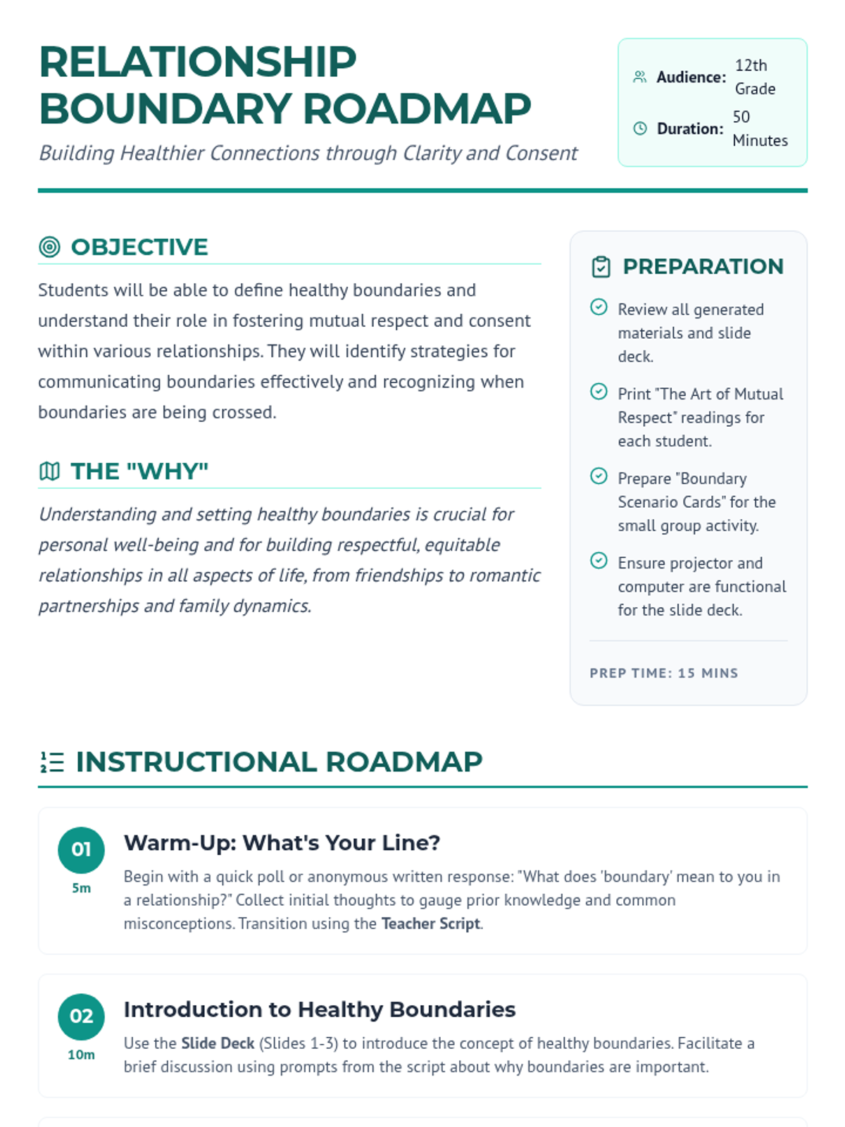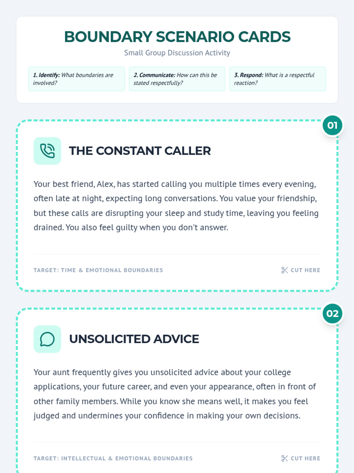 This lesson helps 12th-grade students define and establish healthy boundaries as a foundation for mutual respect and consent in personal and professional relationships.