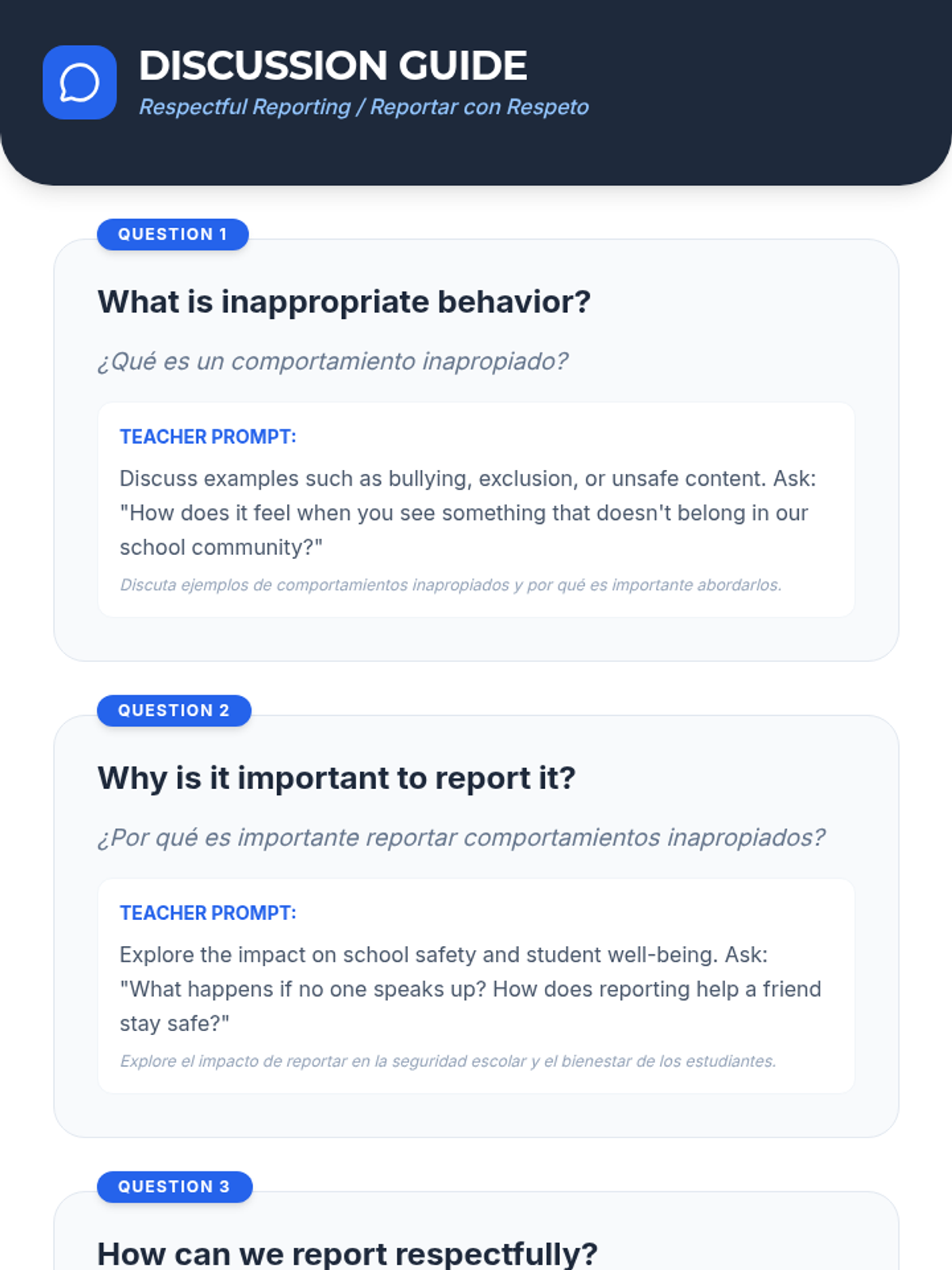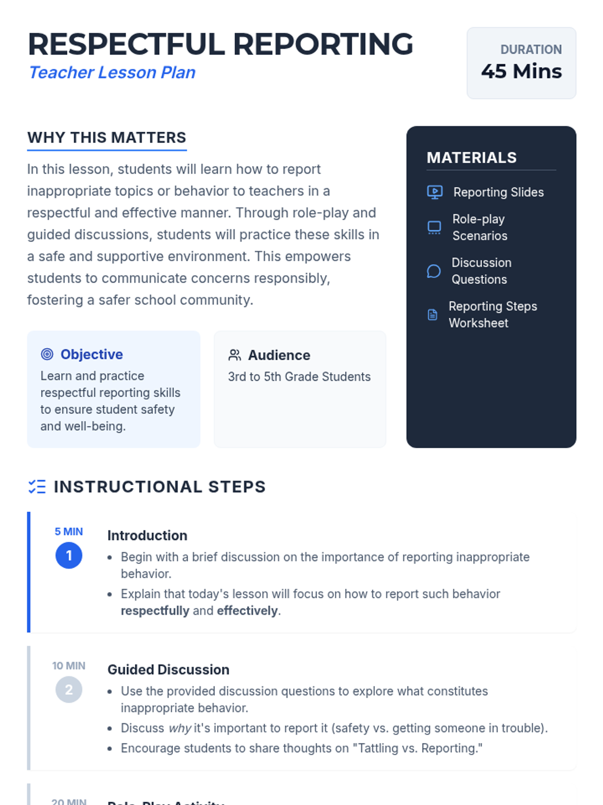 Students learn how to report inappropriate behavior to teachers in a respectful and effective manner through role-play, discussion, and reflection. This lesson empowers students to communicate concerns responsibly, fostering a safer and more respectful school community.
