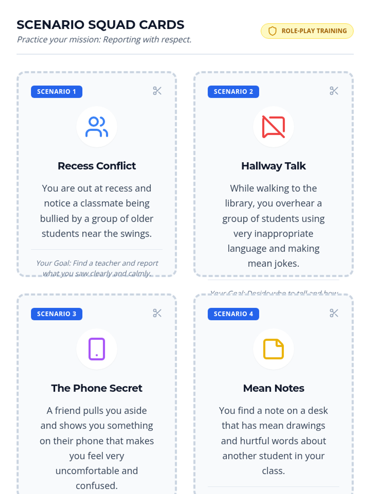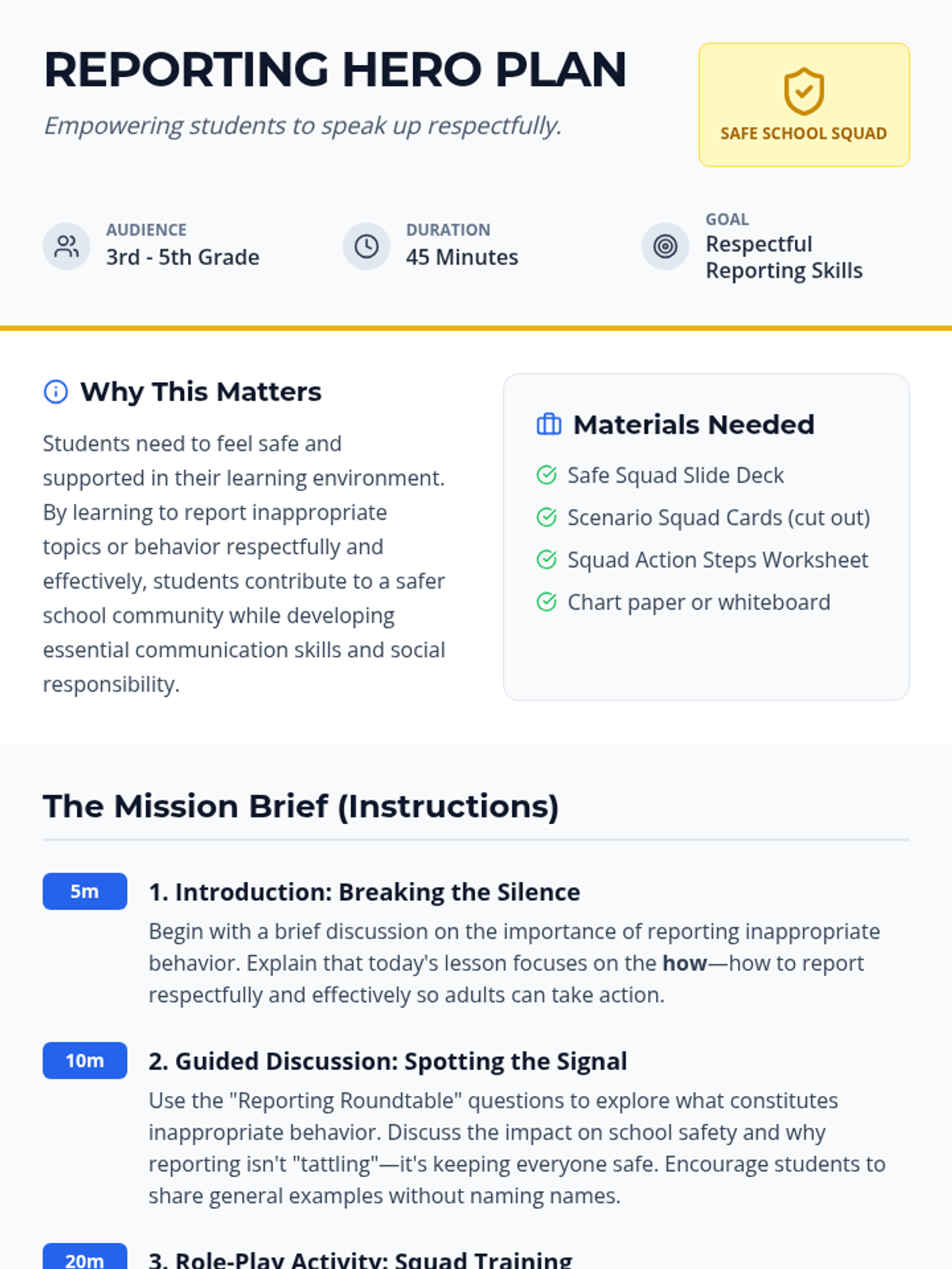 Students will learn how to report inappropriate behavior respectfully through role-play, discussion, and practical steps. This lesson empowers students to contribute to a safer school environment by communicating concerns responsibly to trusted adults.