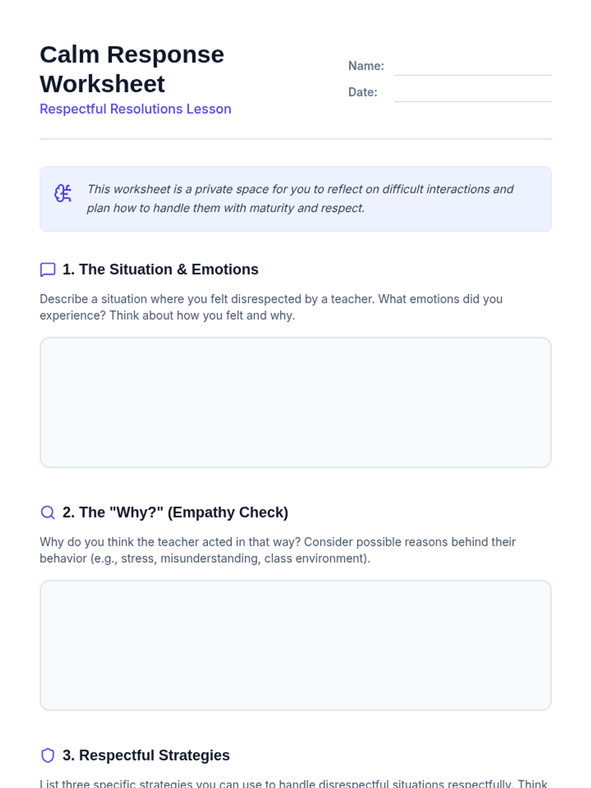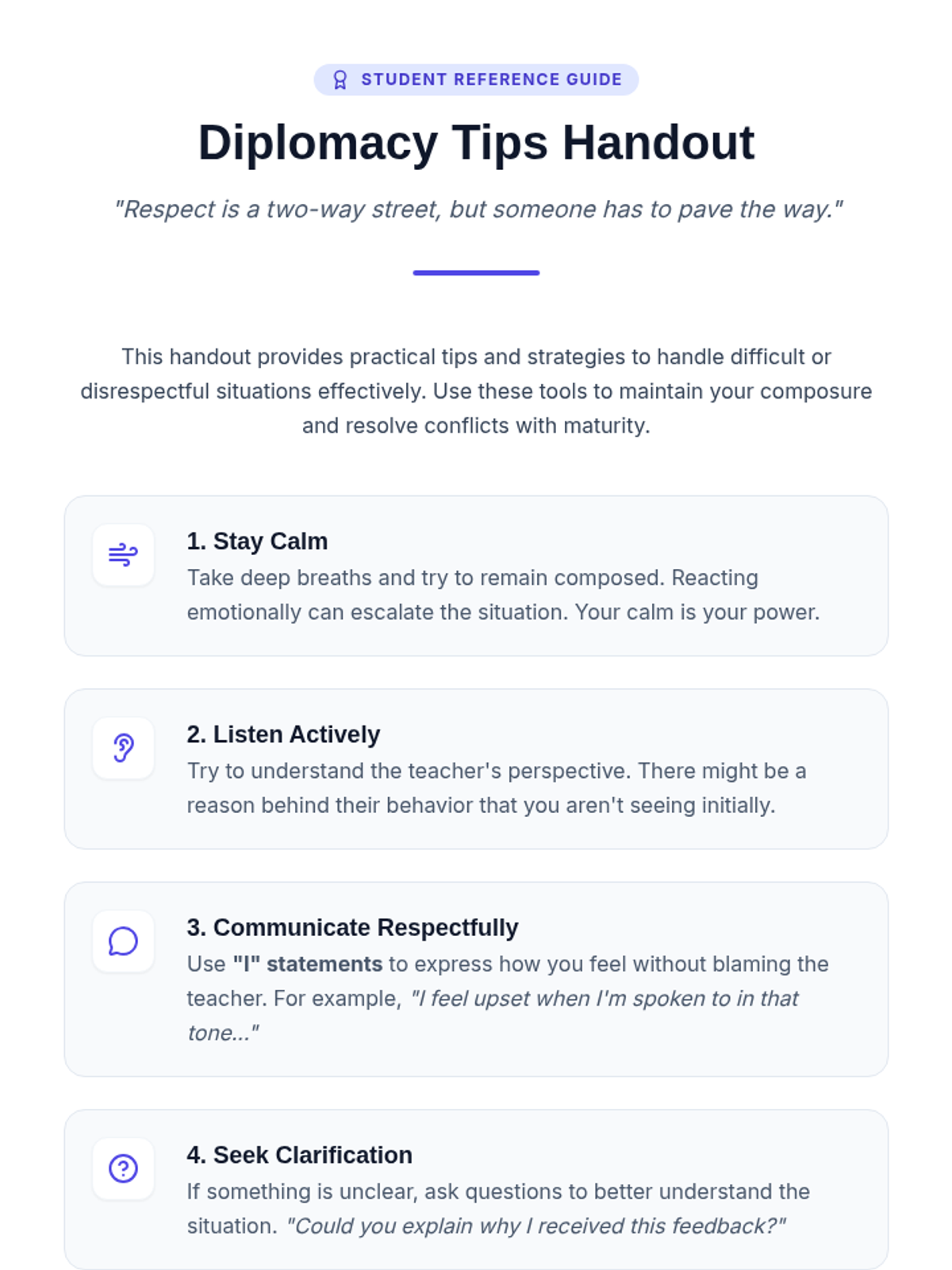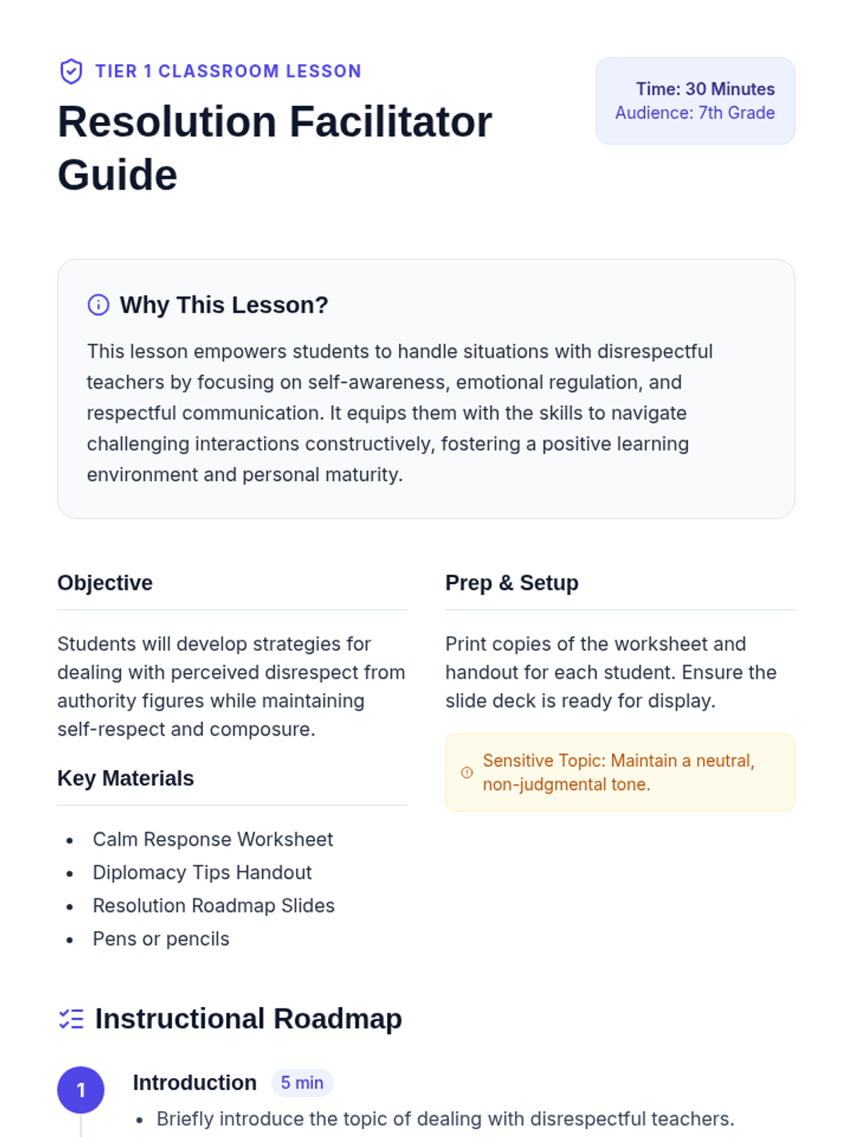 A 30-minute lesson for 7th graders focused on navigating difficult interactions with teachers using self-awareness and respectful communication strategies.