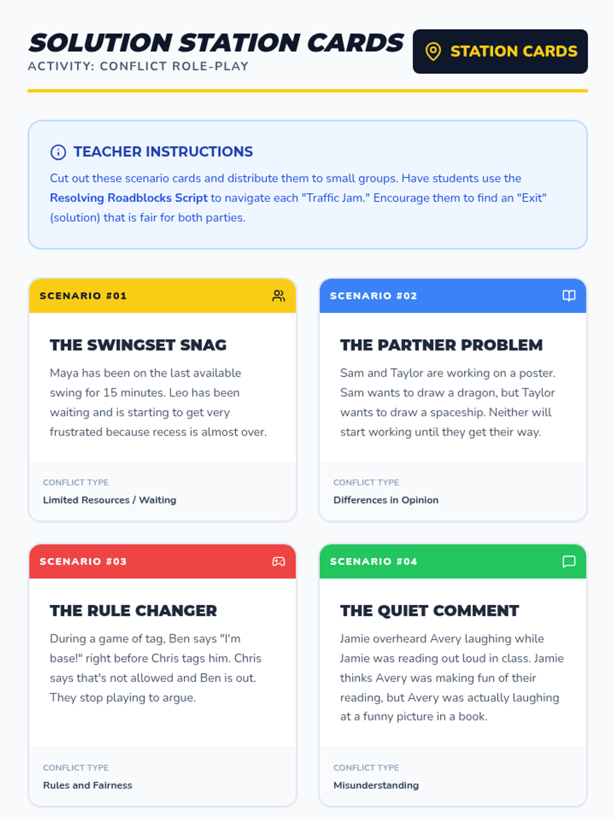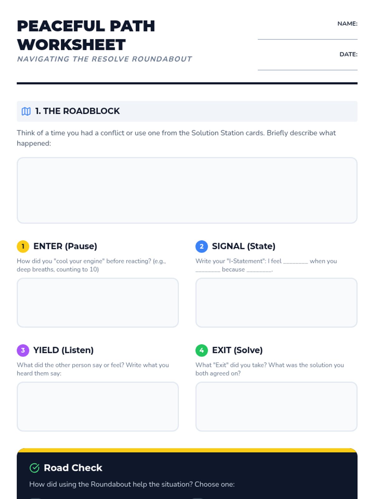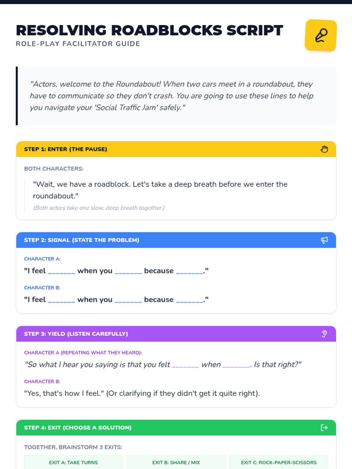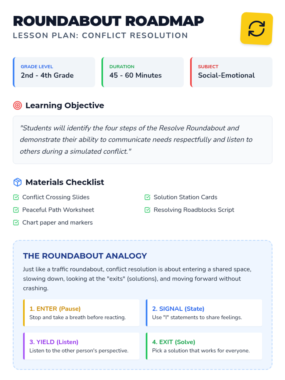 A comprehensive lesson teaching elementary students how to navigate conflicts using a 'roundabout' analogy, focusing on pausing, stating feelings, and finding shared solutions.