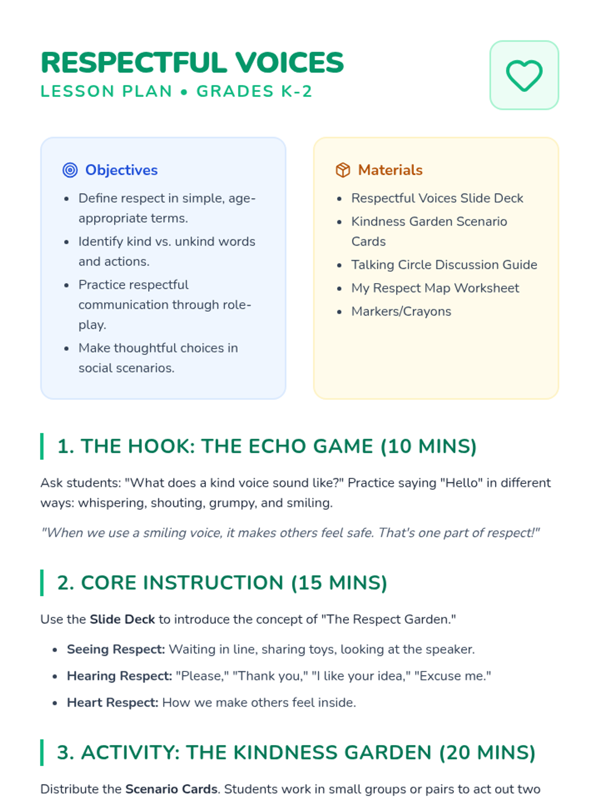 A lesson for K-2 students to explore the concept of respect through role-playing, kind words, and thoughtful choices. Students will learn to recognize respectful behavior and practice it in their daily interactions to foster a positive classroom climate.