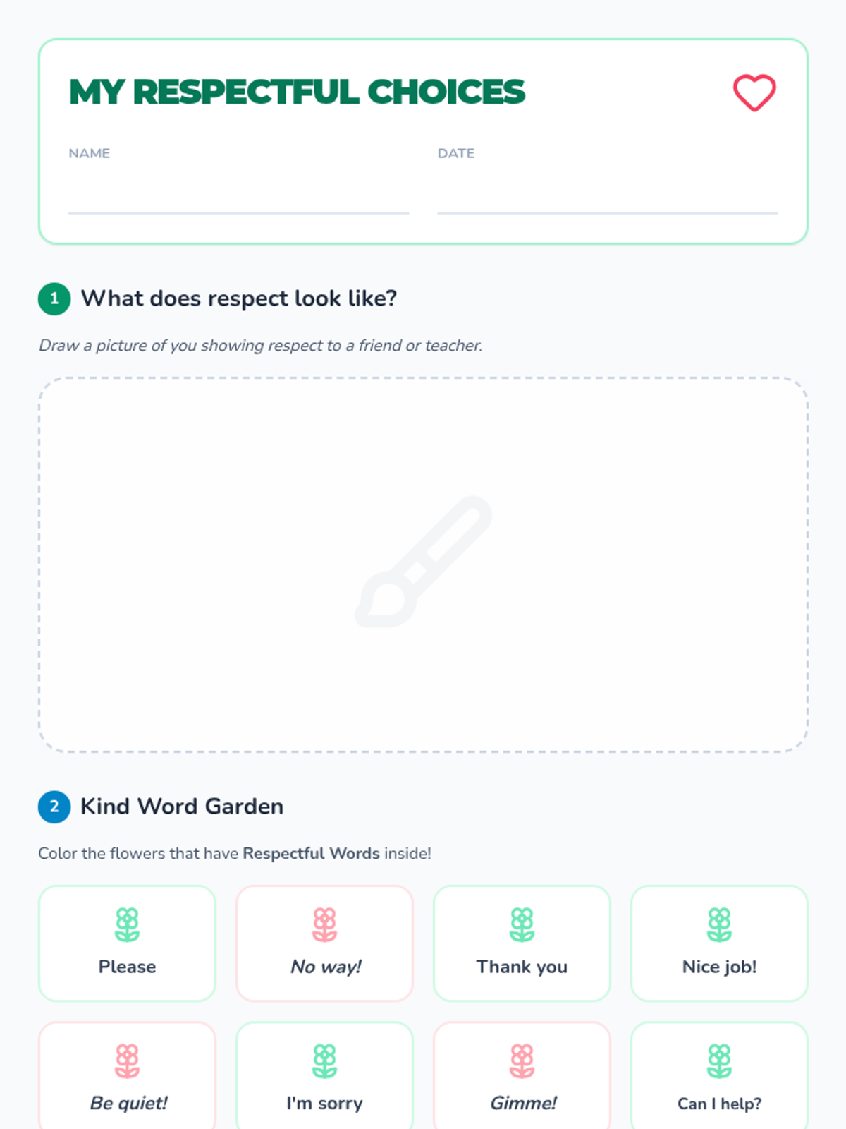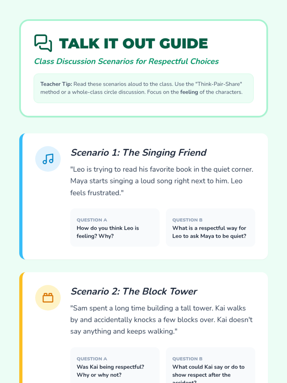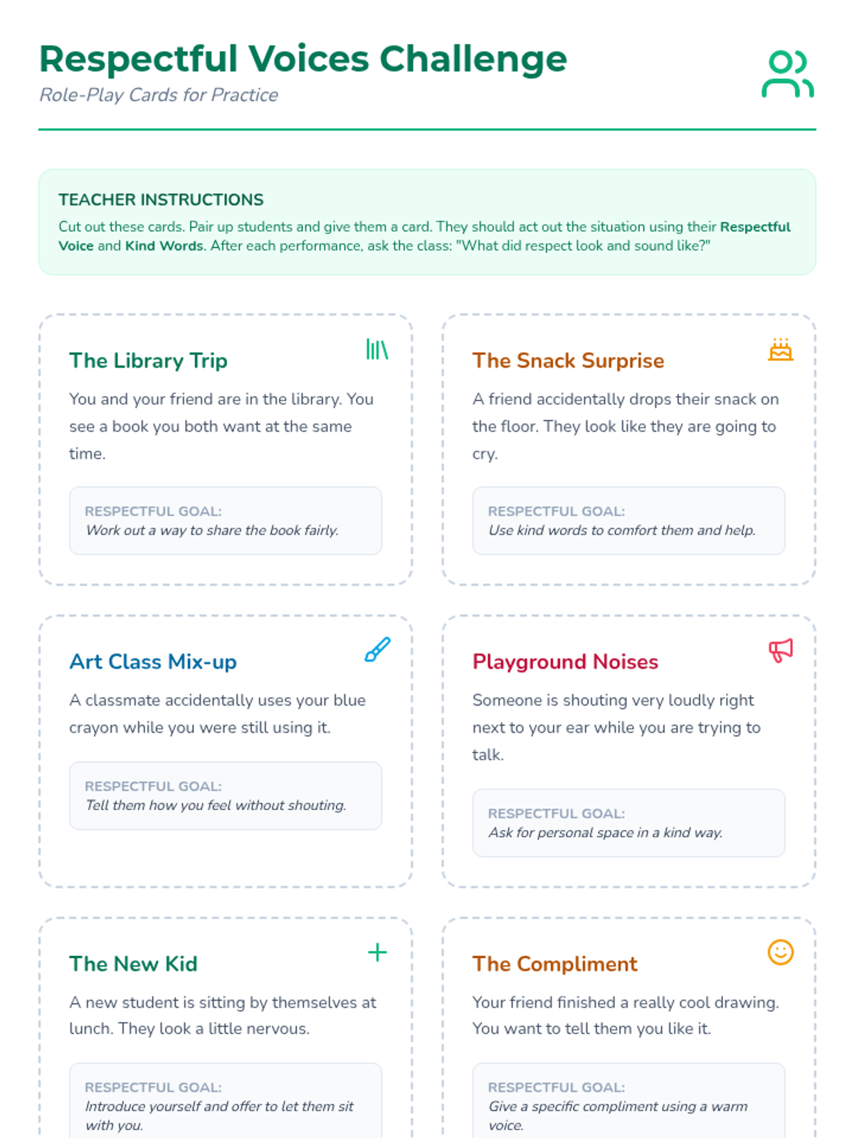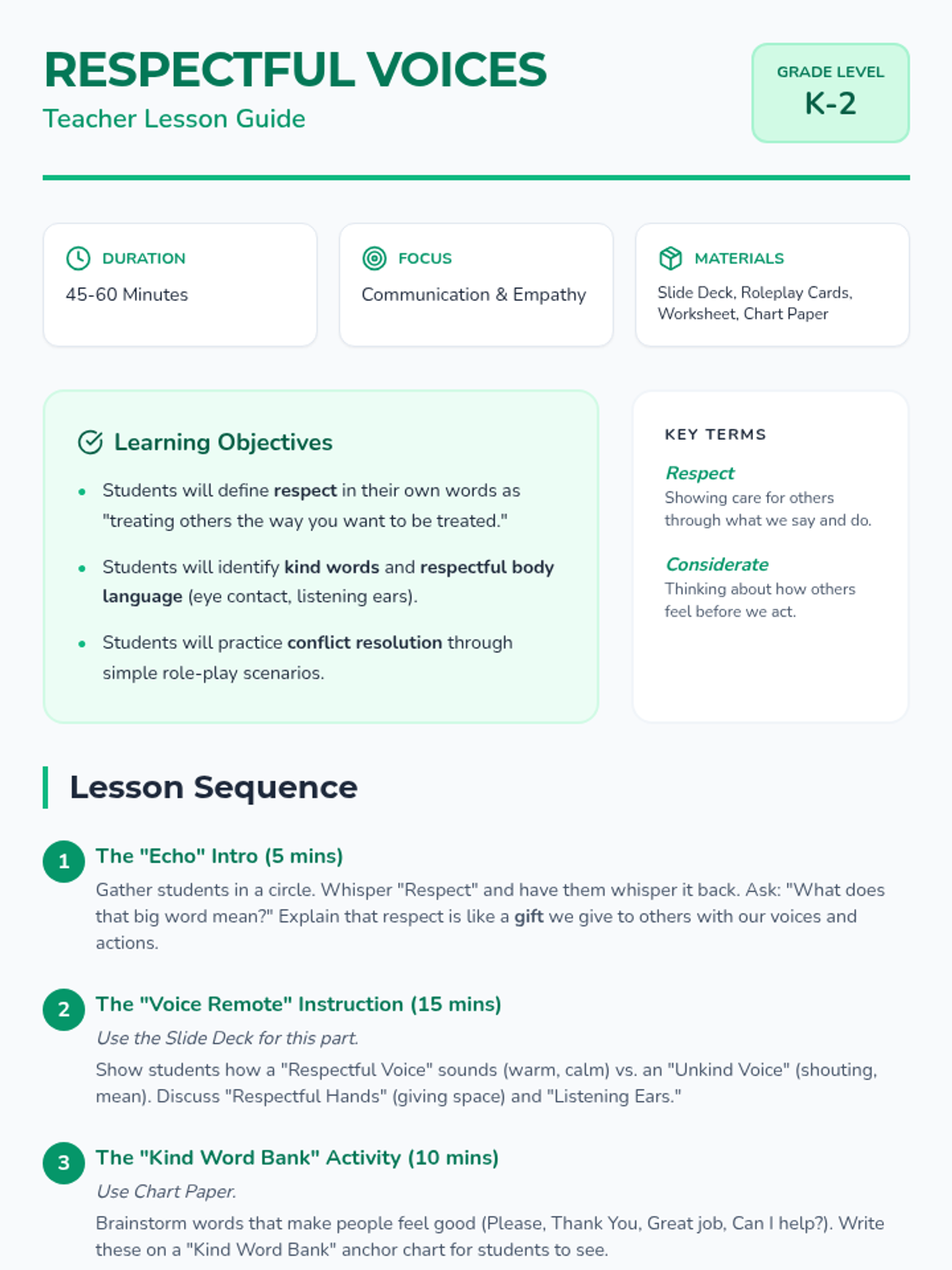 A foundational social-emotional learning lesson for K-2 students focusing on respectful communication, kind words, and thoughtful actions through role-playing and guided scenarios.