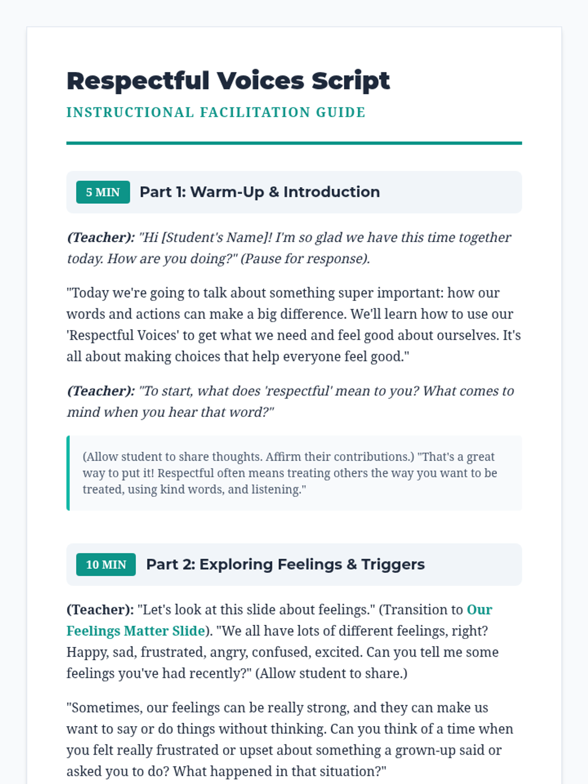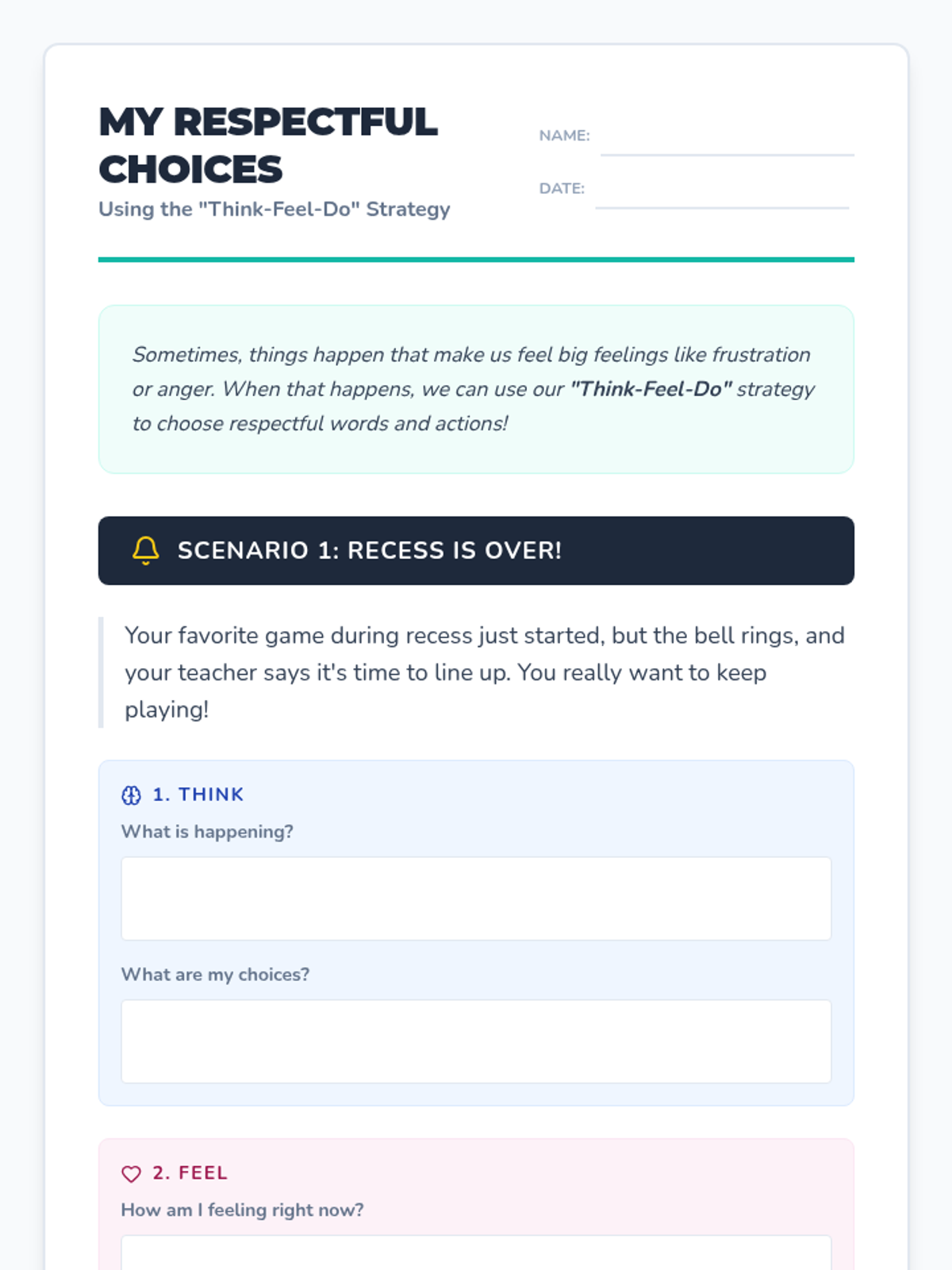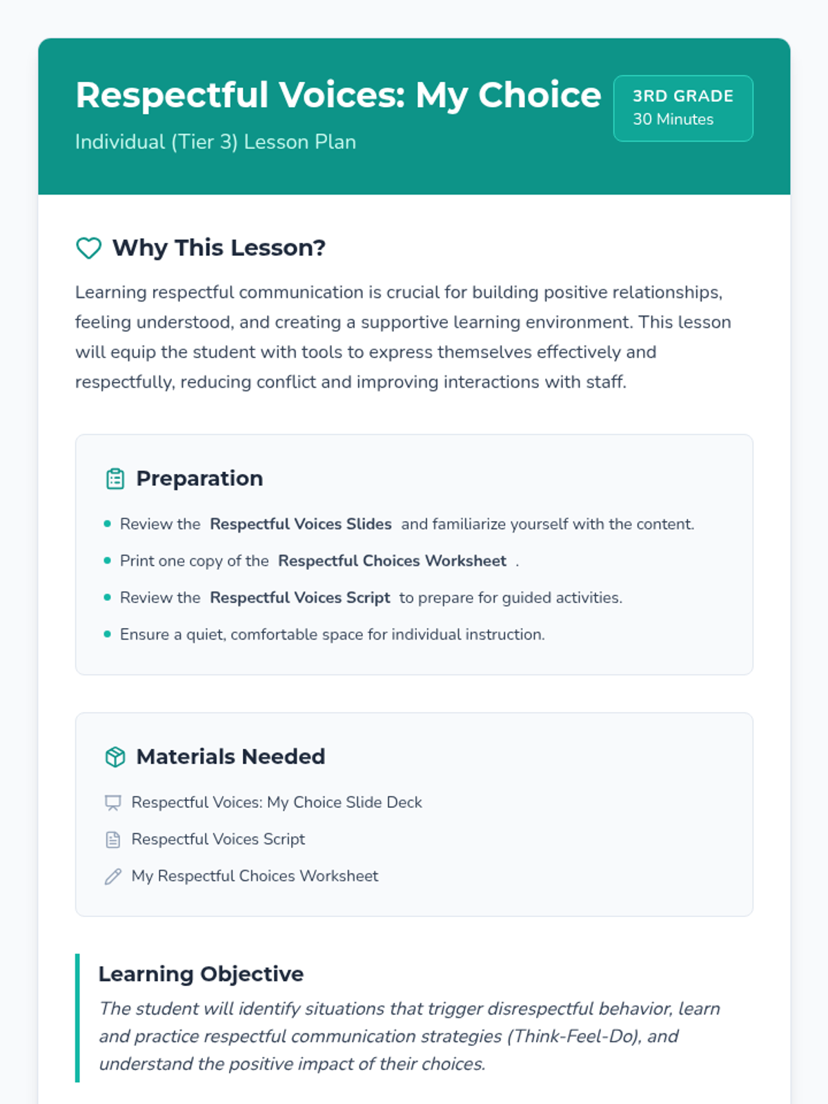 A 30-minute individual Tier 3 lesson for 3rd-grade students focused on identifying triggers for disrespectful behavior and practicing the 'Think-Feel-Do' strategy to communicate respectfully.