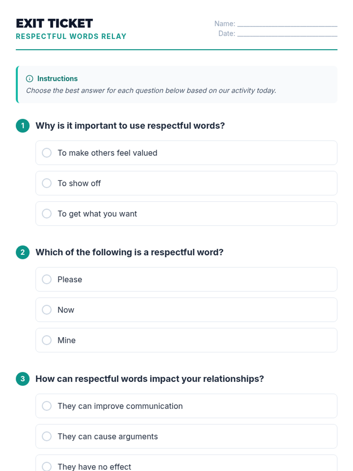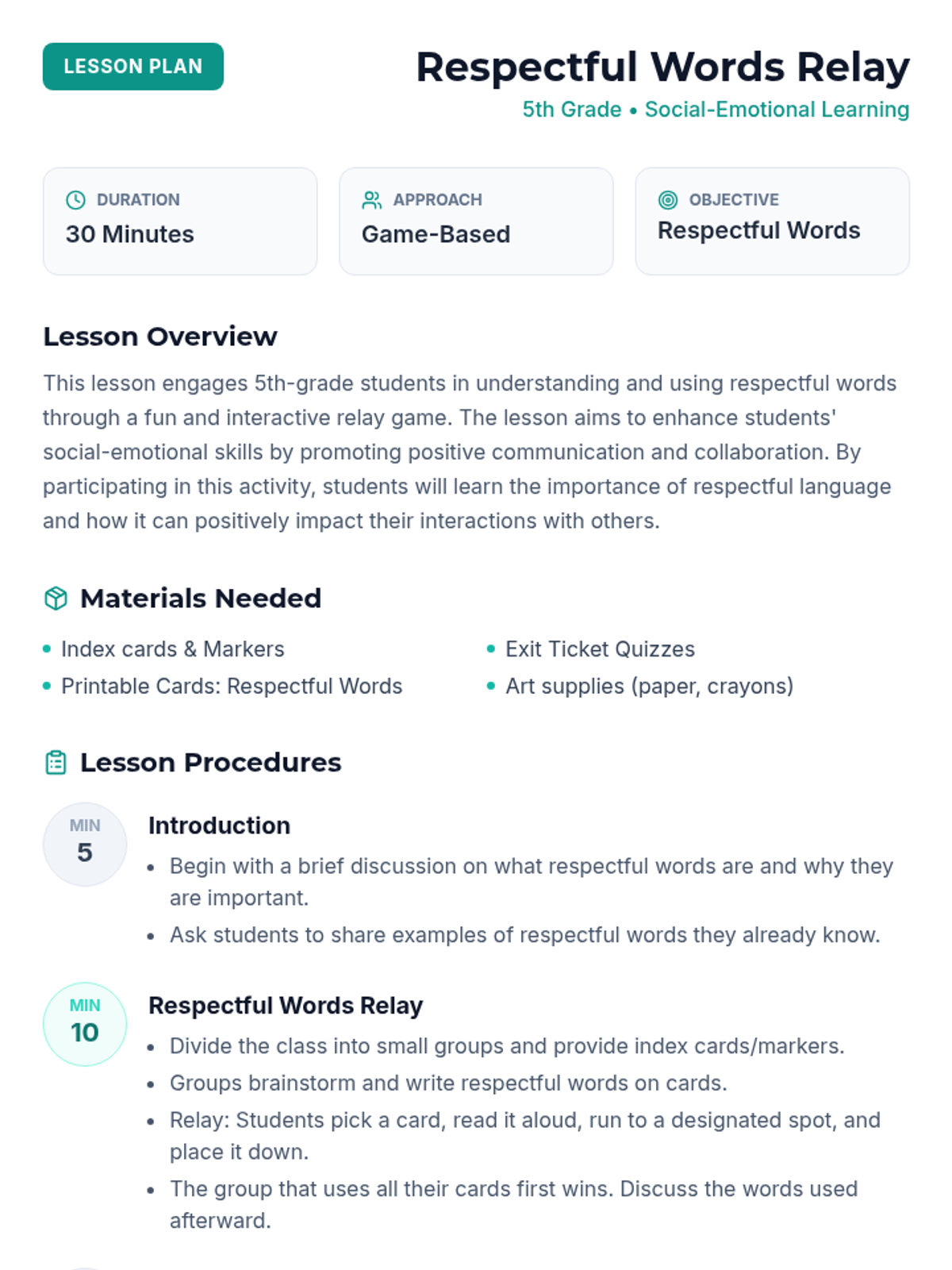 A 5th-grade social-emotional learning lesson that uses a relay race game to teach students the importance of respectful communication and collaboration.