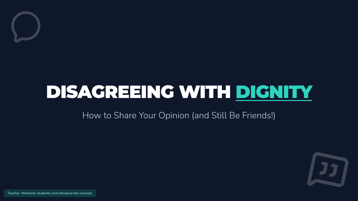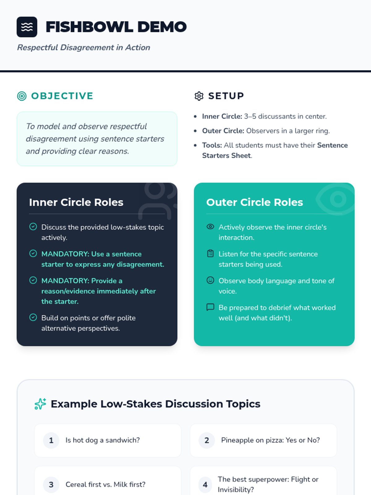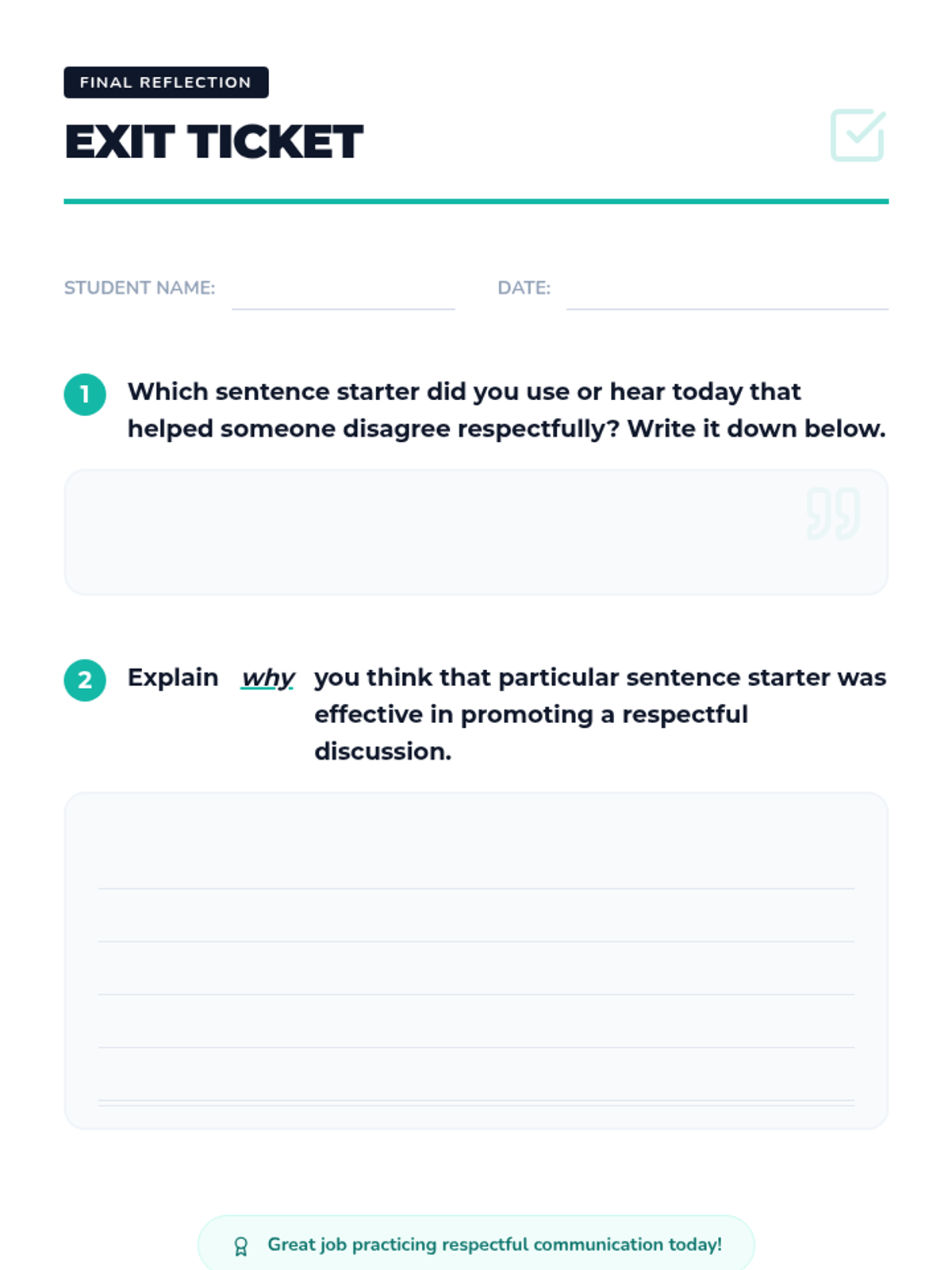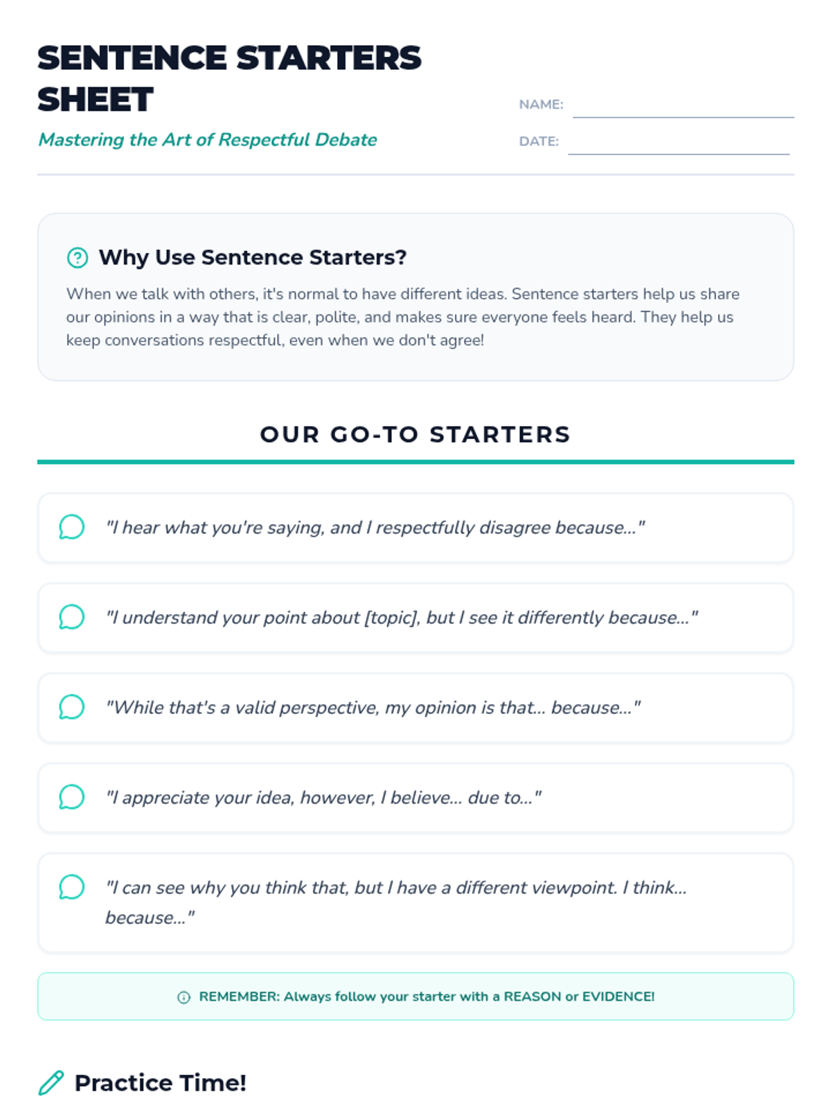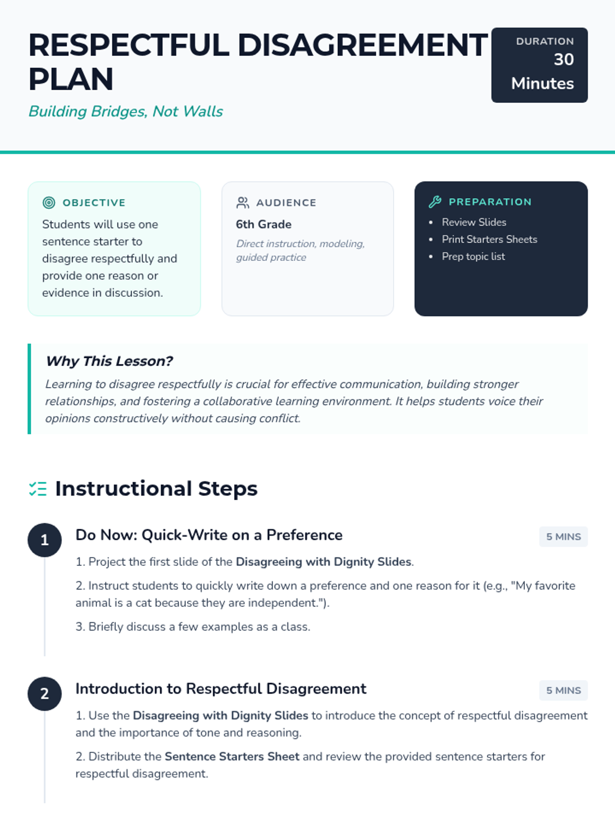 This lesson teaches 6th-grade students how to express disagreement respectfully and constructively using sentence starters and reasoning.