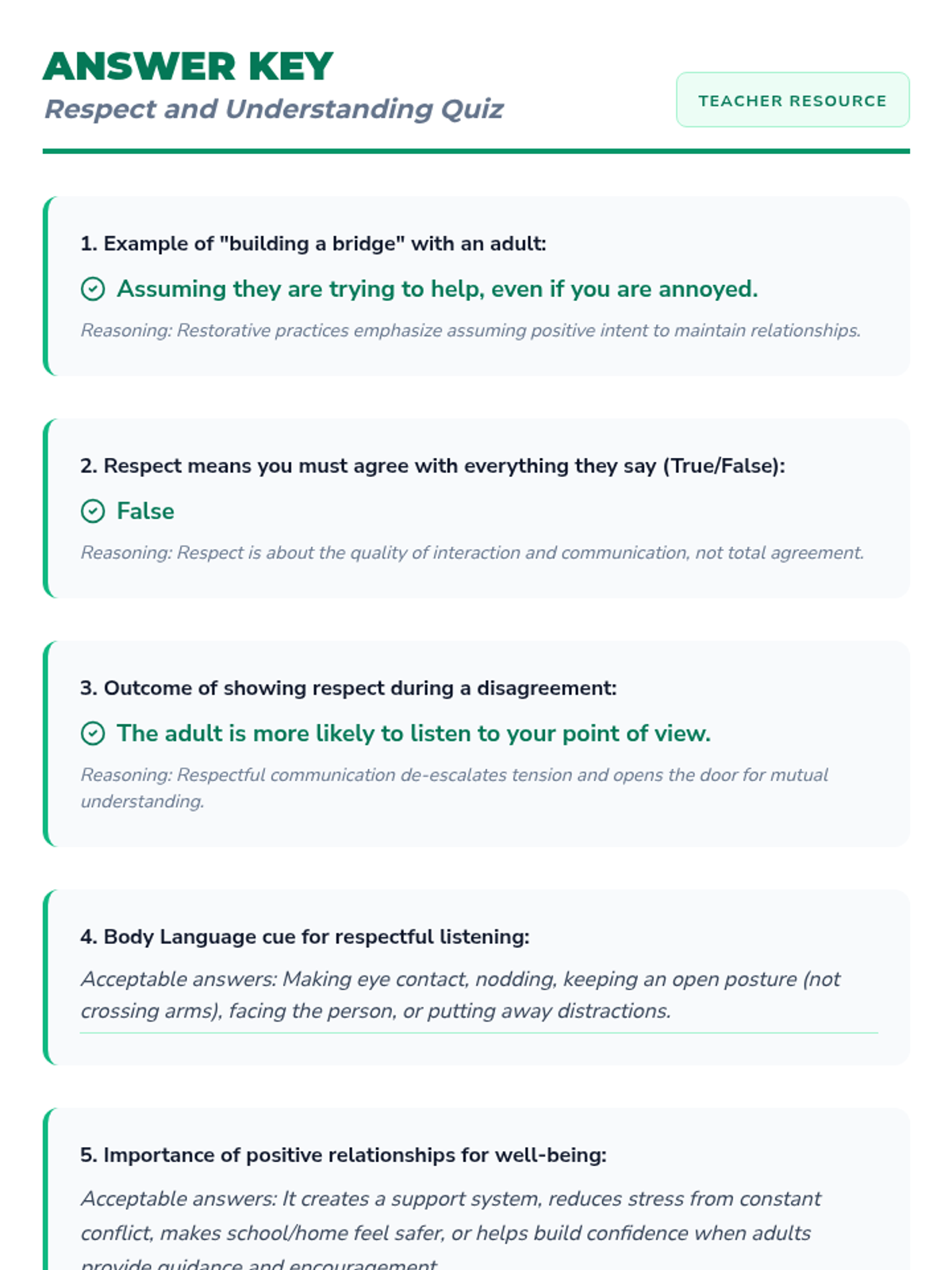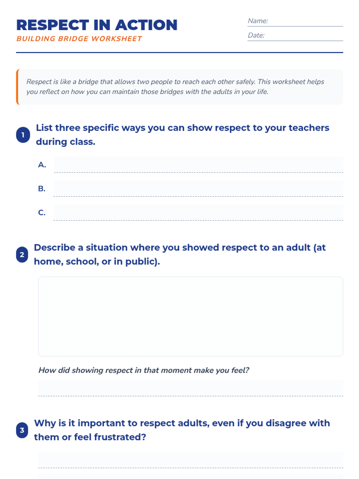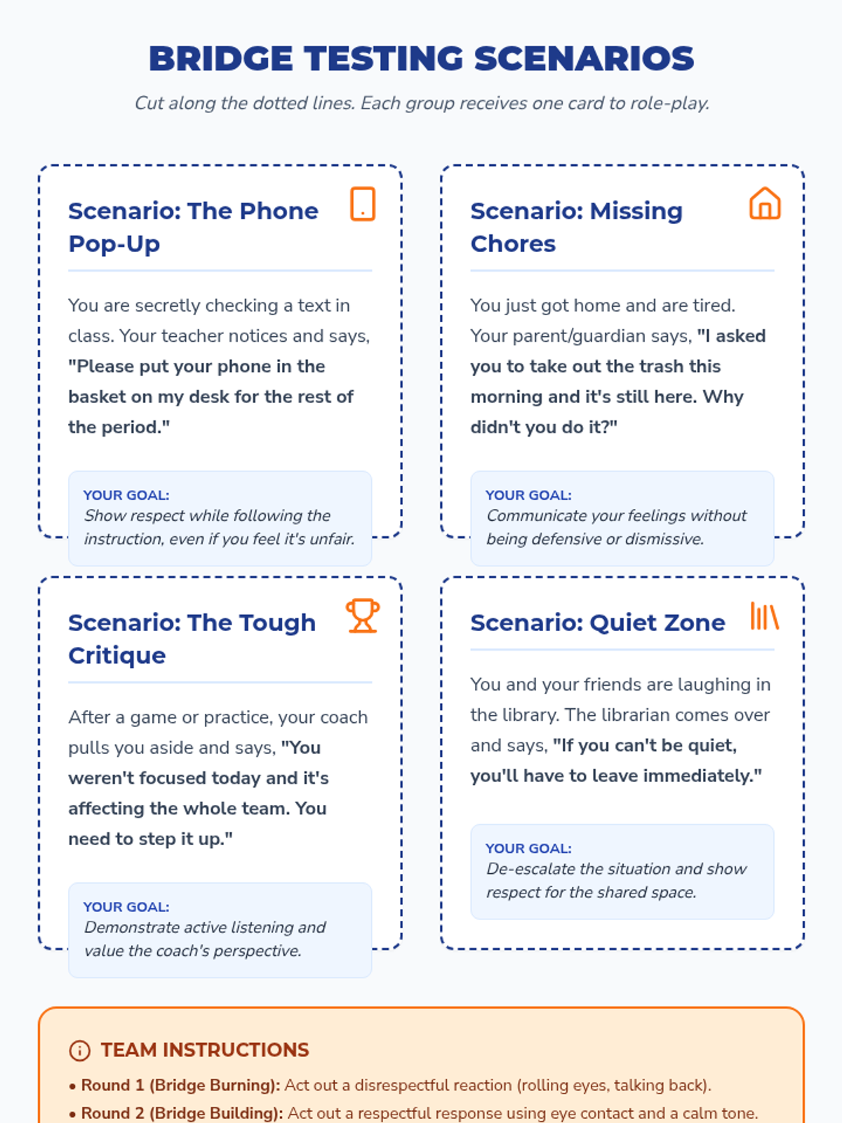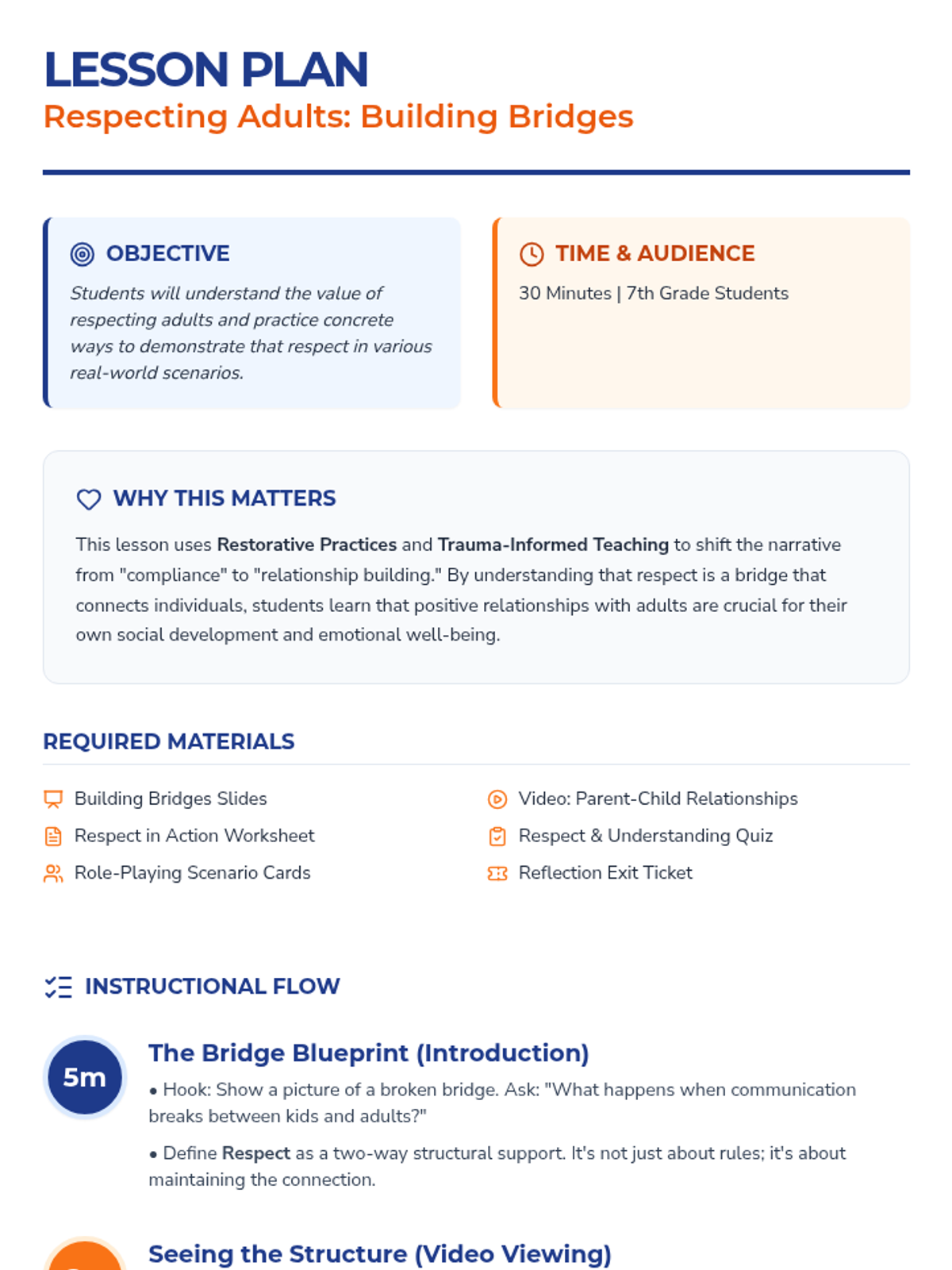 This 30-minute lesson for 7th graders focuses on the importance of respecting adults using restorative practices and trauma-informed approaches. Students explore communication strategies, engage in role-playing, and reflect on their personal interactions to build stronger 'bridges' of respect with the adults in their lives.