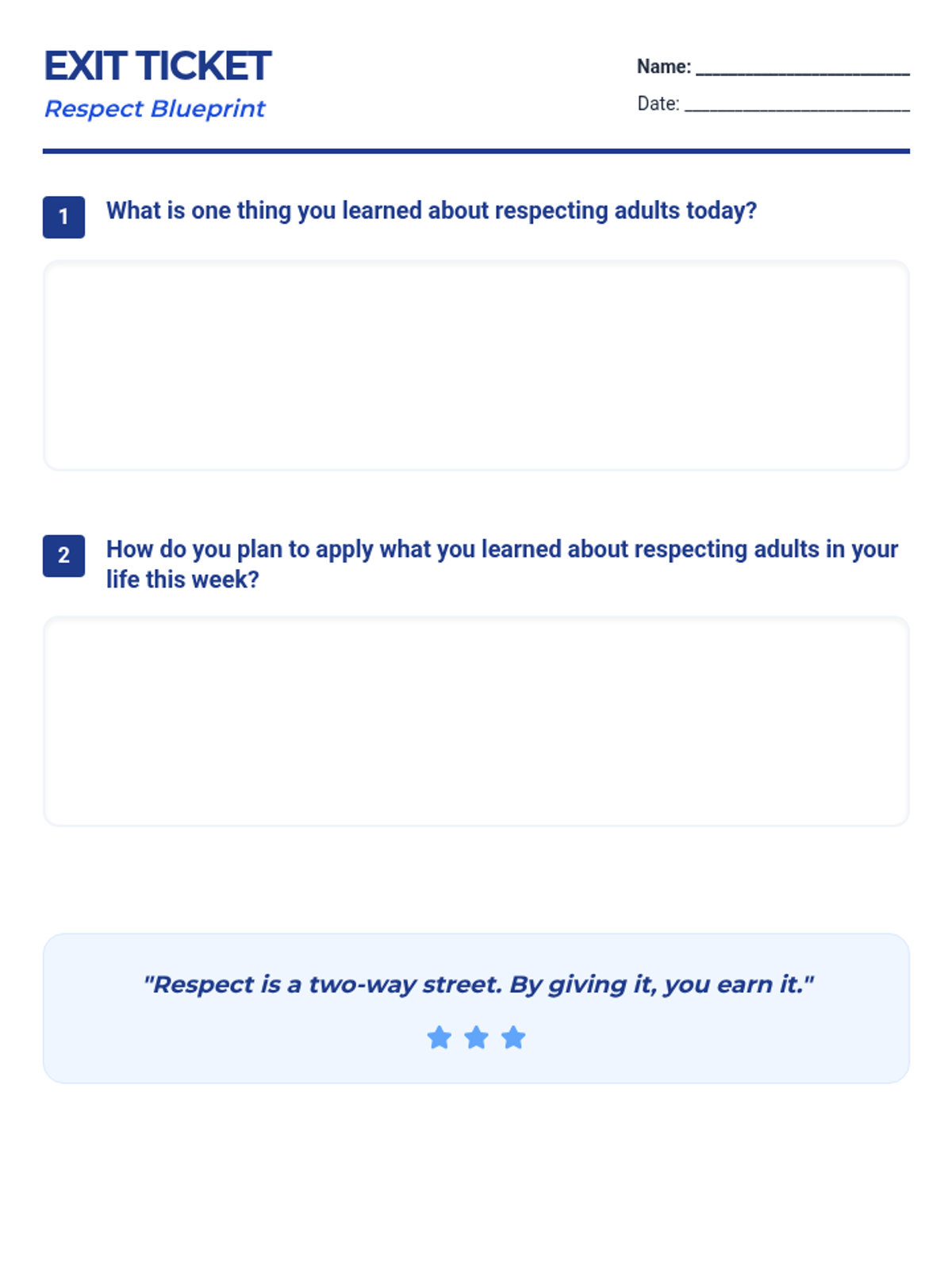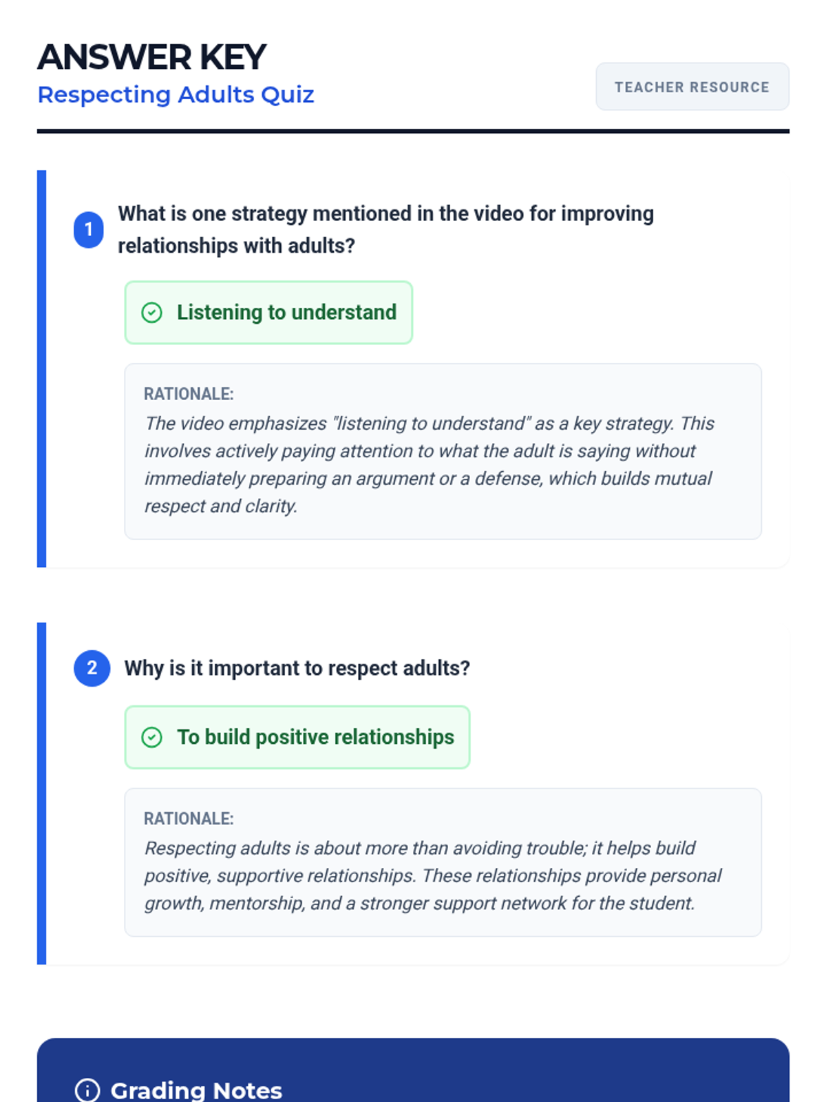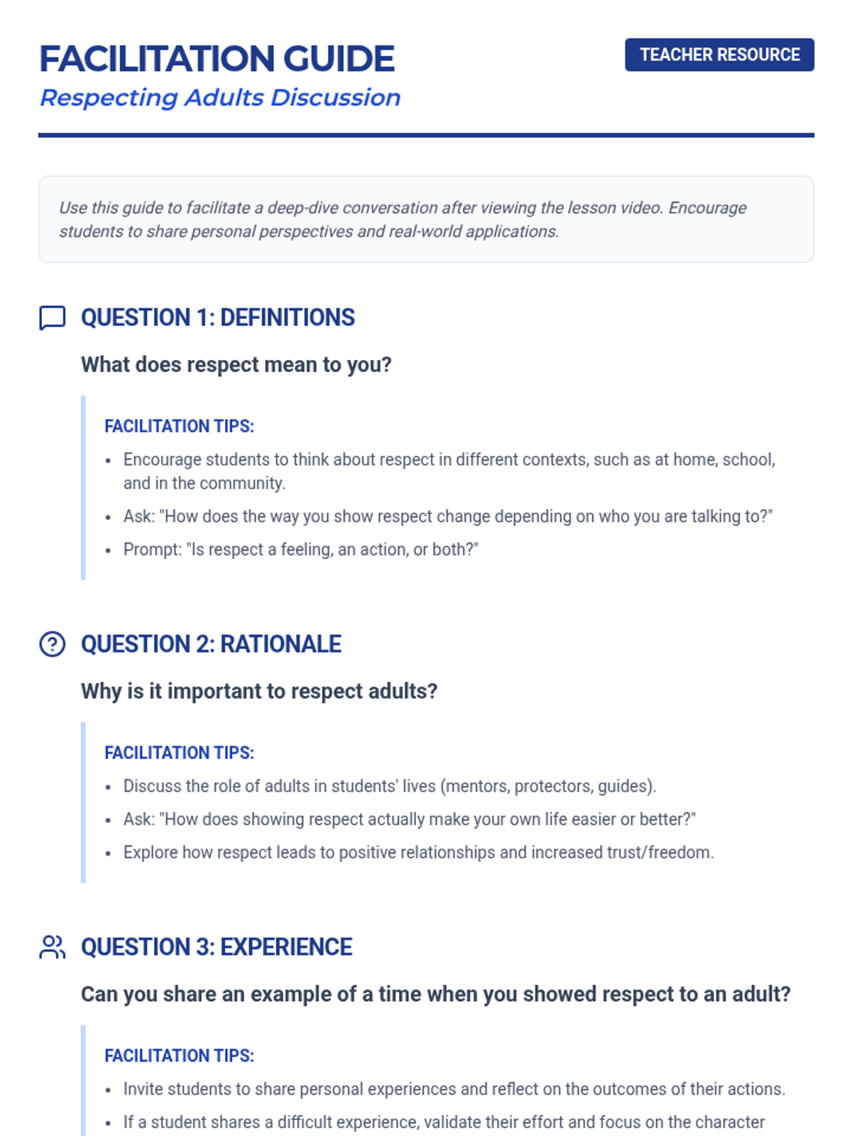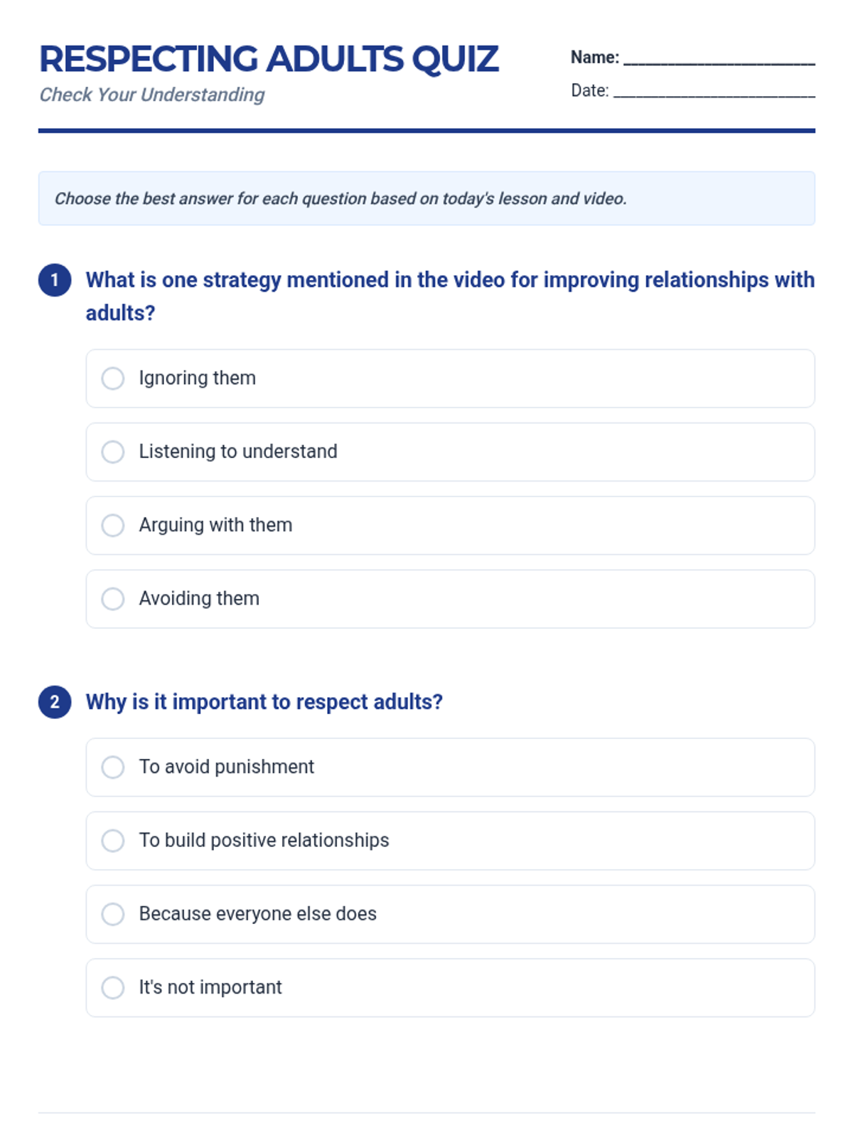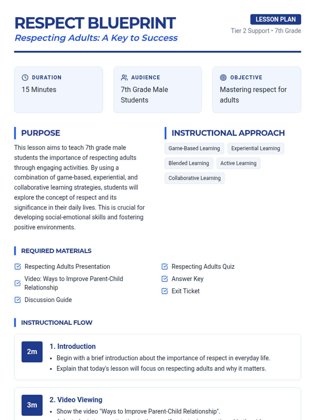 This lesson helps 7th-grade male students understand the value of respecting adults through a combination of video-based learning, guided discussion, and reflective activities. Students will explore practical strategies for building positive relationships and demonstrate their understanding through a quiz and exit ticket.