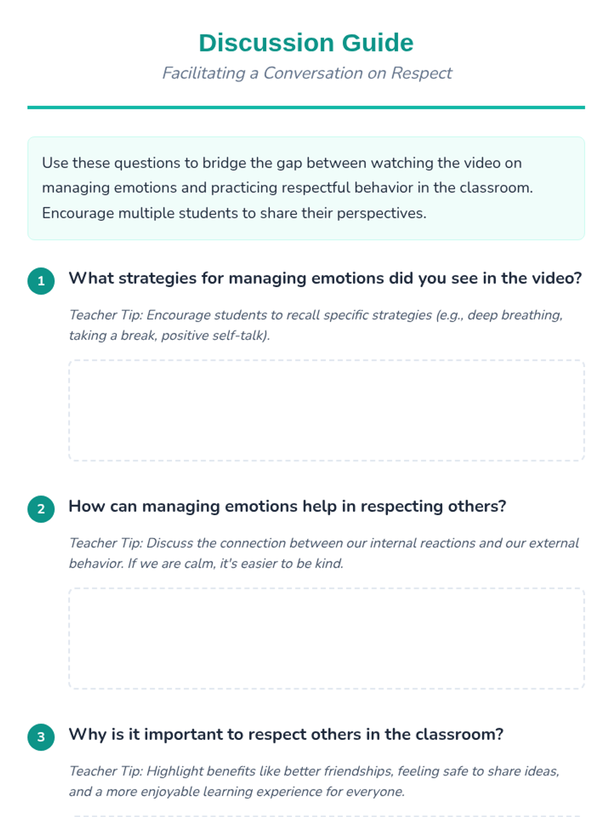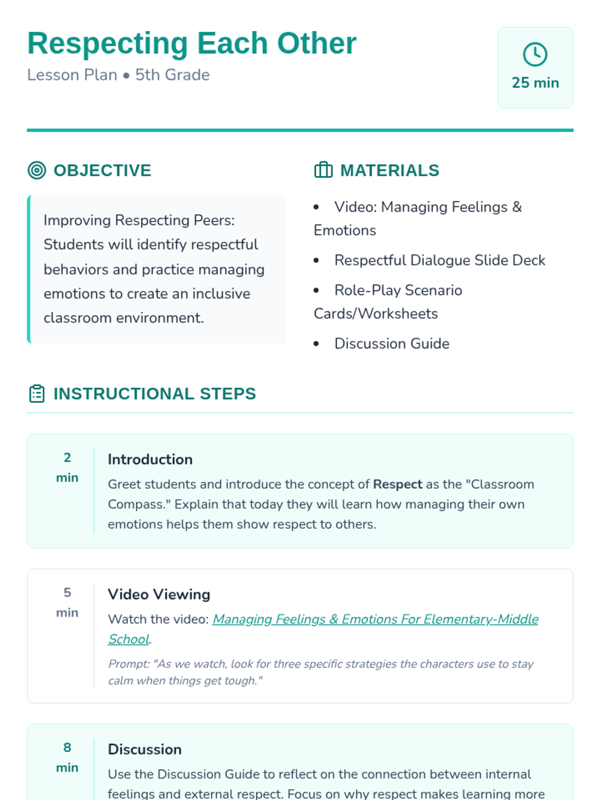 This lesson teaches 5th-grade students the importance of respecting peers through video analysis, guided discussion, and interactive role-play scenarios to foster a positive classroom culture.